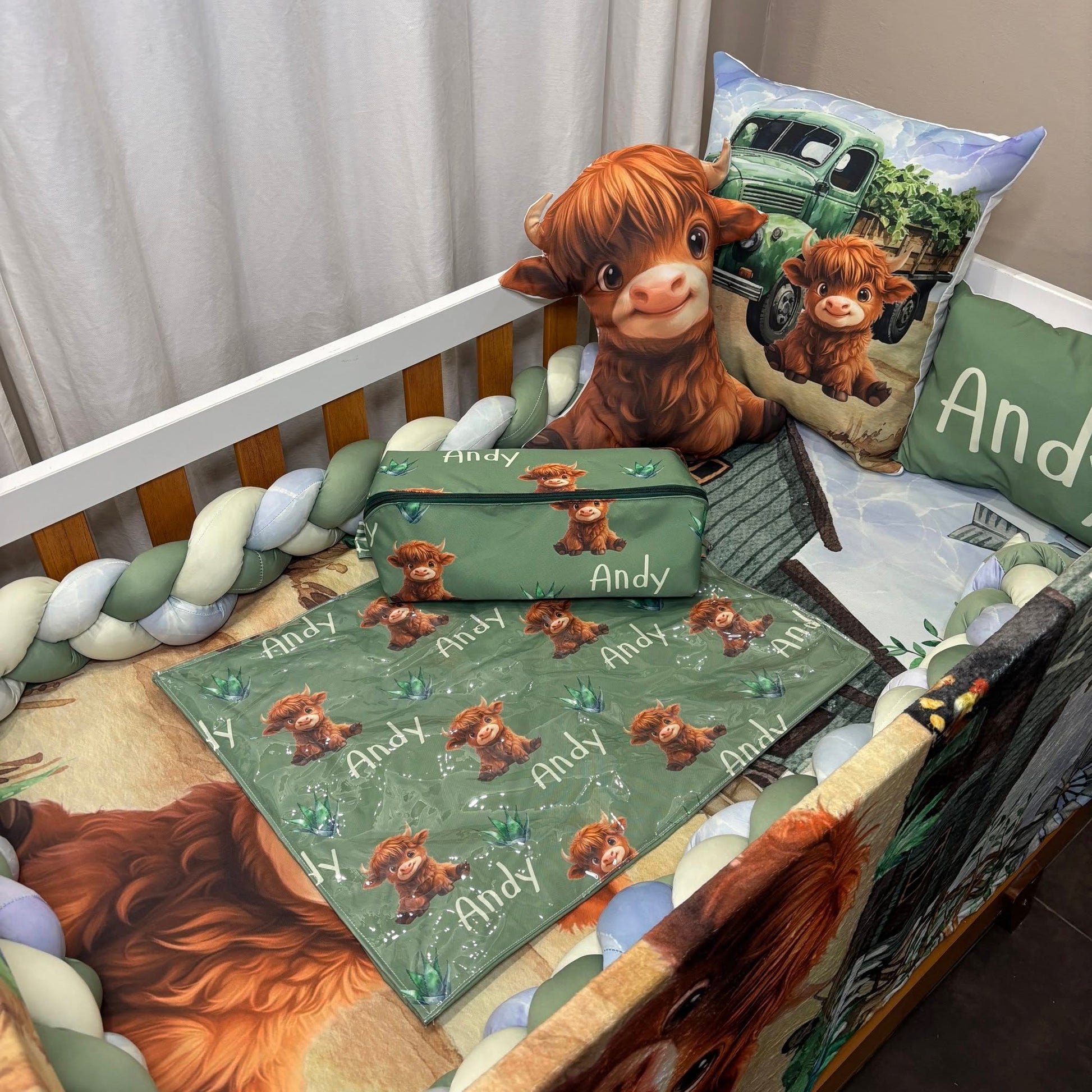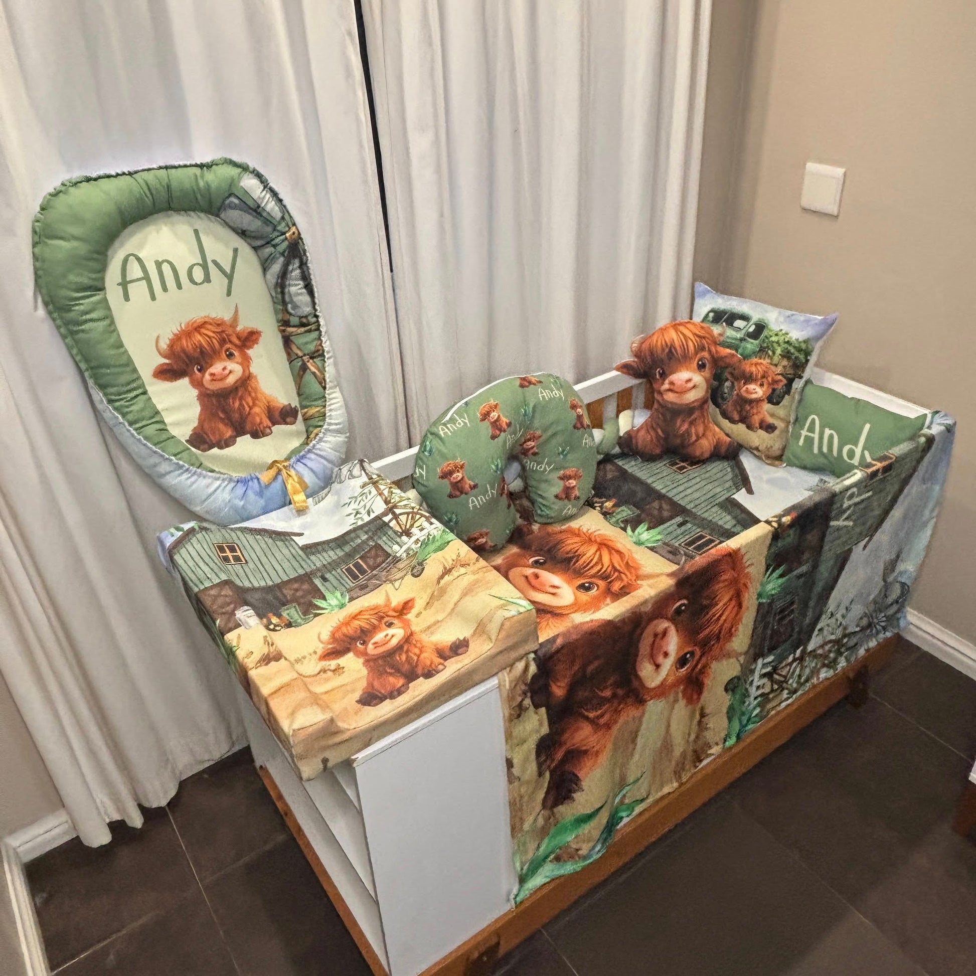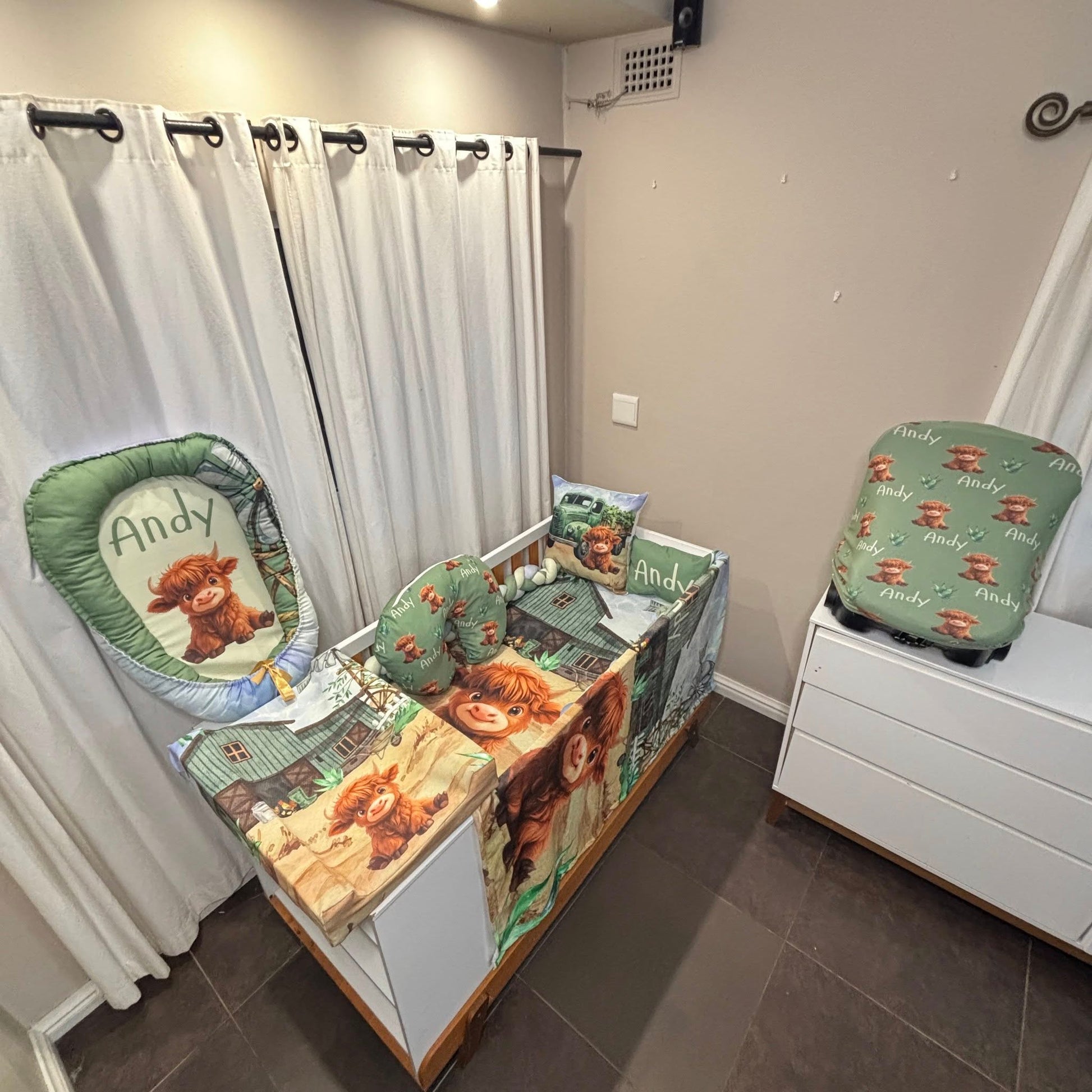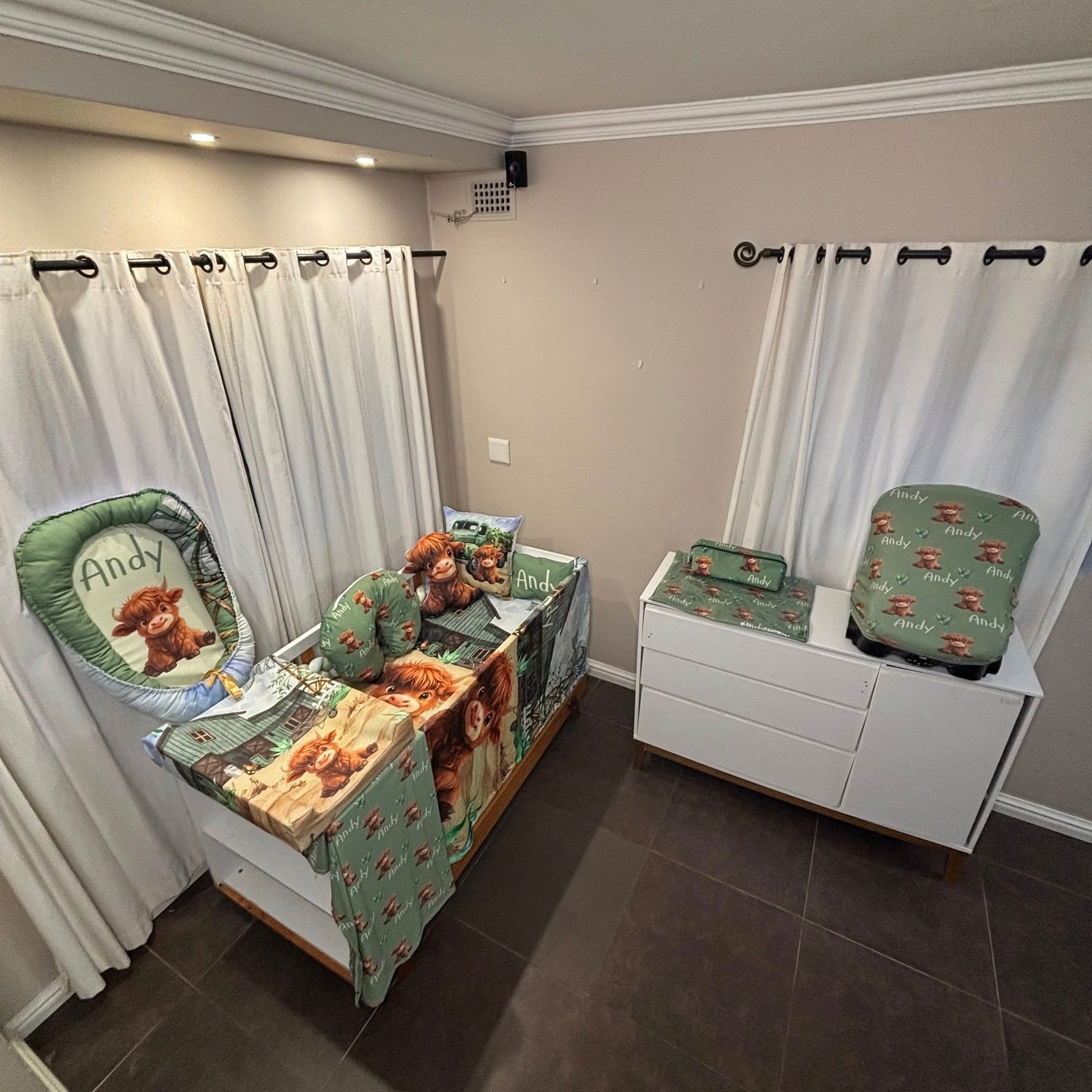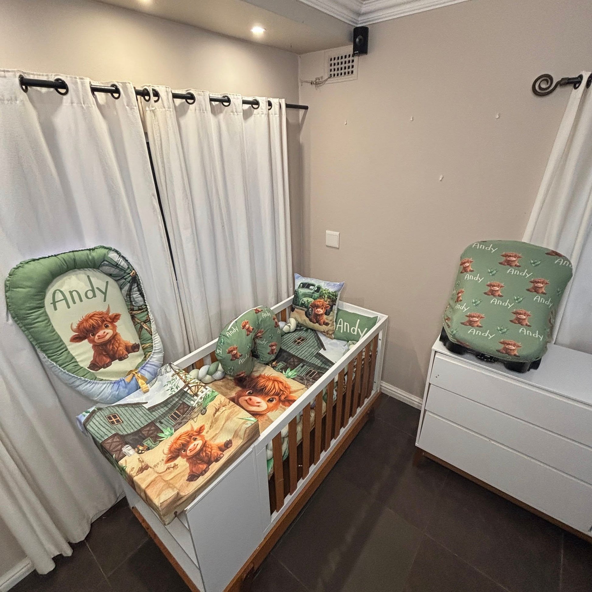 Cute and friendly this fluffy buddy is ready to put a smile on your face everytime you enter the nursery. With highland cows being a trend in nurseries this year this is just another awesome addition to stunning Highland cow nurseriesThis one had a focus on colors of sand/beige, dark sage and some lively greenery.For all your custom Nursery Sets and so much more contact us today!