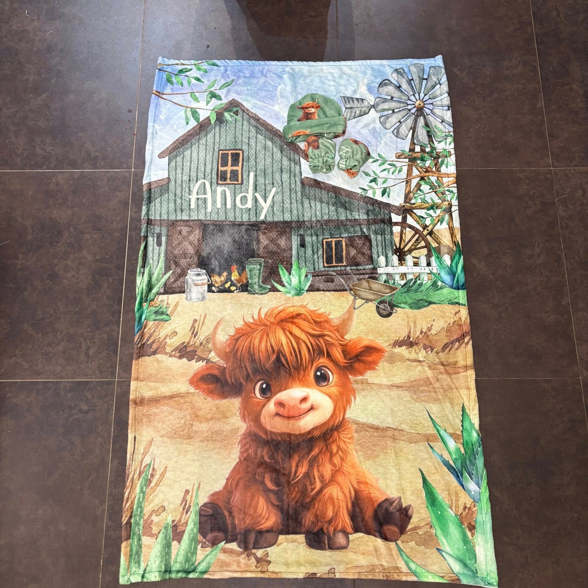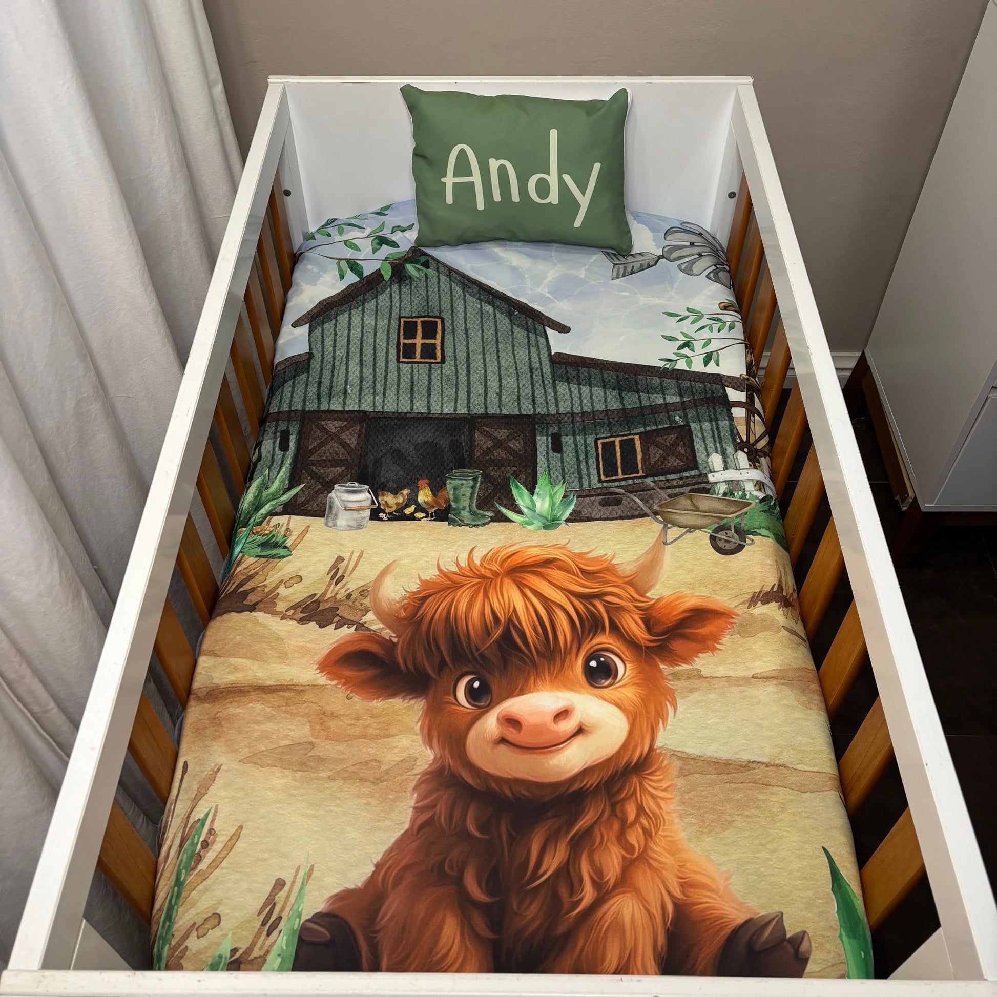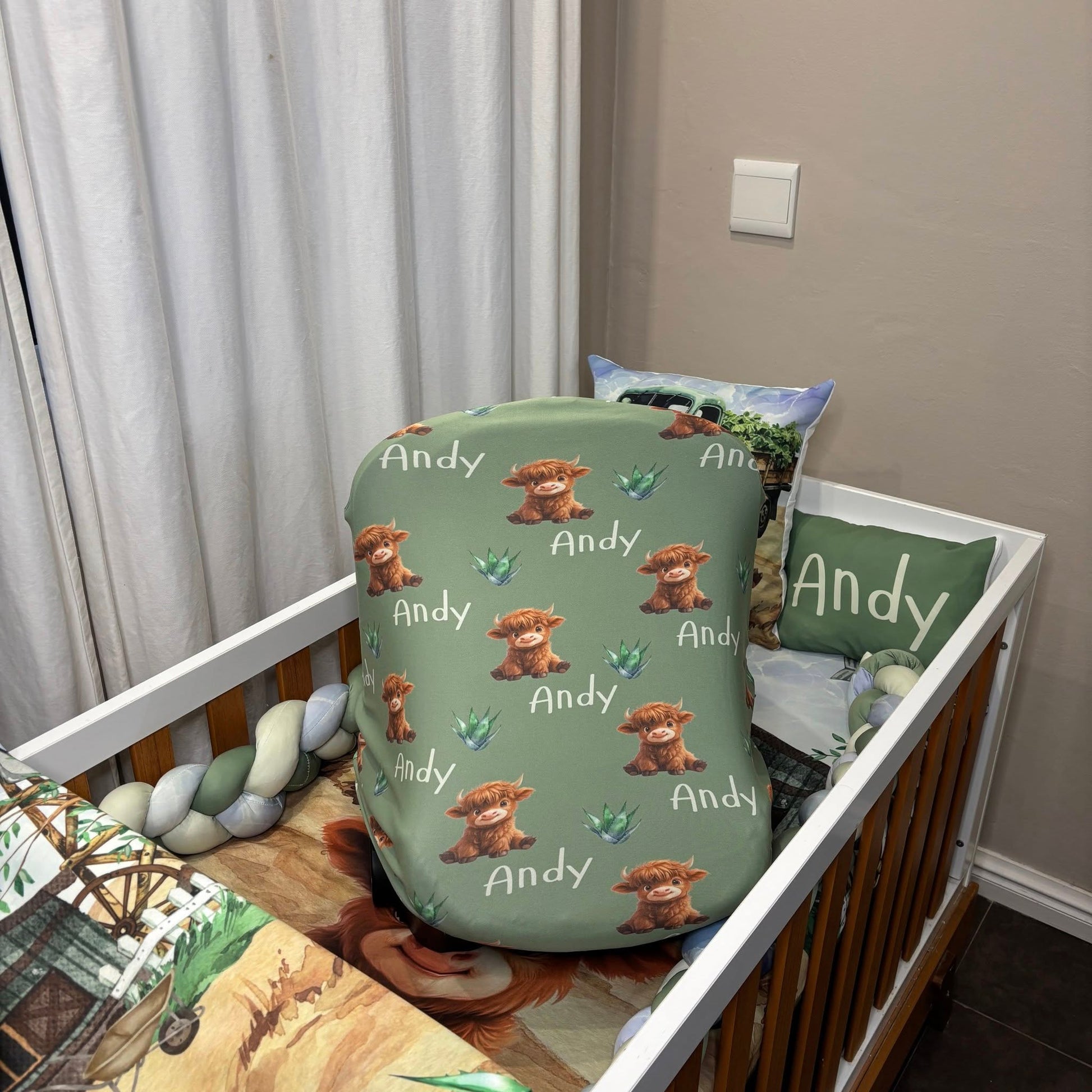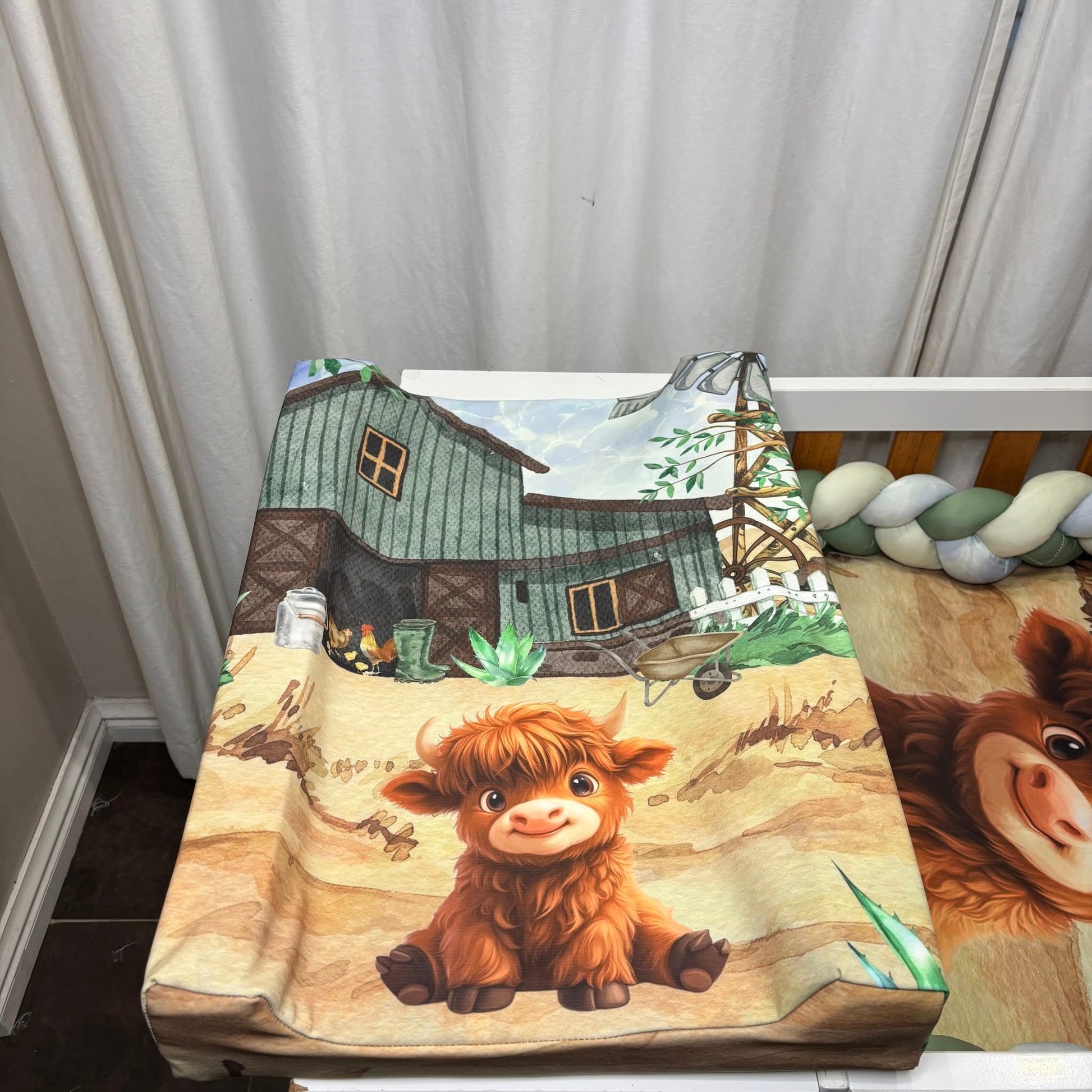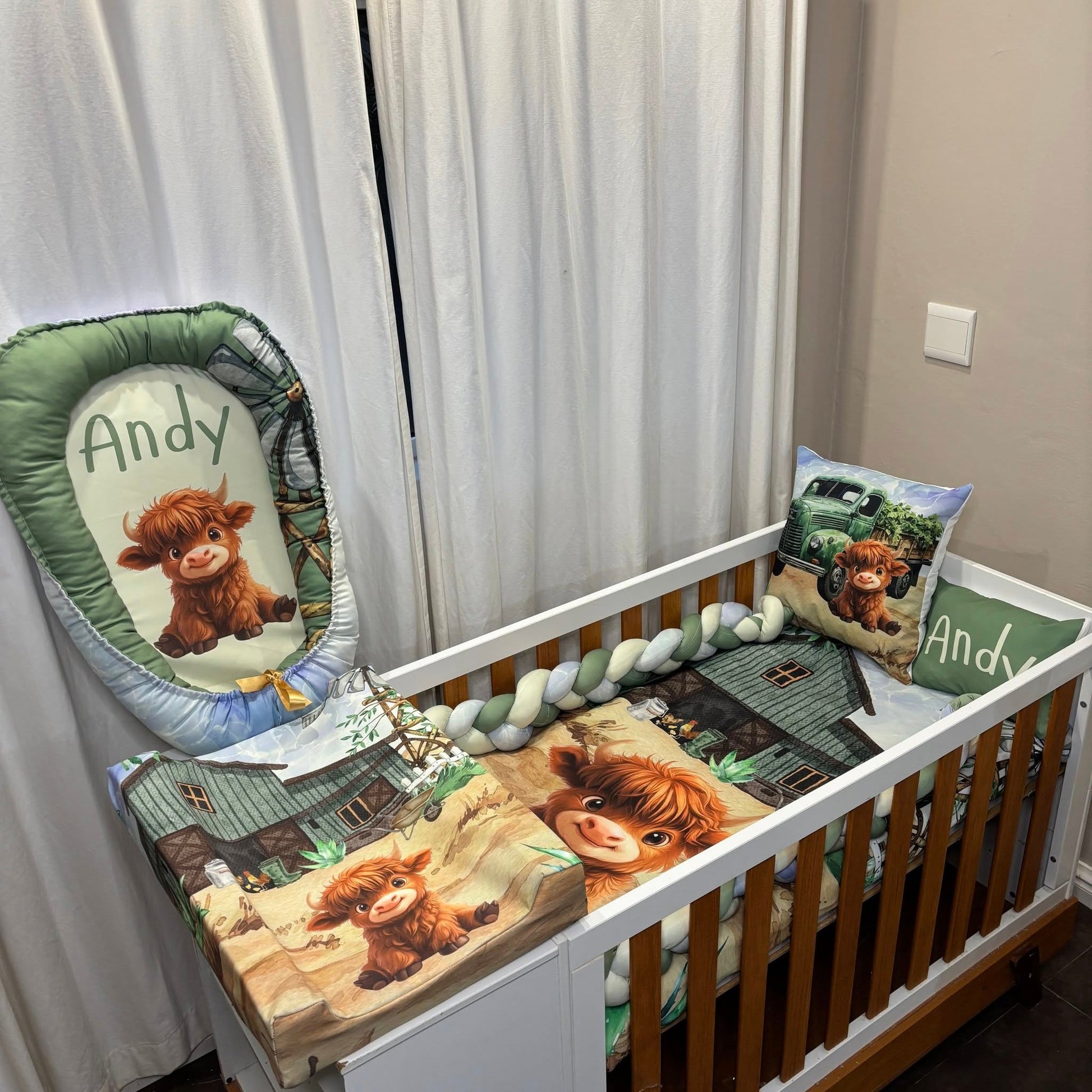 Cute and friendly this fluffy buddy is ready to put a smile on your face everytime you enter the nursery. With highland cows being a trend in nurseries this year this is just another awesome addition to stunning Highland cow nurseriesThis one had a focus on colors of sand/beige, dark sage and some lively greenery.For all your custom Nursery Sets and so much more contact us today!