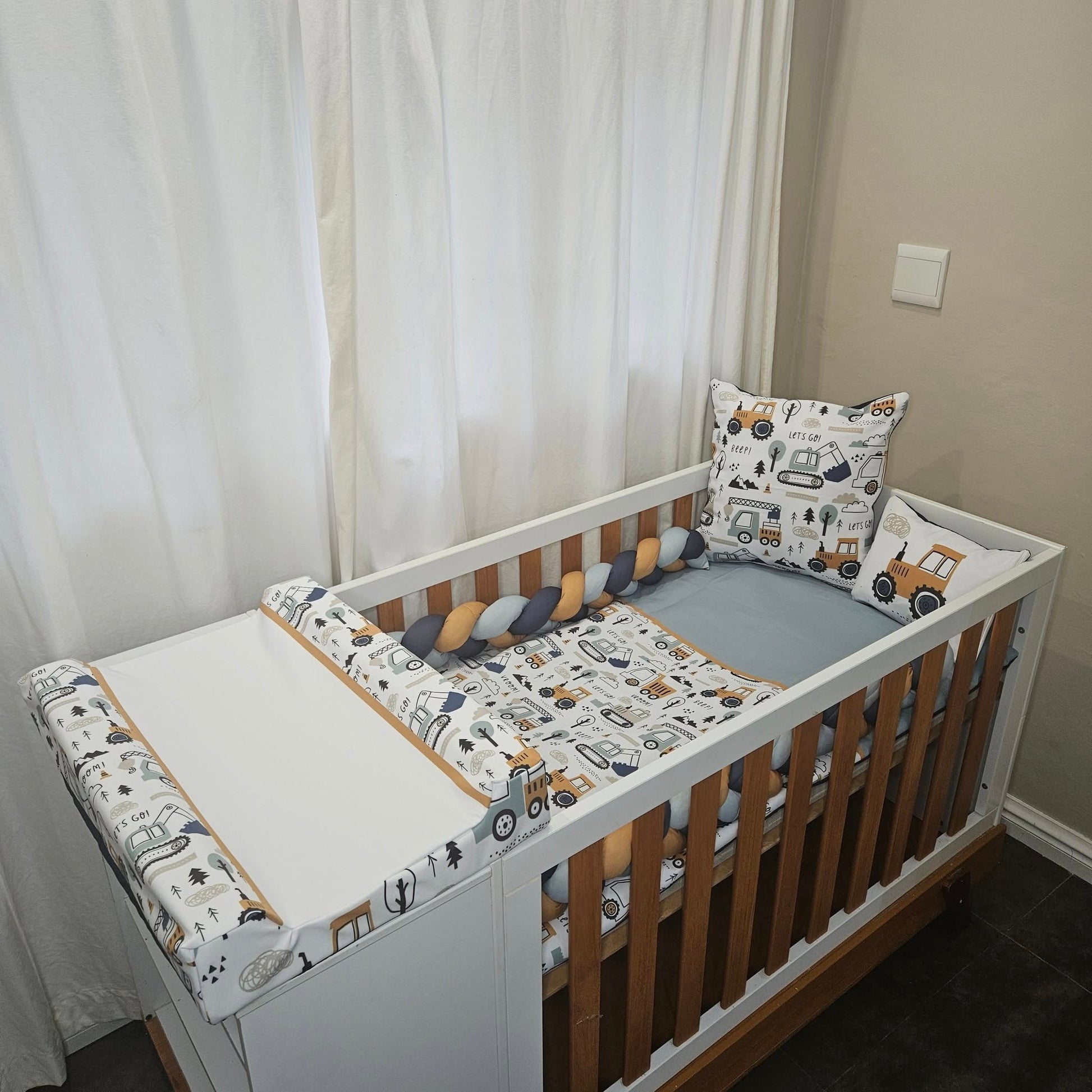 Baby Blue and Mustard Construction cot linen