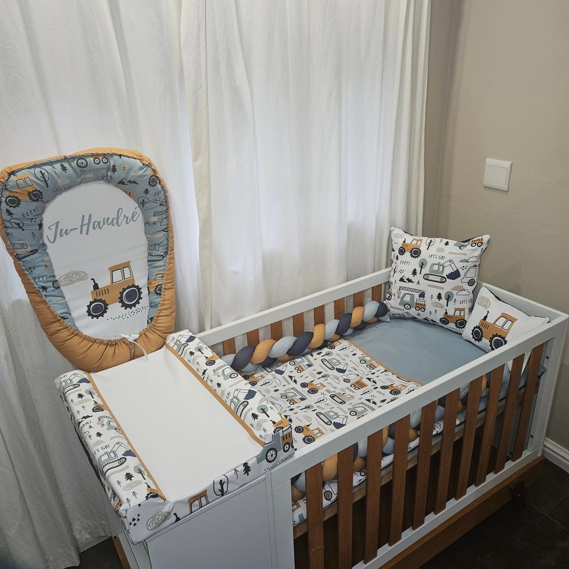 Duvet cover & Inner, or Comforter, Baby Pillow & Inner, Scatter & Inner, Baby nest, Waterproof Changing mat Cover & Inner, 3 M Bumper and a Fitted sheet to fit cot
