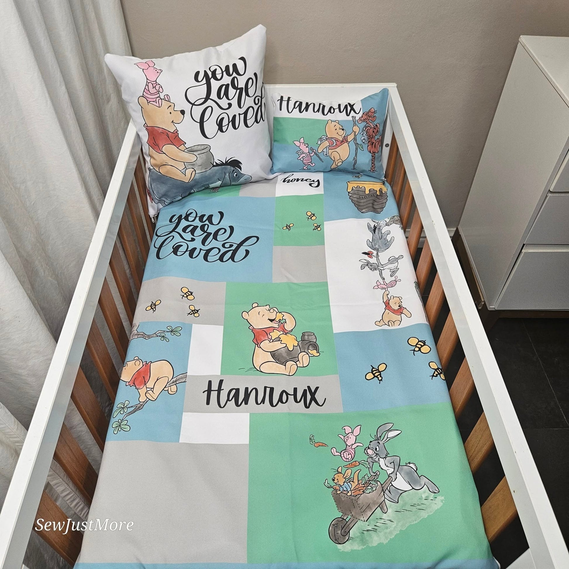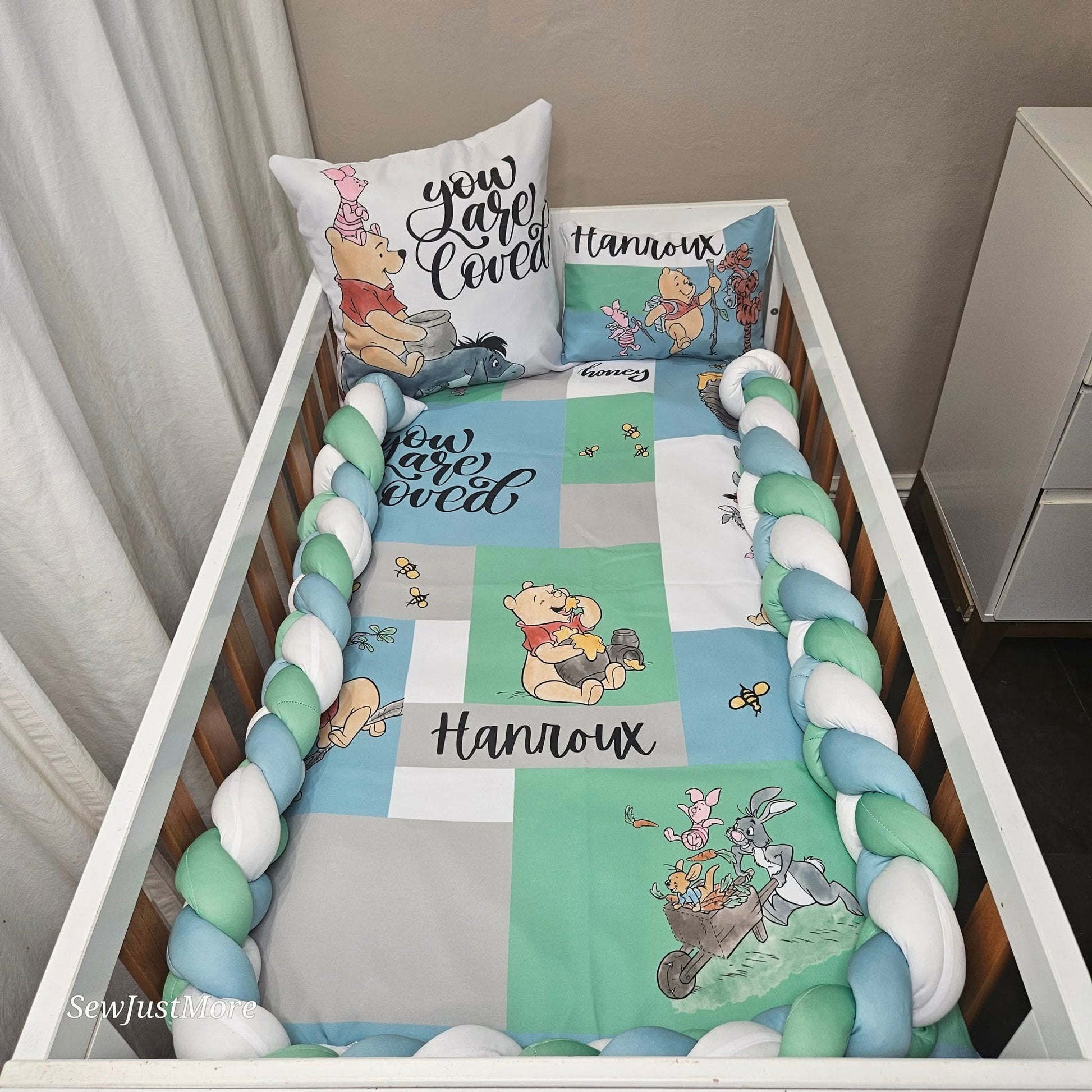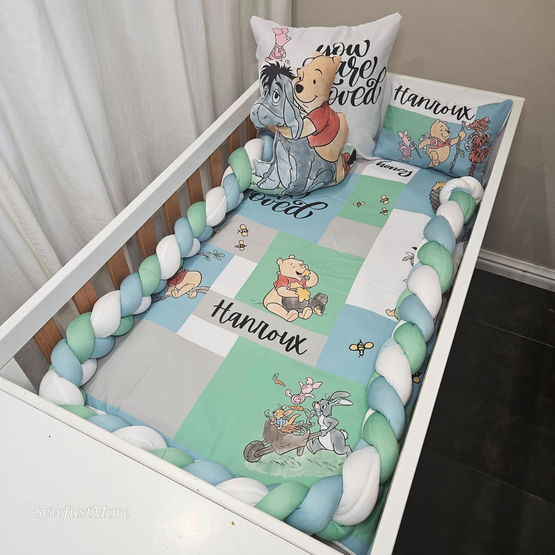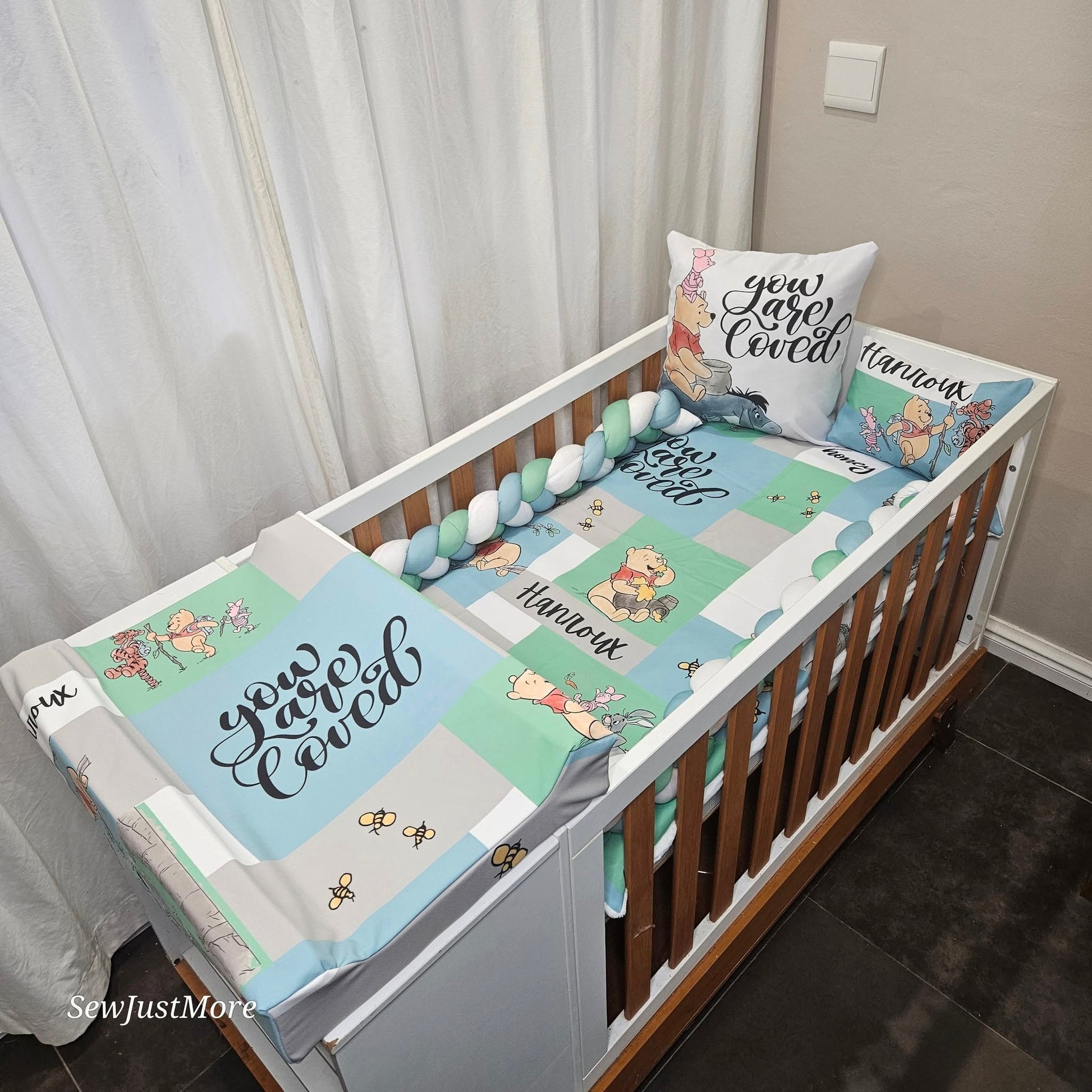 Duvet cover & Inner, or Comforter, Baby Pillow & Inner, Scatter & Inner, Waterproof Changing Mat Cover & Changing Mat Inner, 3 M Bumper and a Fitted sheet to fit cot