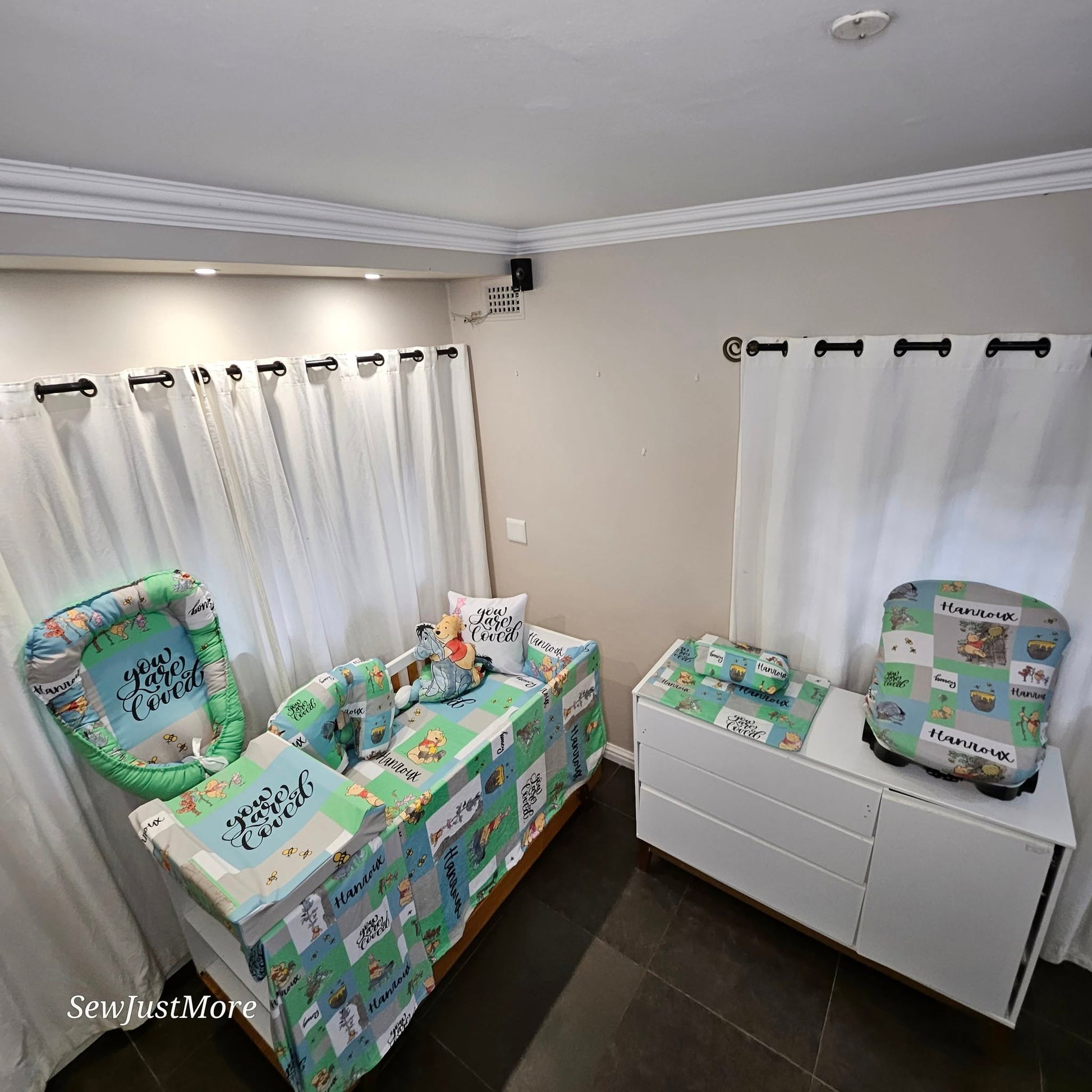 Duvet cover & Inner, or Comforter, Baby Pillow & Inner, Scatter & Inner,3 m Bumper, Carry Cot, Waterproof Changing mat Cover & Inner, Play Gym, Play Doughnut, 3 x 3 A Canvas, Hanging Diaper Bag, Cot Mobile and a Fitted sheet to fit cot