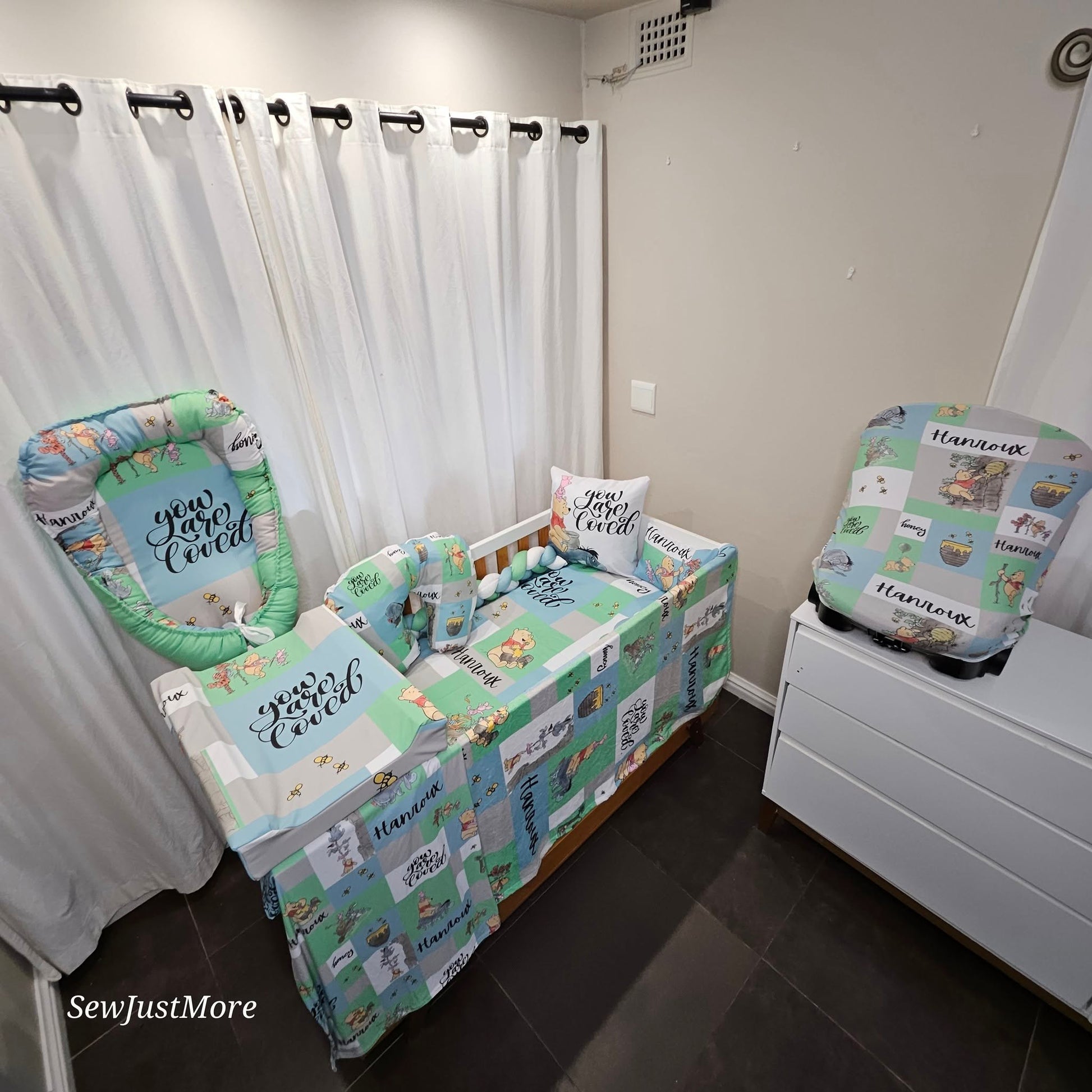 Duvet cover & Inner, or Comforter, Baby Pillow & Inner, Scatter & Inner, Baby nest, Waterproof Changing mat Cover & Inner, 3 M Bumper and a Fitted sheet to fit cot