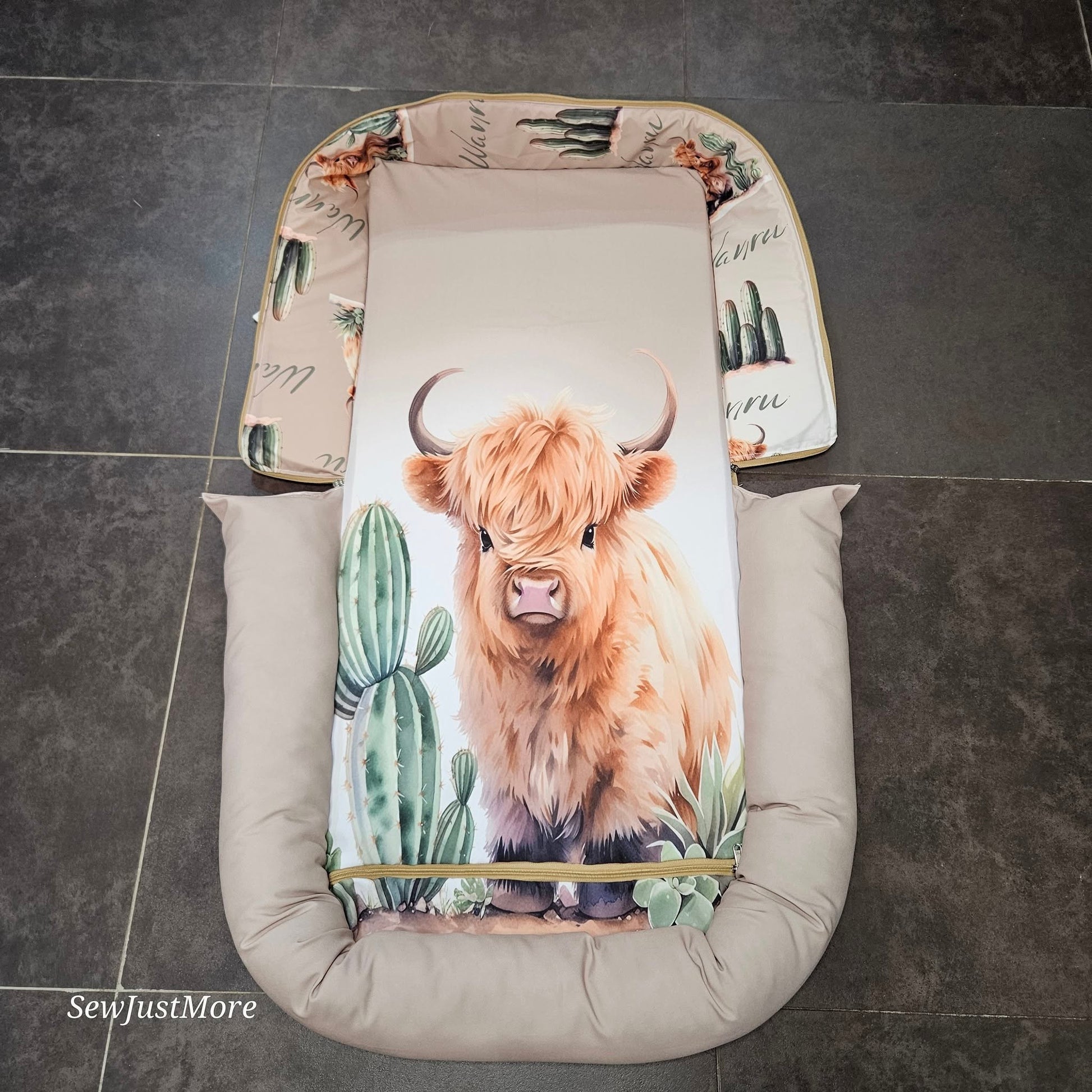 This idea has been in development for months and finally we can show it! A fully custom printed travel baby nest that serves as a bag as well!