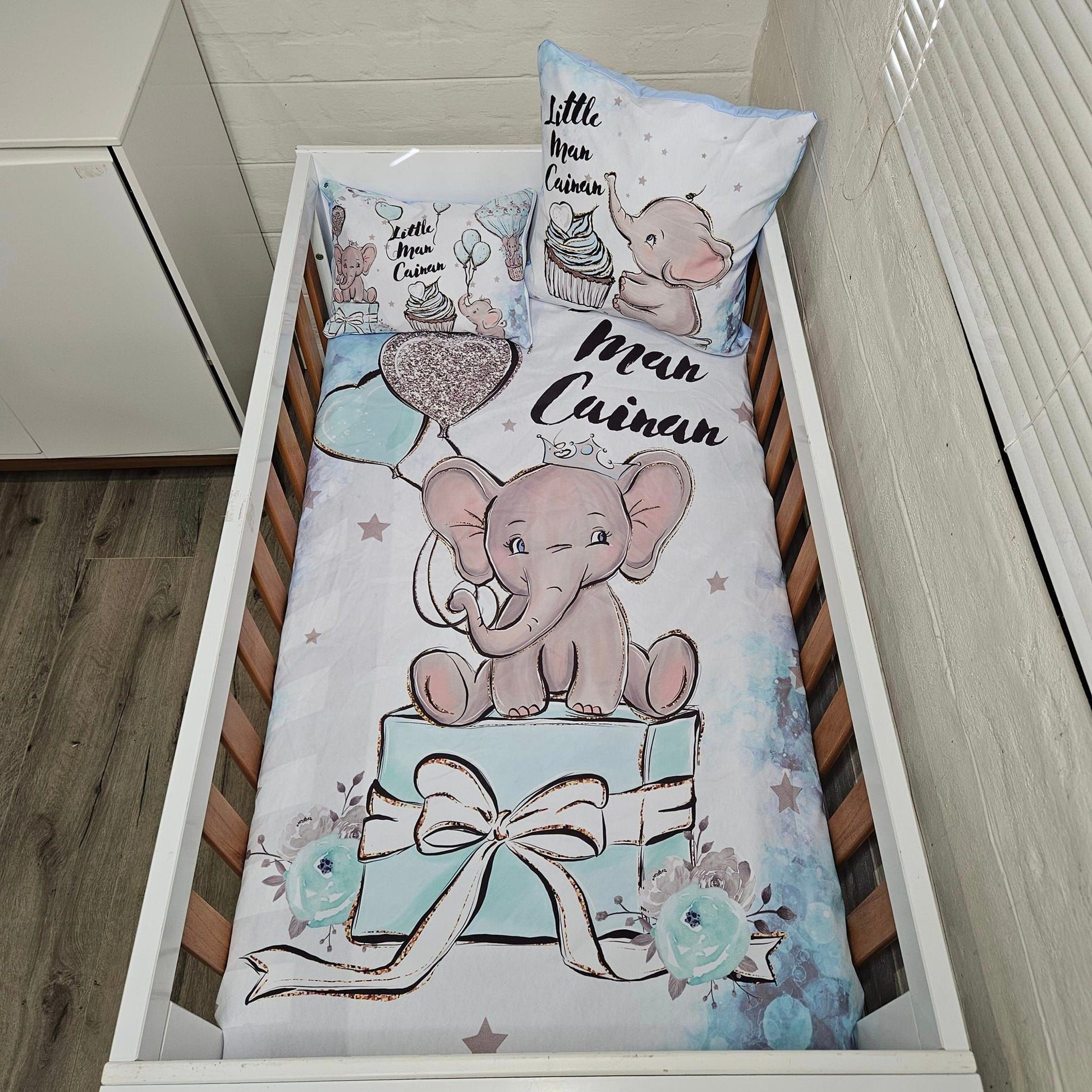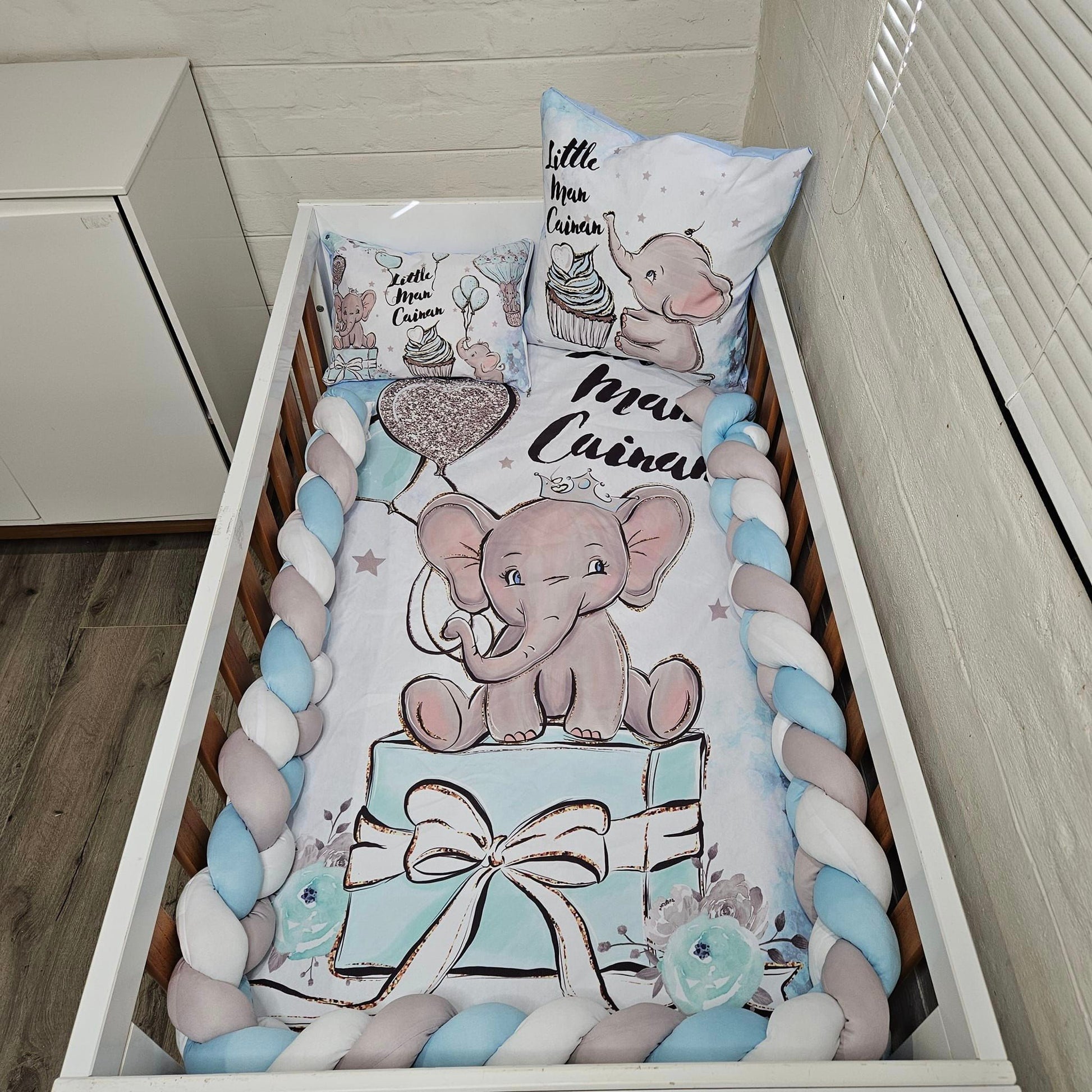 Duvet cover & Inner, or Comforter, Baby Pillow & Inner, Scatter & Inner, Waterproof Changing Mat Cover & Changing Mat Inner, 3 M Bumper and a Fitted sheet to fit cot