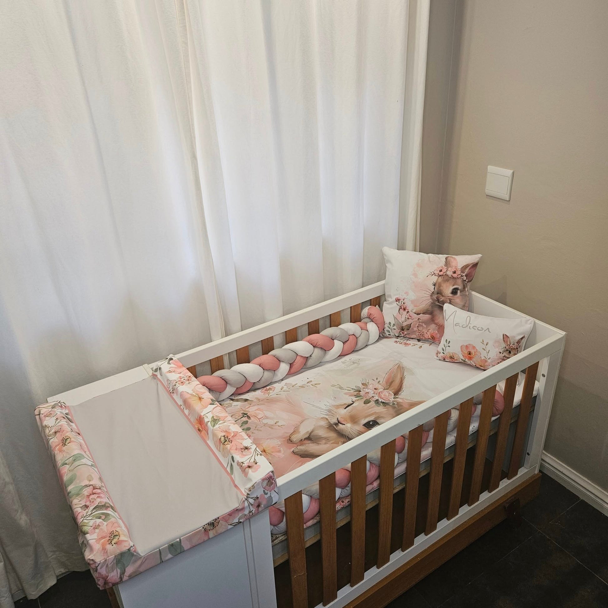 Duvet cover & Inner, or Comforter, Baby Pillow & Inner, Scatter & Inner, Waterproof Changing Mat Cover & Changing Mat Inner, 3 M Bumper and a Fitted sheet to fit cot
