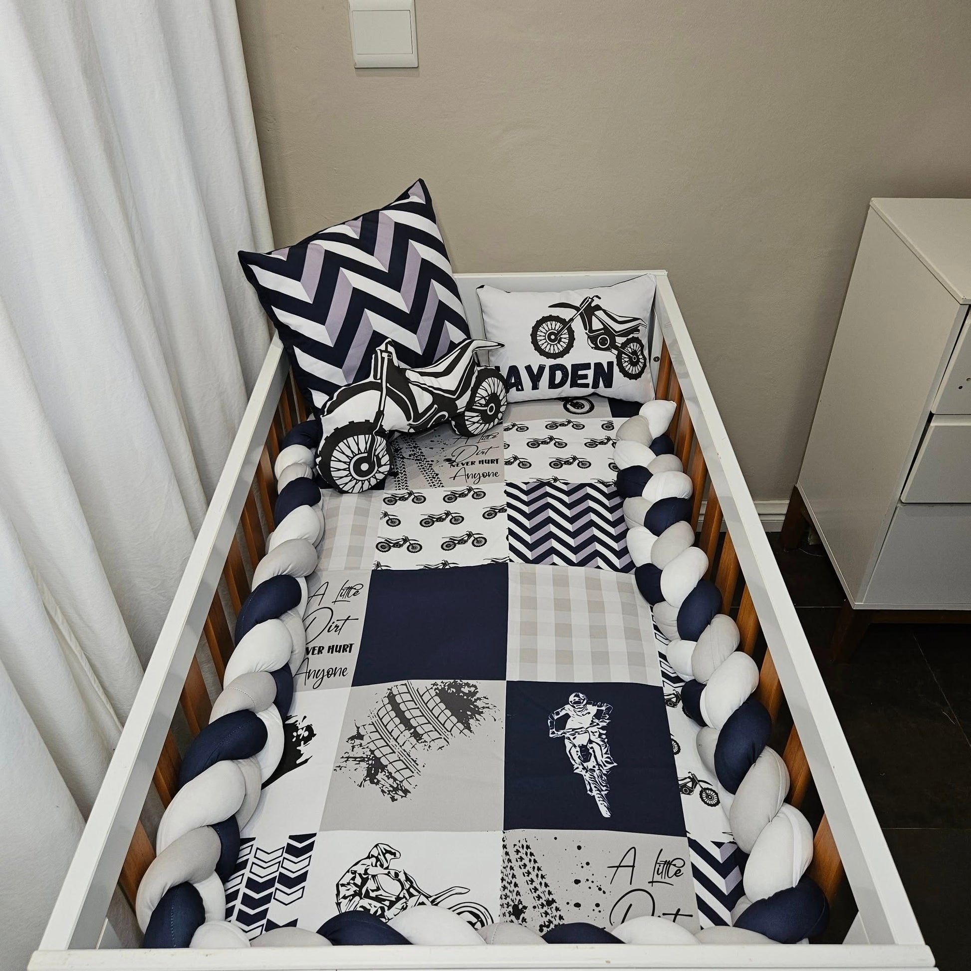 Duvet cover & Inner, or Comforter, Baby Pillow & Inner, Scatter & Inner, Waterproof Changing Mat Cover & Changing Mat Inner, 3 M Bumper and a Fitted sheet to fit cot