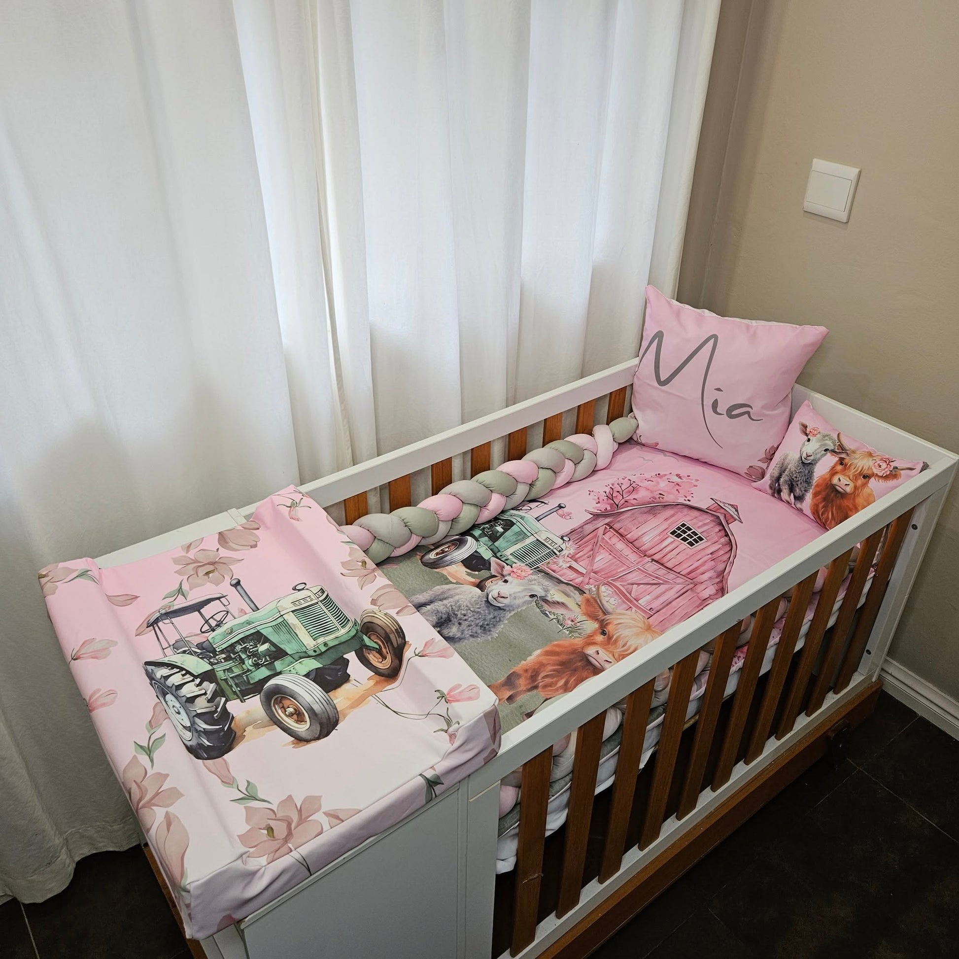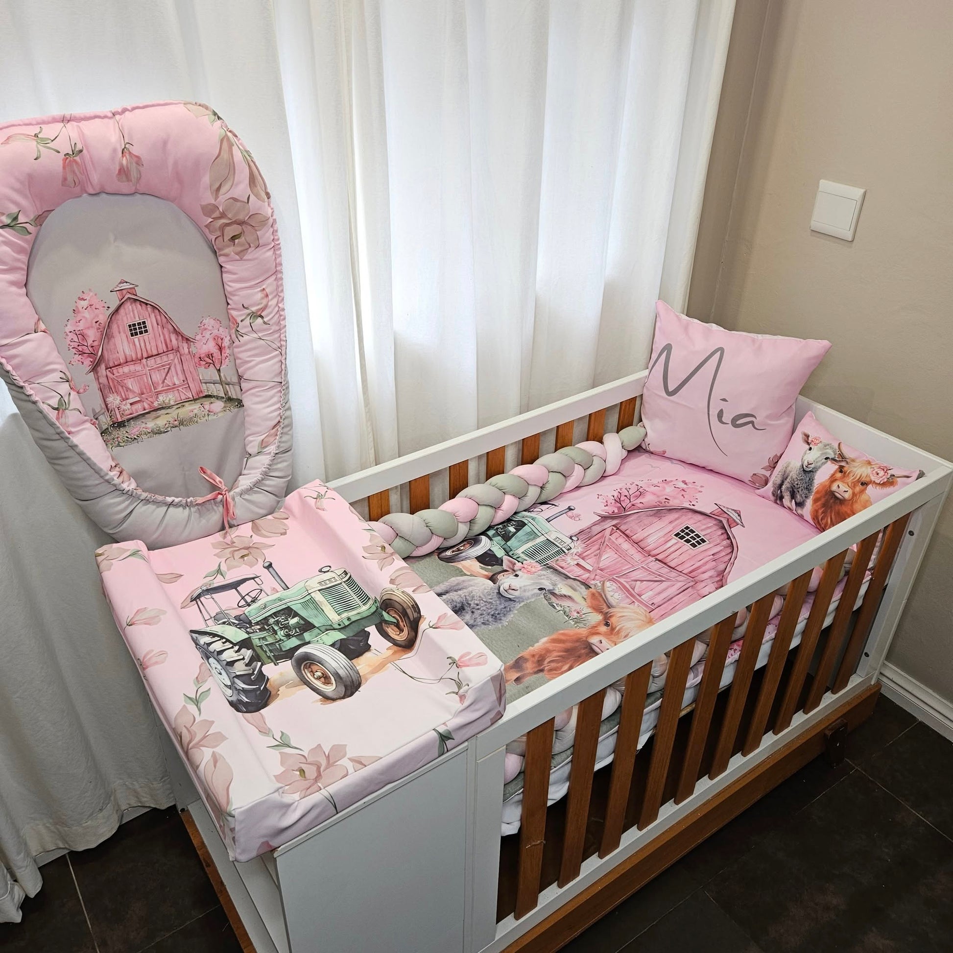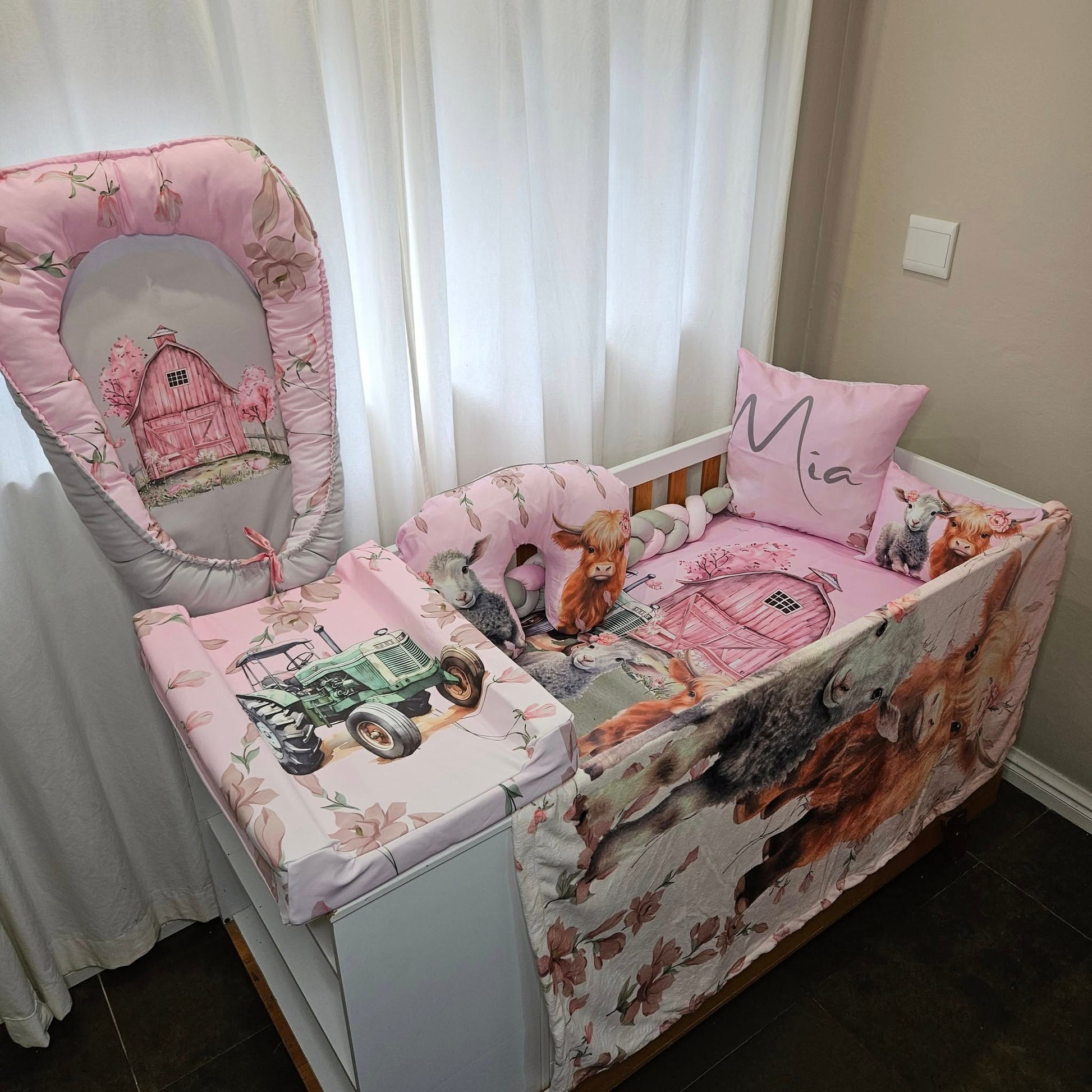 Who said that pink isn't beautiful? Check out this farm life inspired set for a girl with soft pinks and and everything beautiful to add that girly touch but still have that adventurous farm life character.It's beautiful, unique and so inspiring!For all your custom Nursery Sets and so much more contact us today!