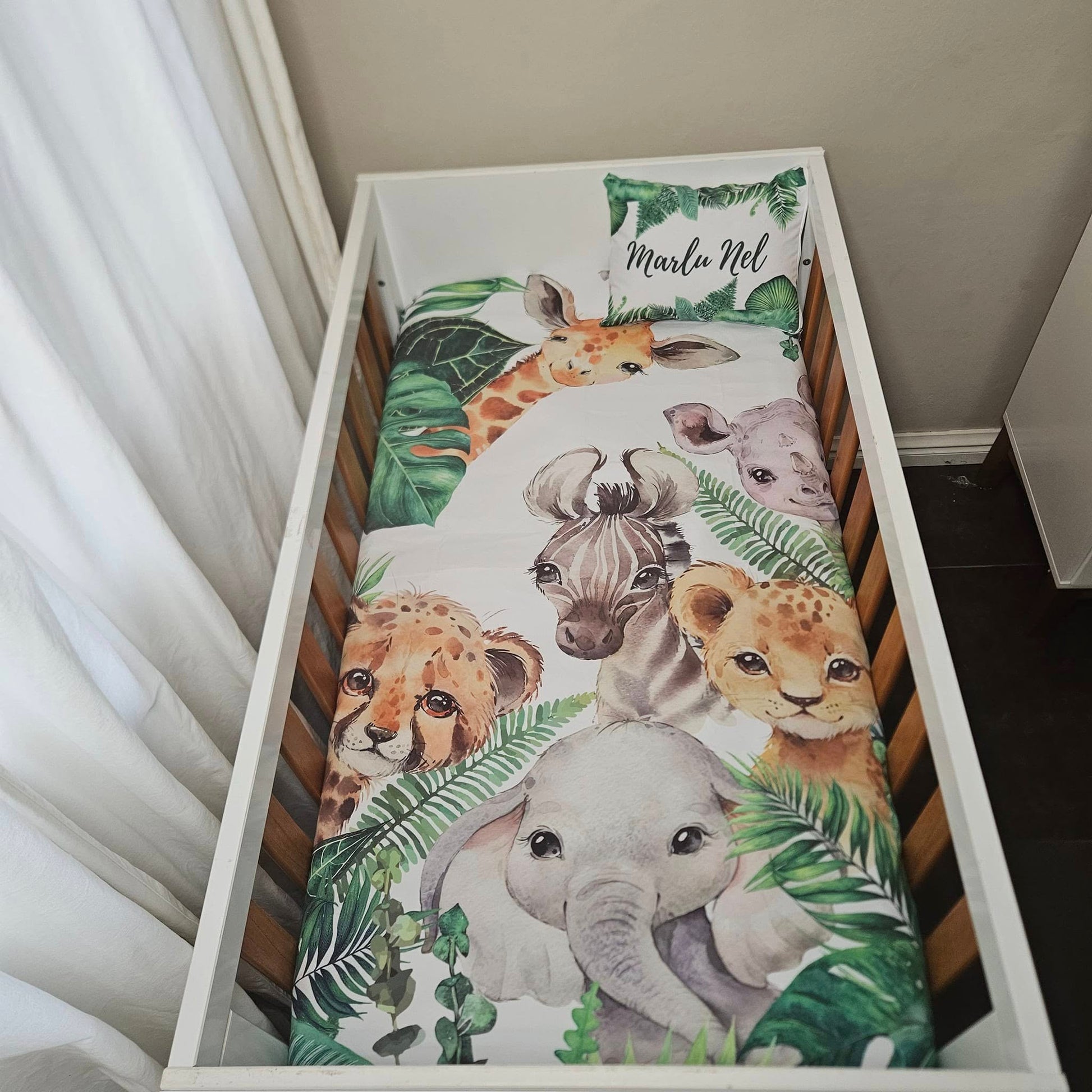 Duvet cover & Inner, or Comforter, Baby Pillow & Inner, Scatter & Inner, Waterproof Changing Mat Cover & Changing Mat Inner, 3 M Bumper and a Fitted sheet to fit cot