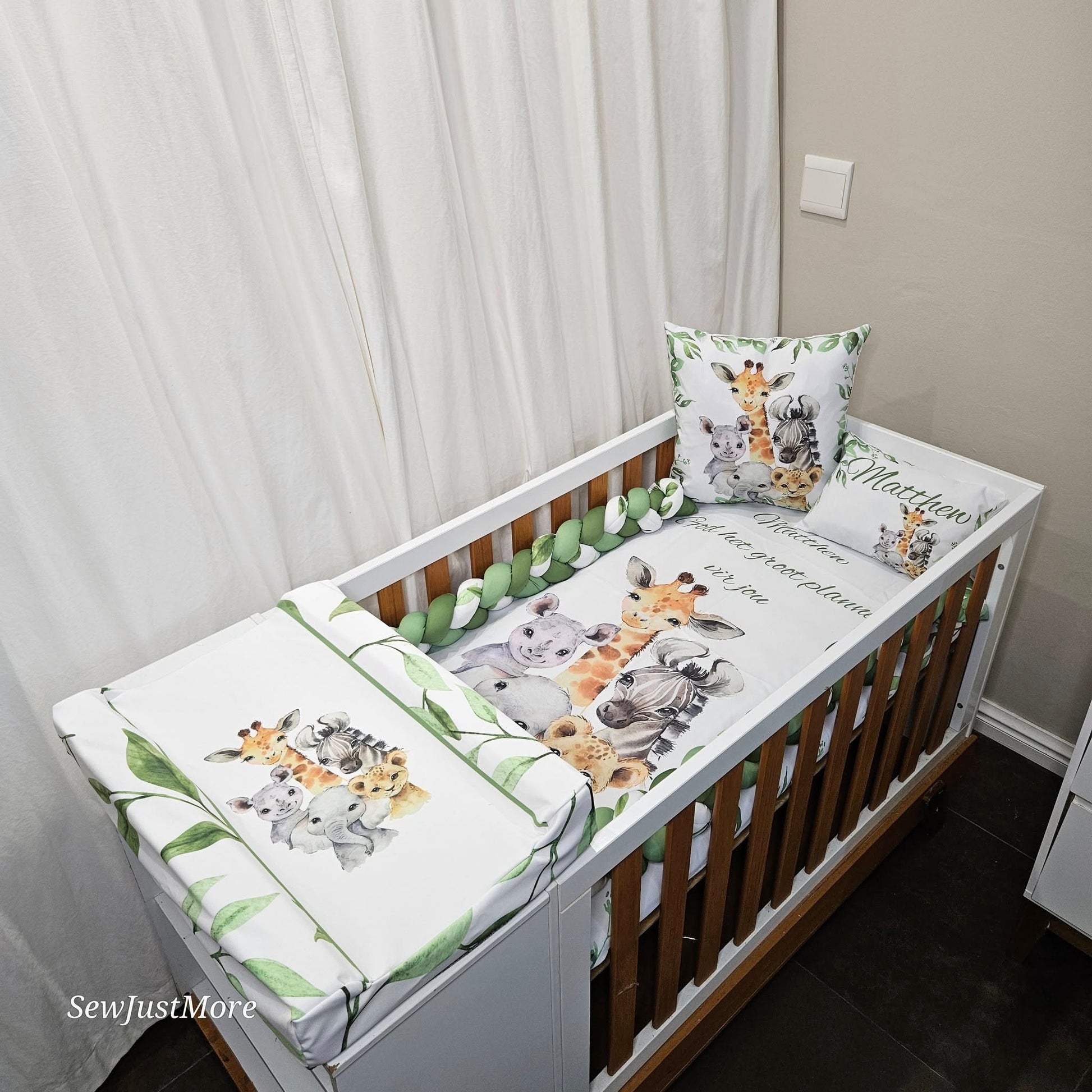 Duvet cover & Inner, or Comforter, Baby Pillow & Inner, Scatter & Inner, Waterproof Changing Mat Cover & Changing Mat Inner, 3 M Bumper and a Fitted sheet to fit cot