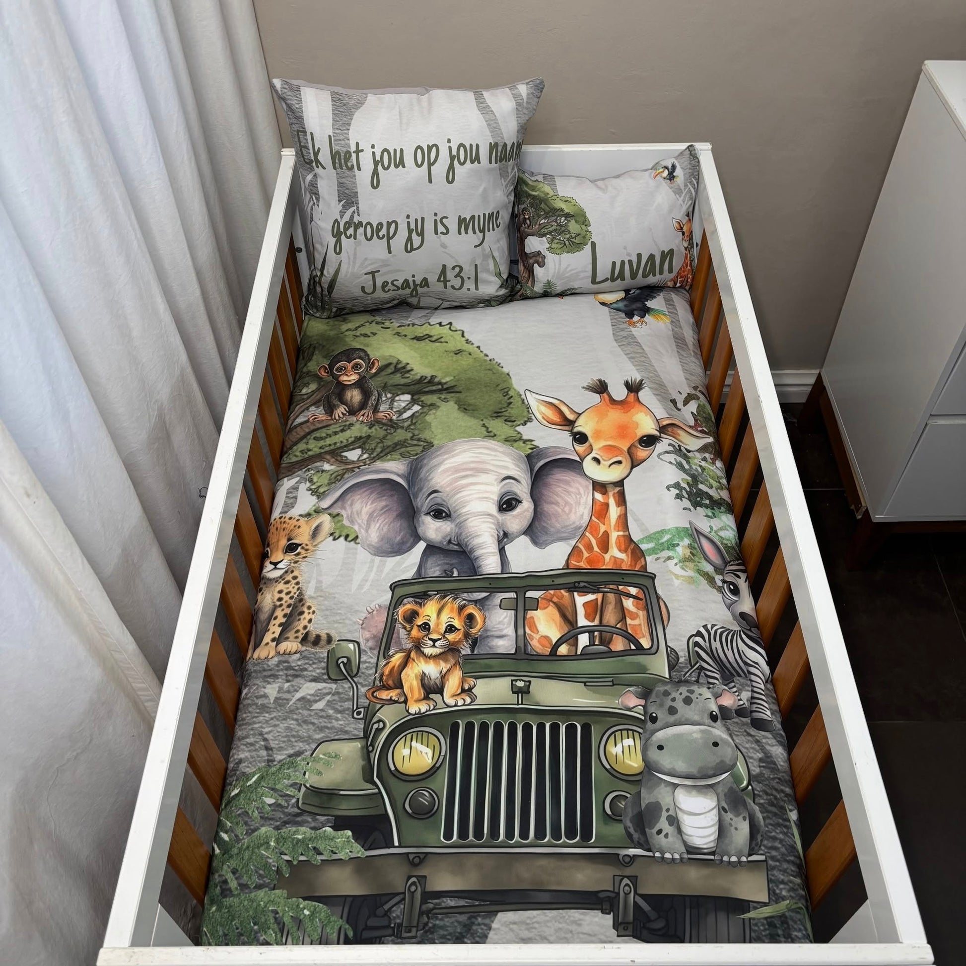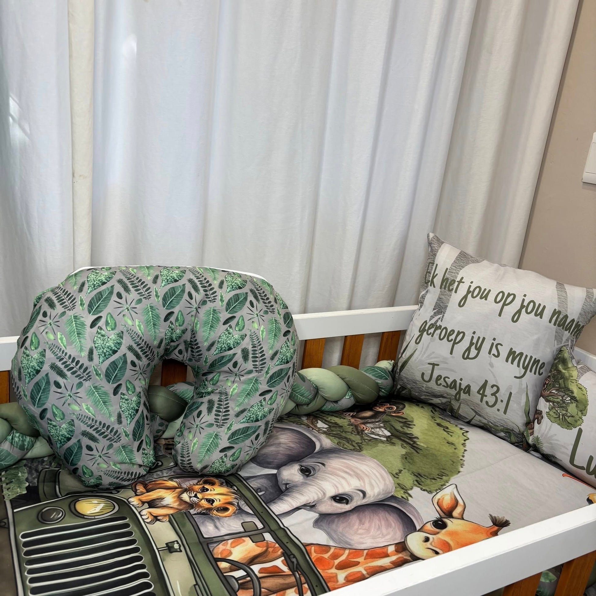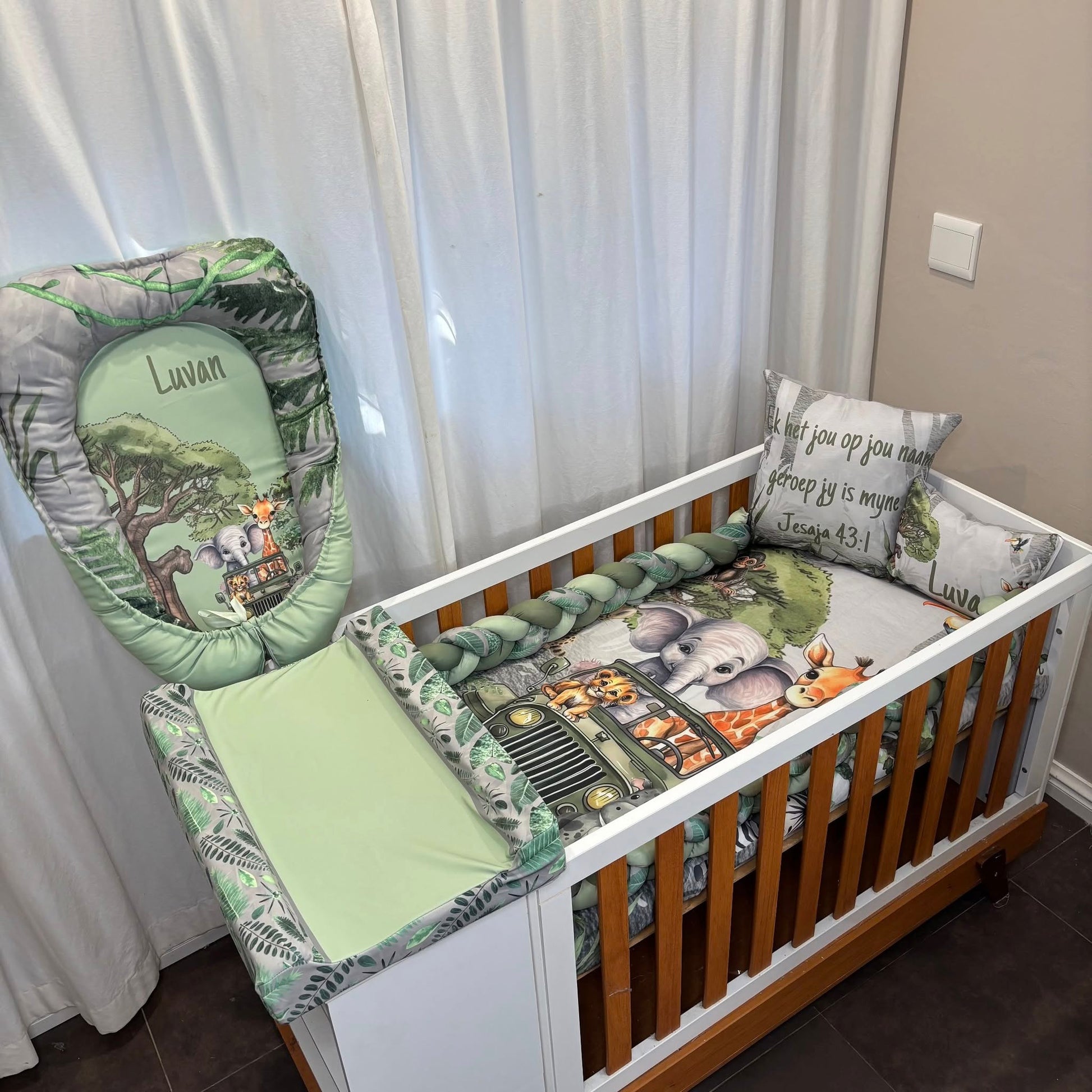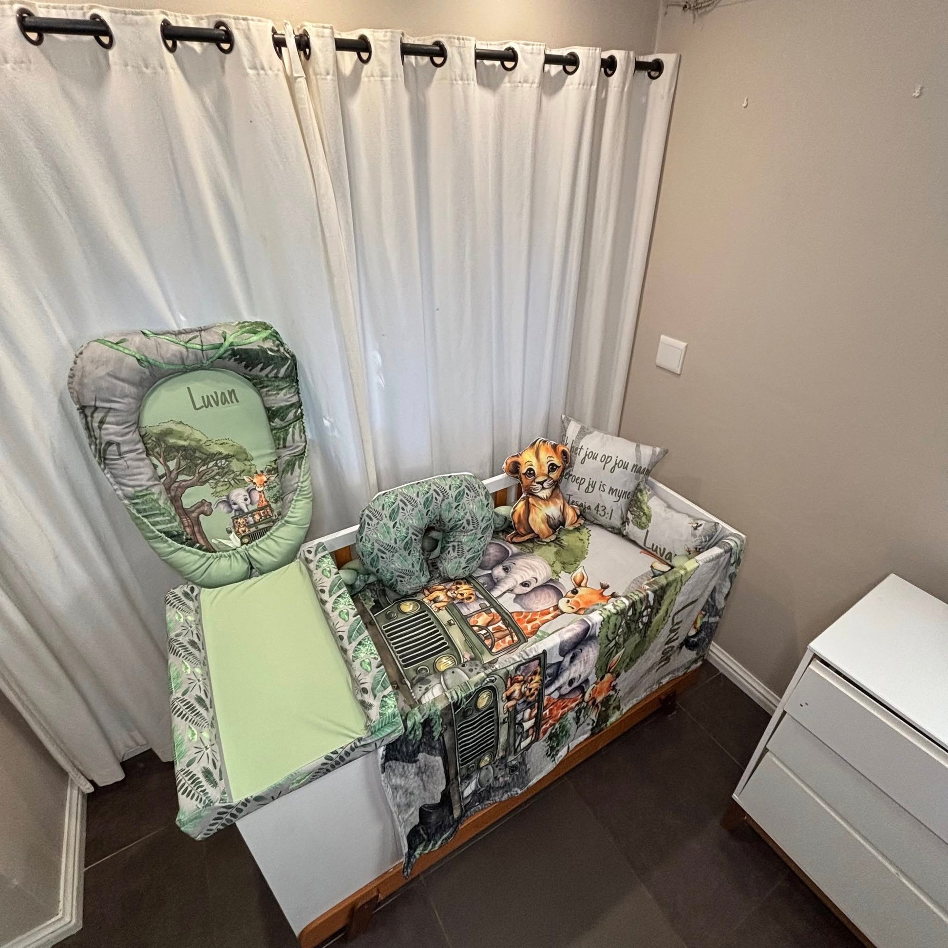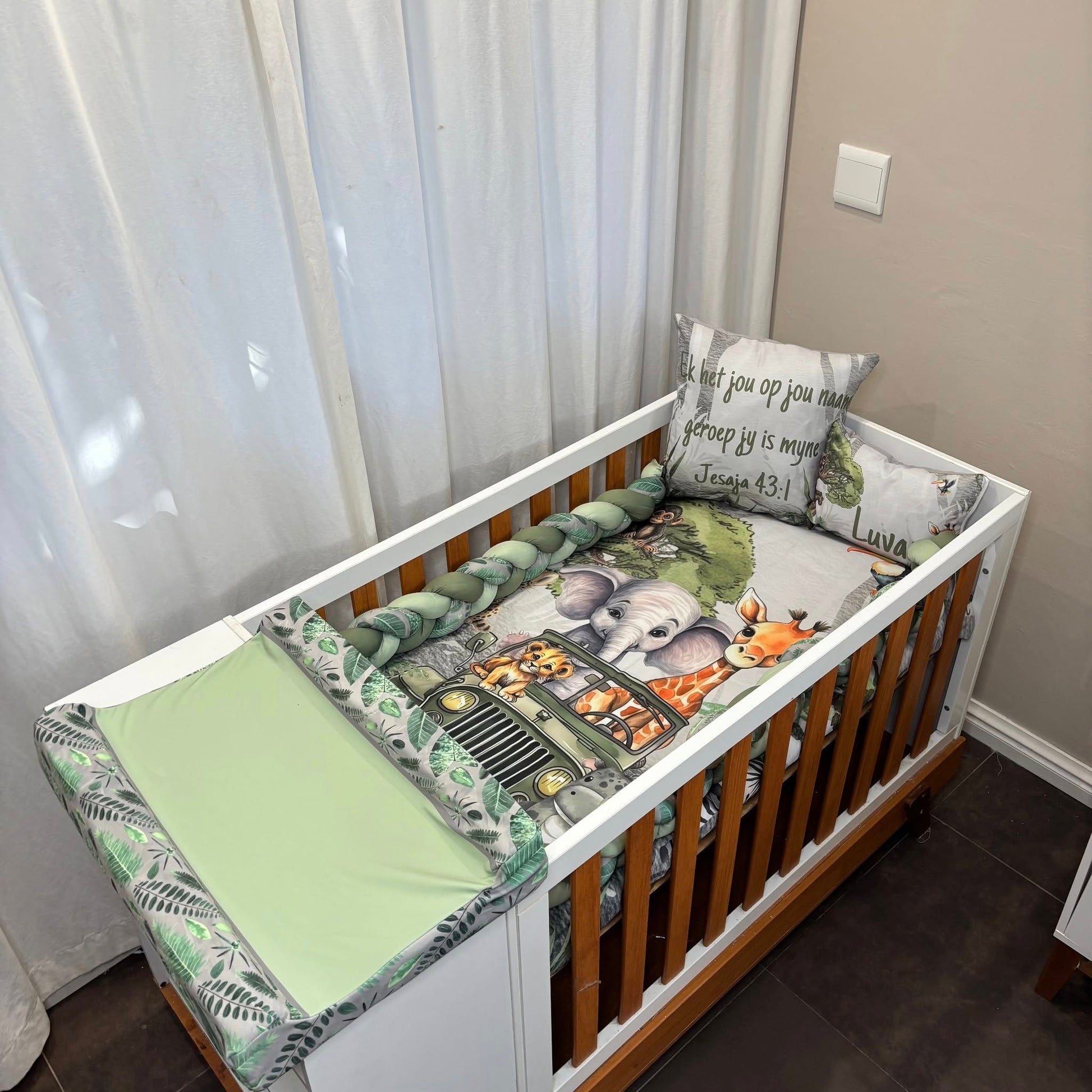 Duvet cover & Inner, or Comforter, Baby Pillow & Inner, Scatter & Inner, Waterproof Changing Mat Cover & Changing Mat Inner, 3 M Bumper and a Fitted sheet to fit cot
