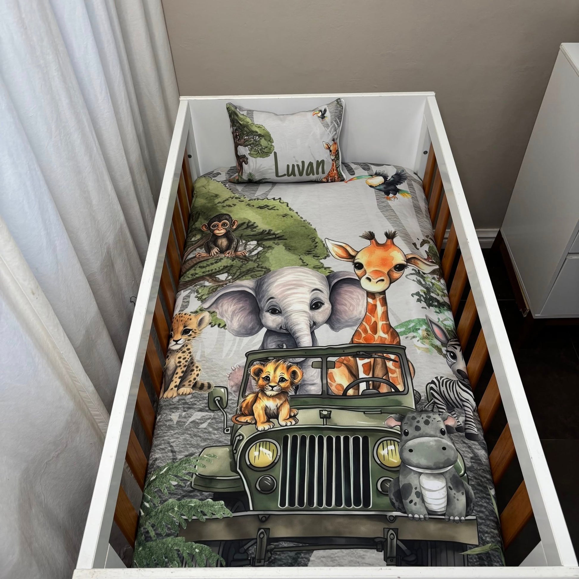 An adventure awaits! Super adorable safari babies exploring the jungle in their jeep. The perfect nursery set for any boy and with so much detail to offer, this theme will transform any room into the ultimate jungle exploring adventure.The inspiration you can get from this theme can be limitless and can't wait to see what it inspires next!