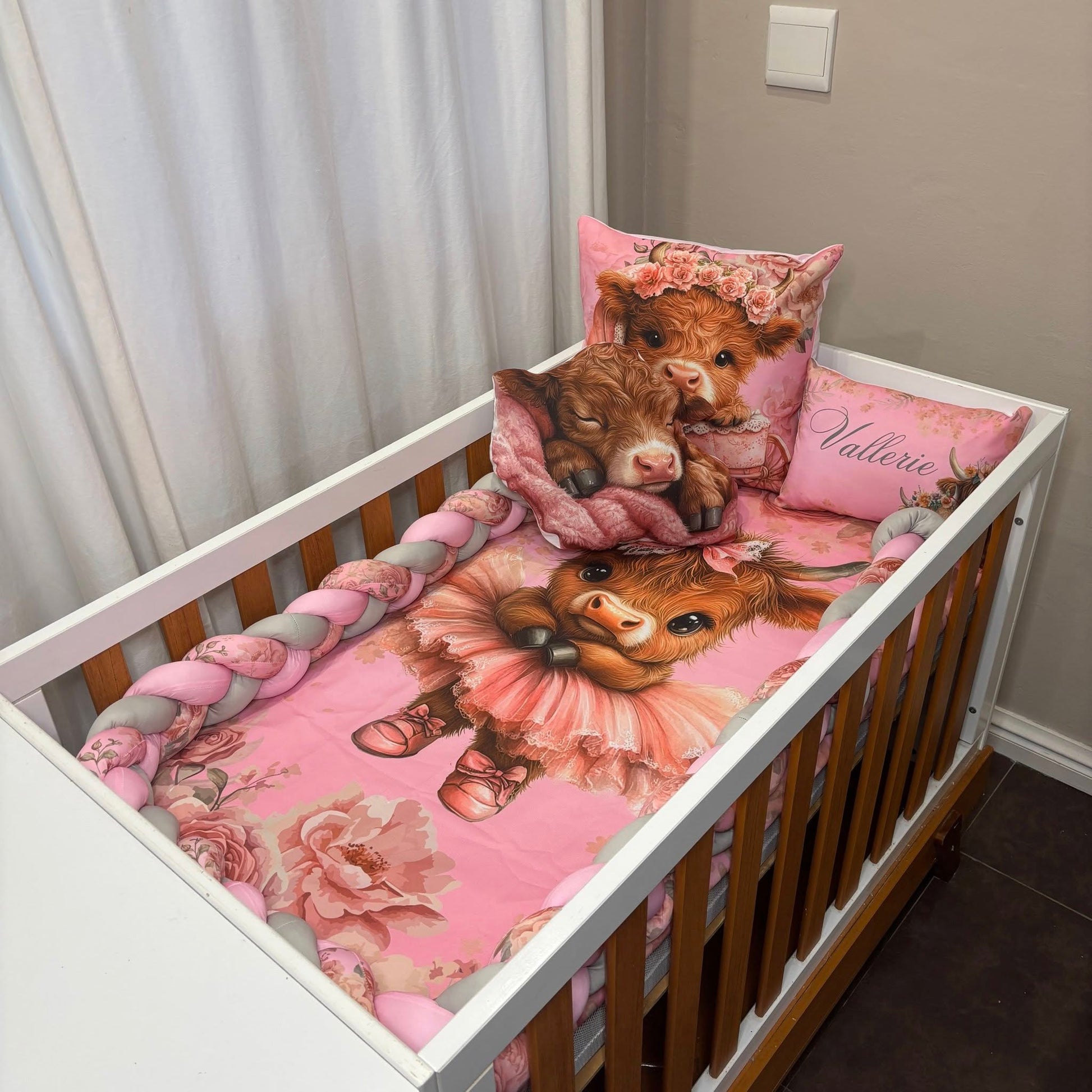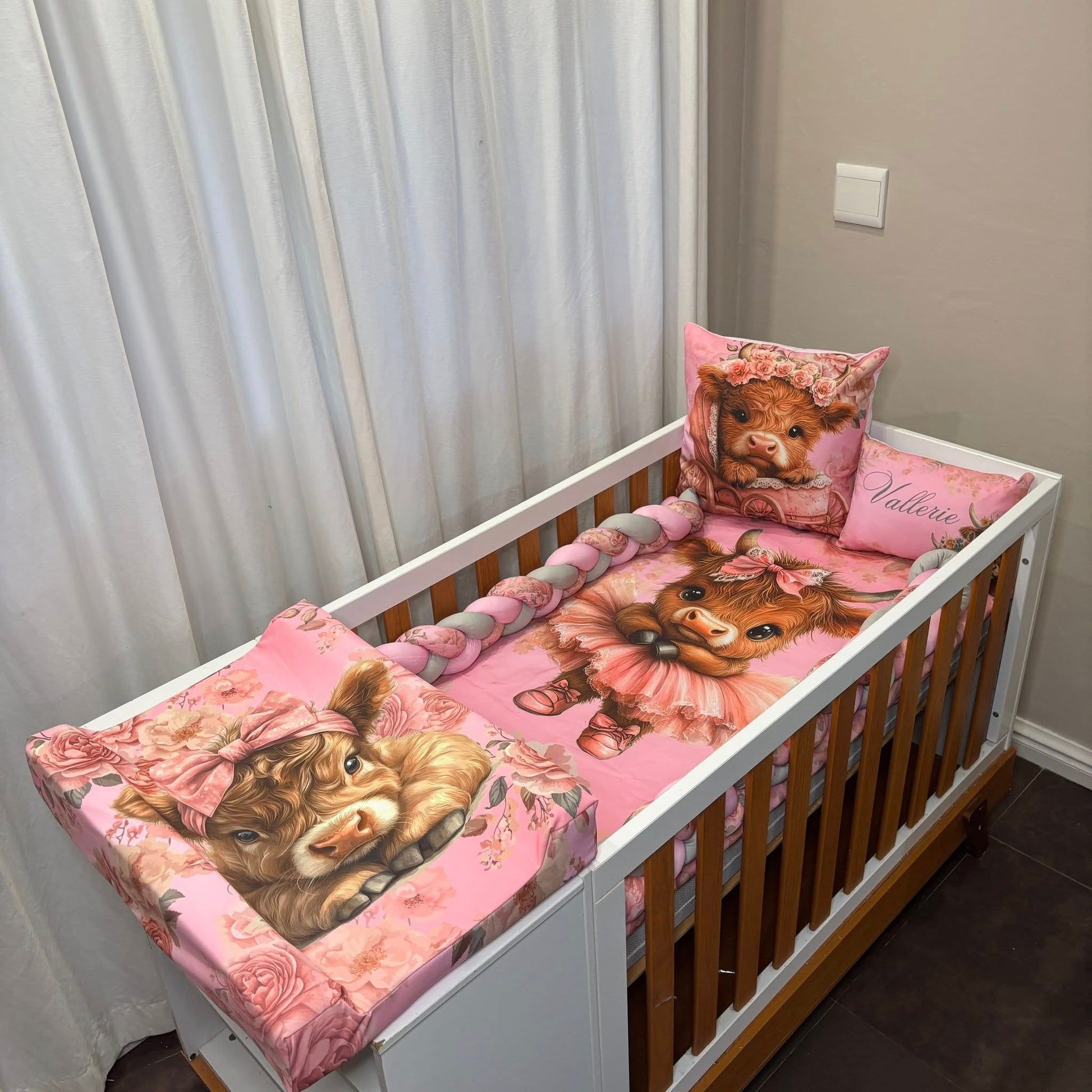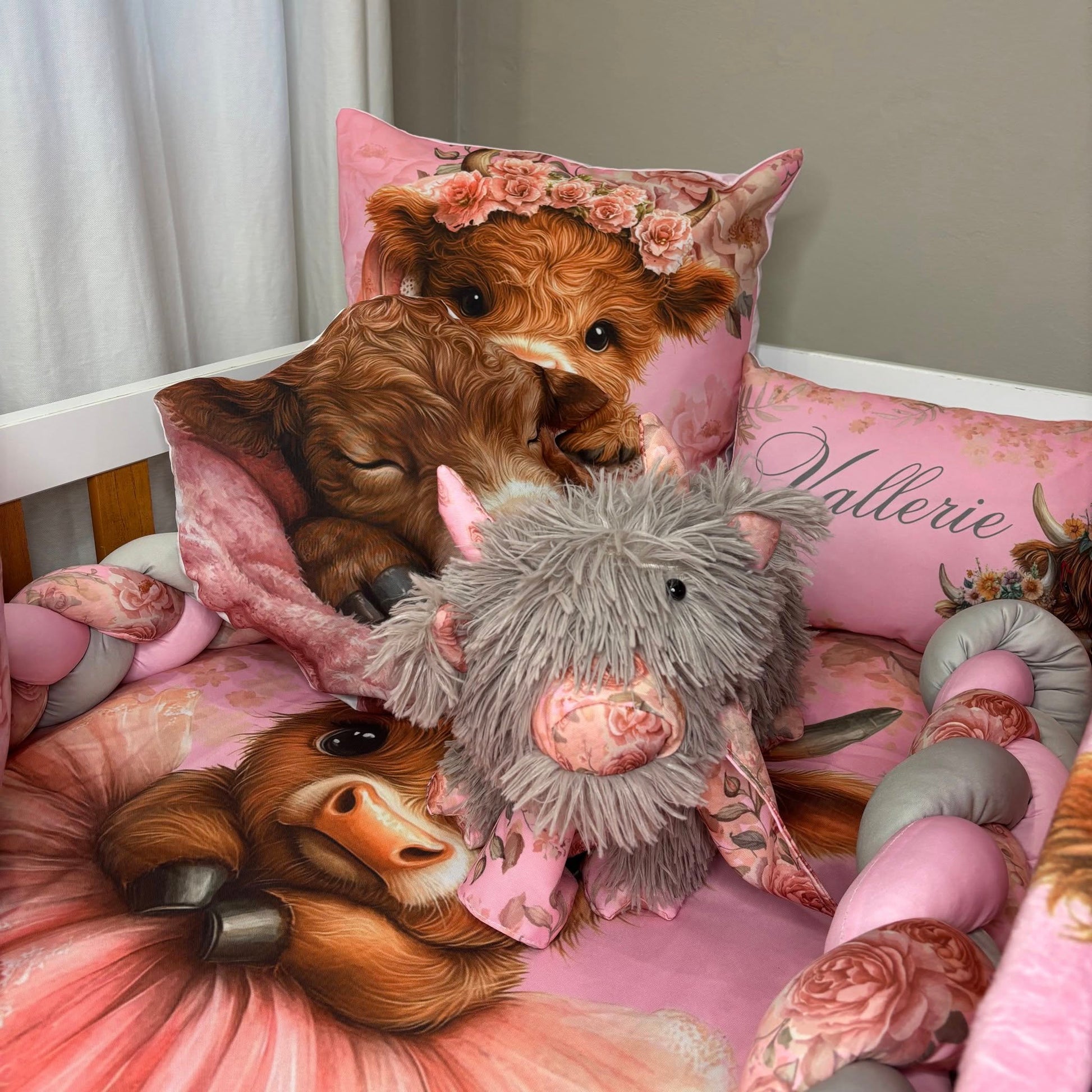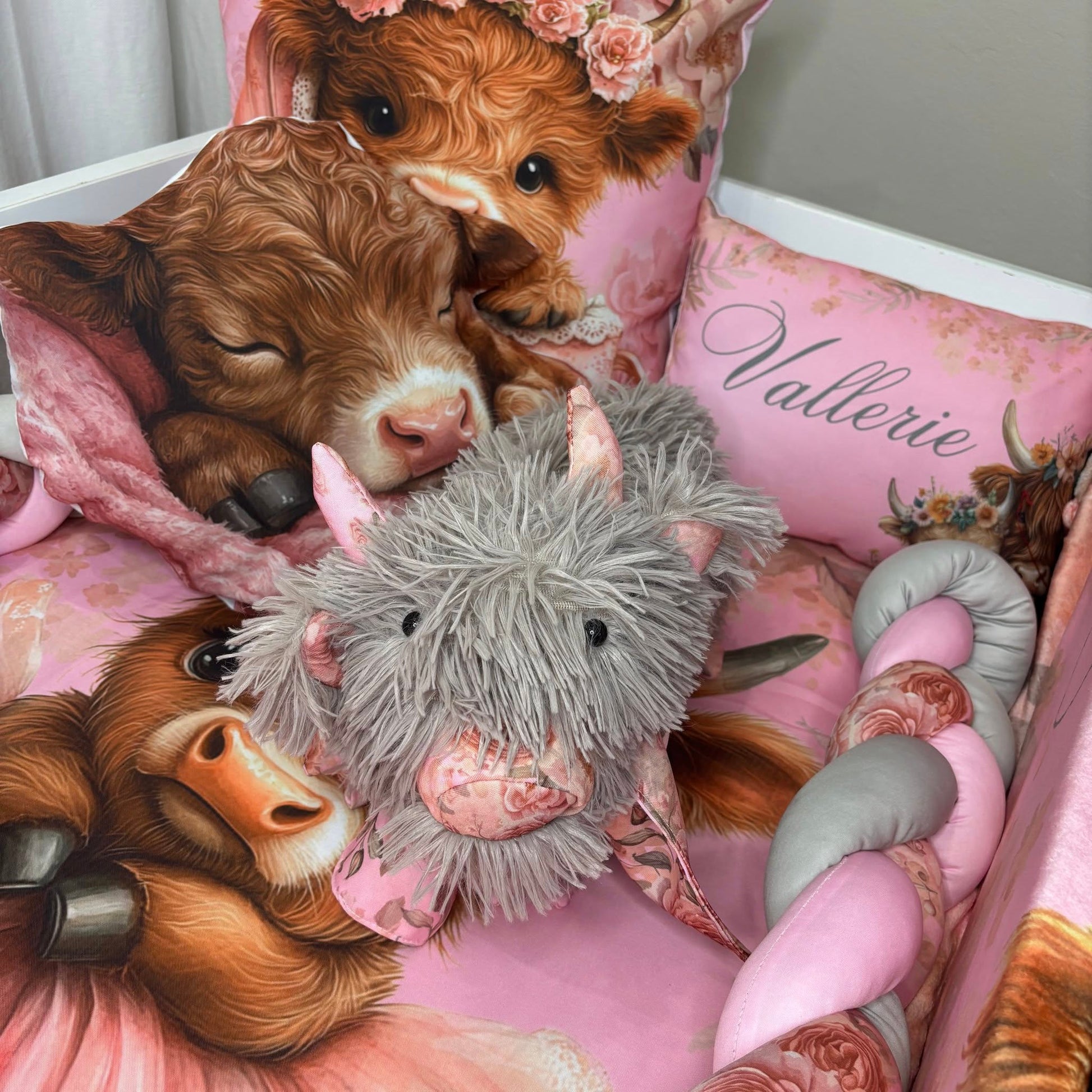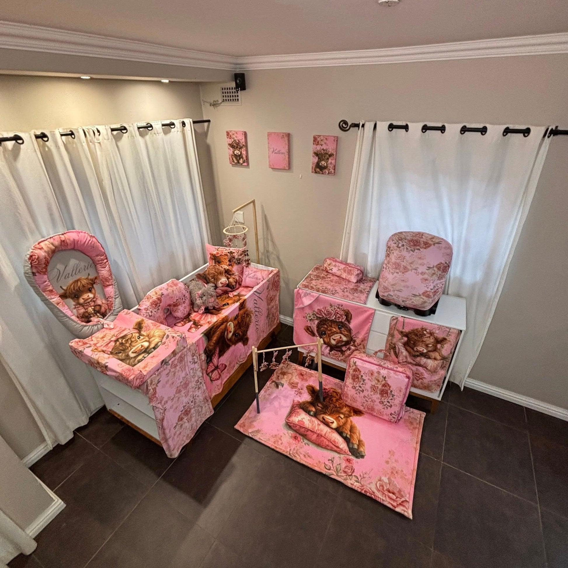Highland cows has been an upcoming trend in the nursery world with endless possibilities. They are cute, fluffy and full of personality. Finally got the chance to share a girl set and there is still many more to come!For all your custom Nursery Sets and so much more contact us today!