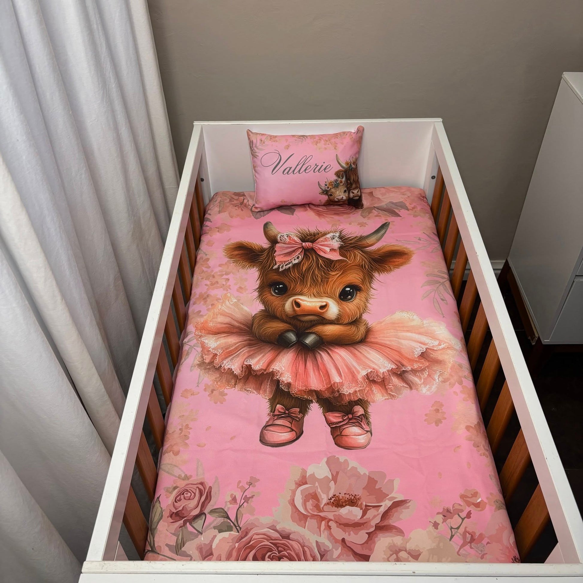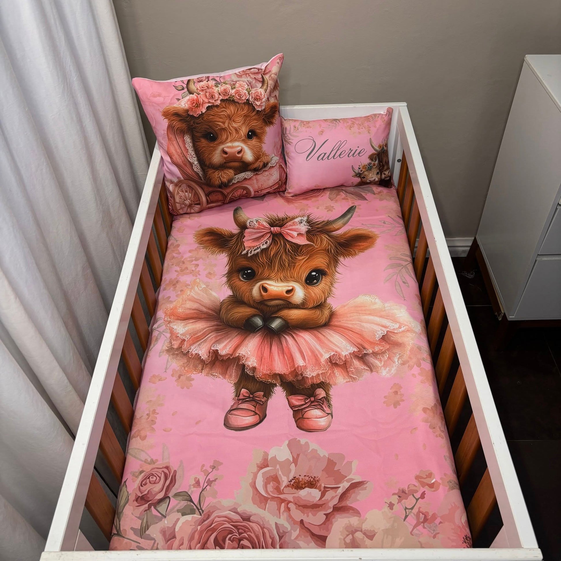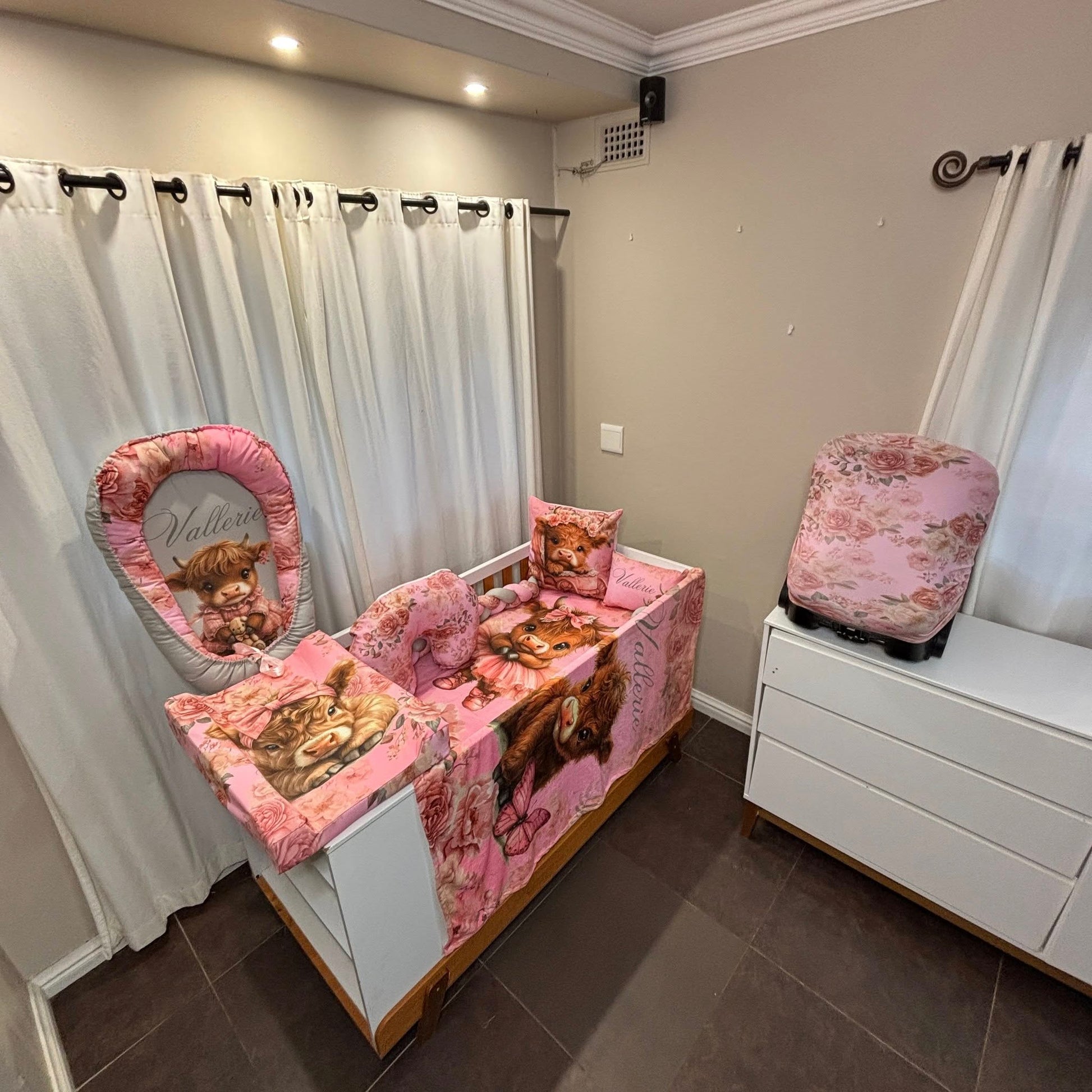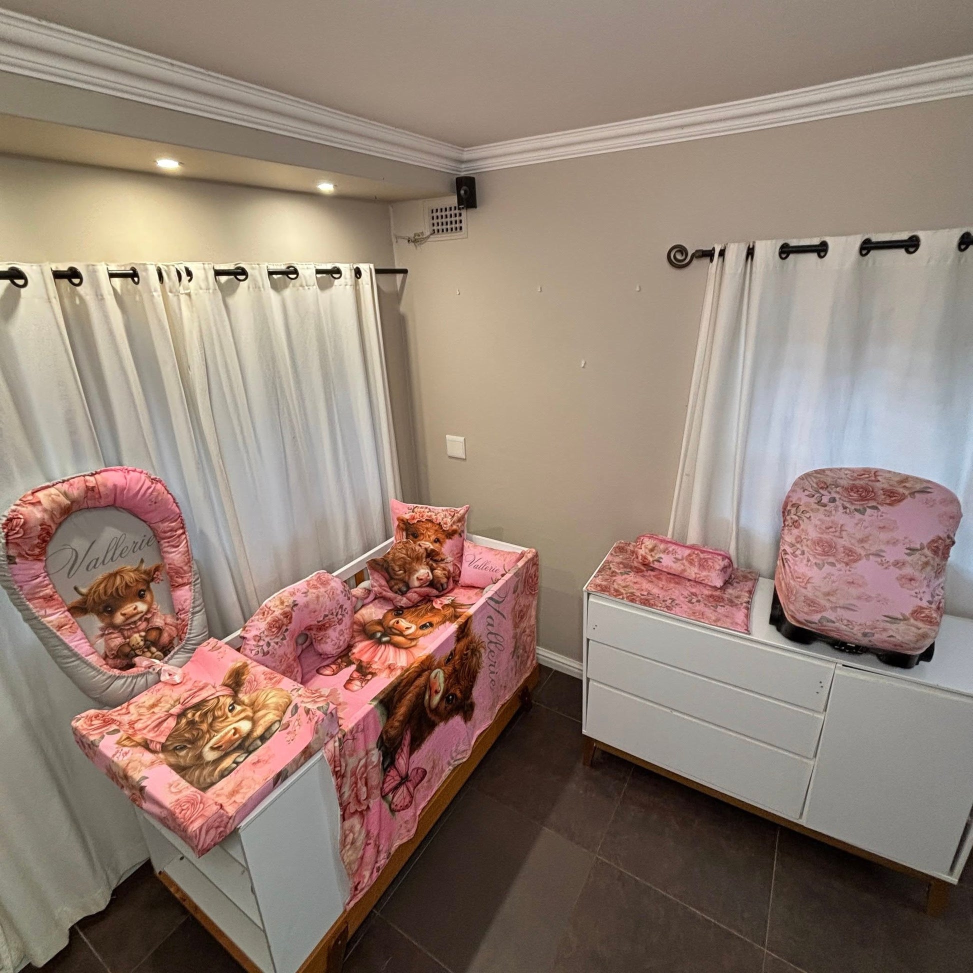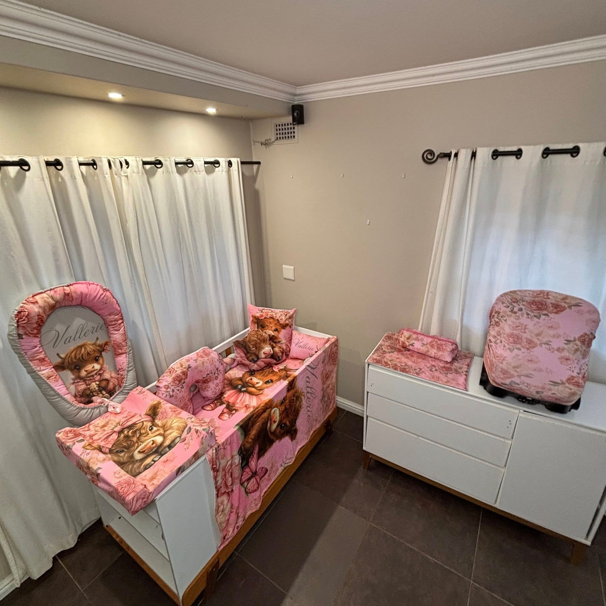 Highland cows has been an upcoming trend in the nursery world with endless possibilities. They are cute, fluffy and full of personality. Finally got the chance to share a girl set and there is still many more to come!For all your custom Nursery Sets and so much more contact us today!