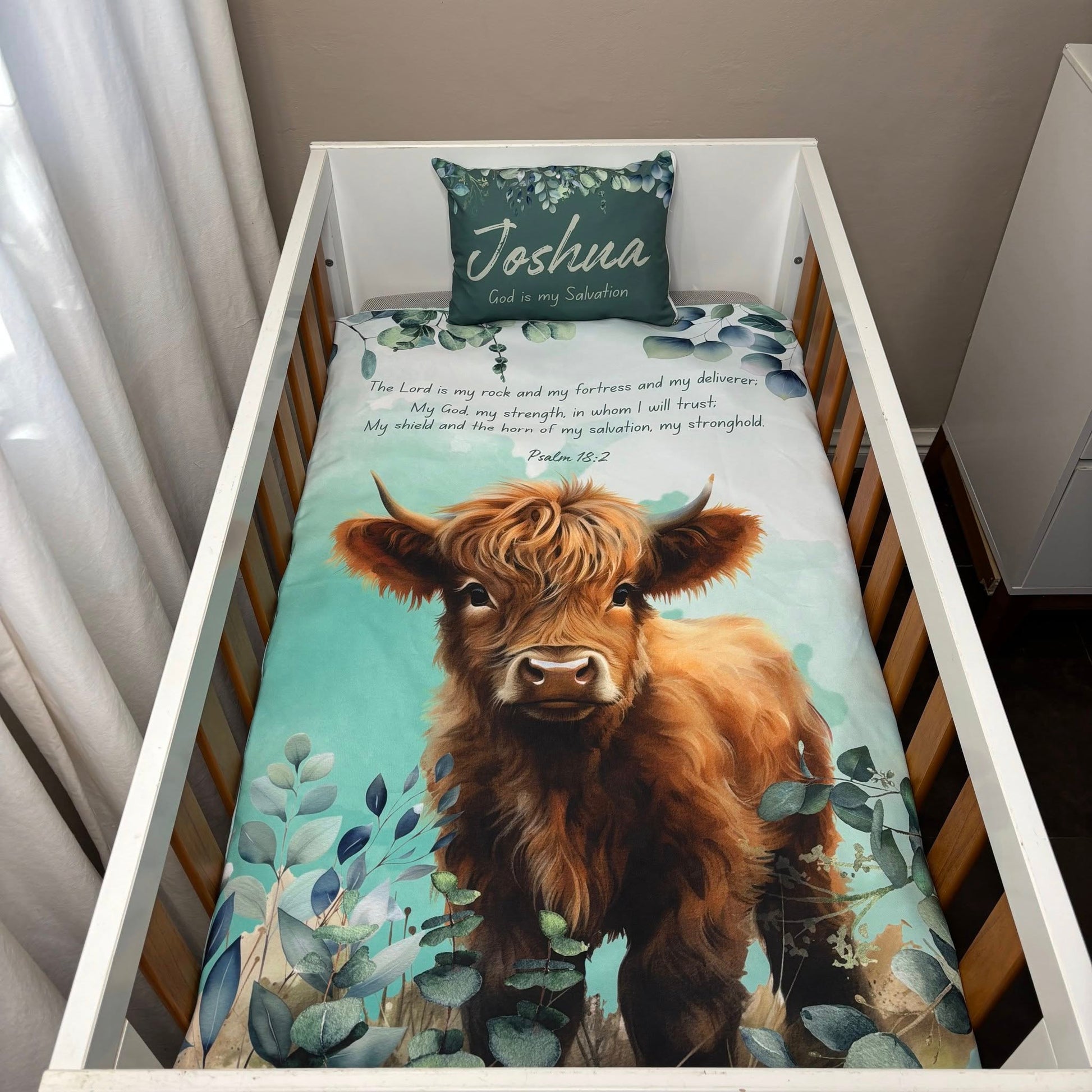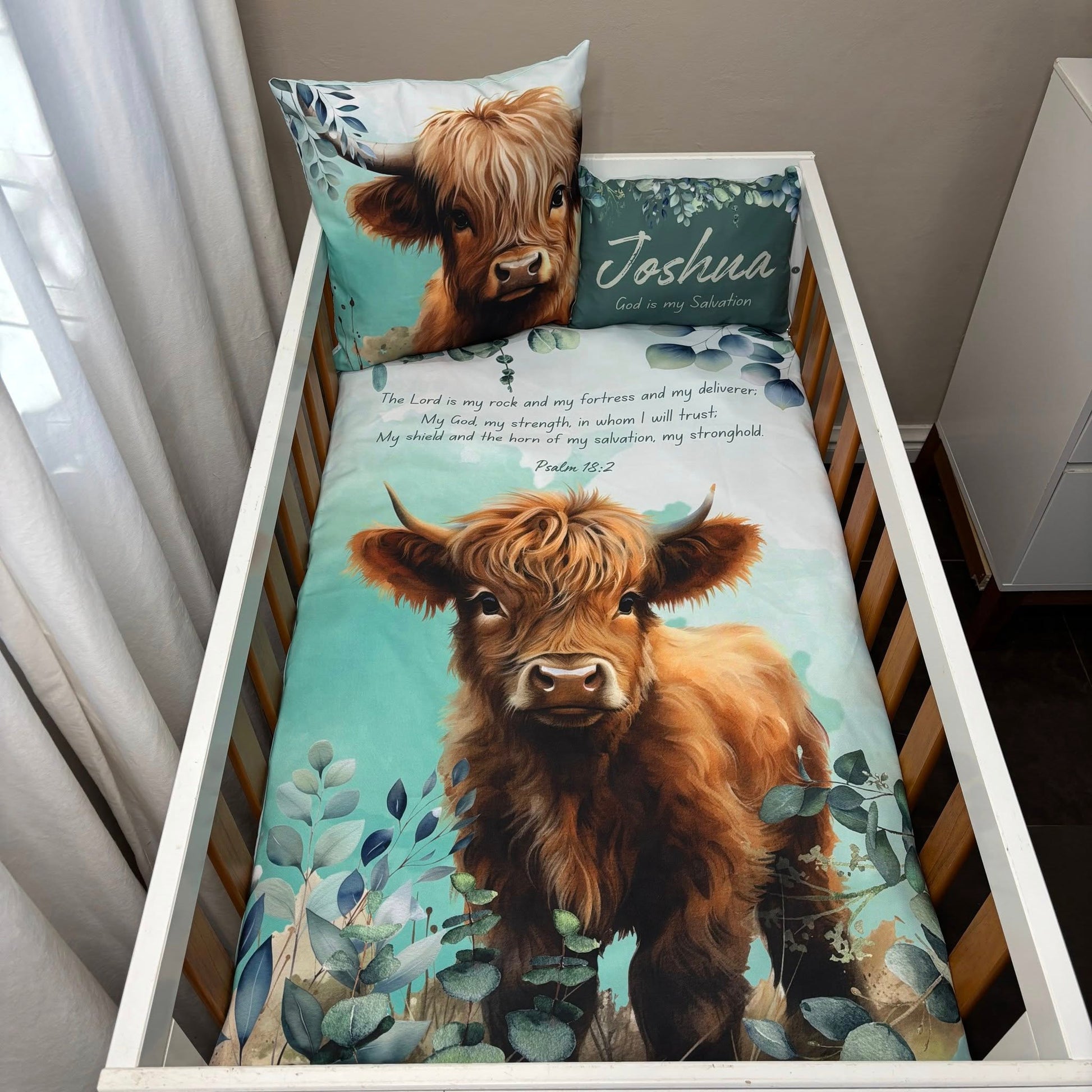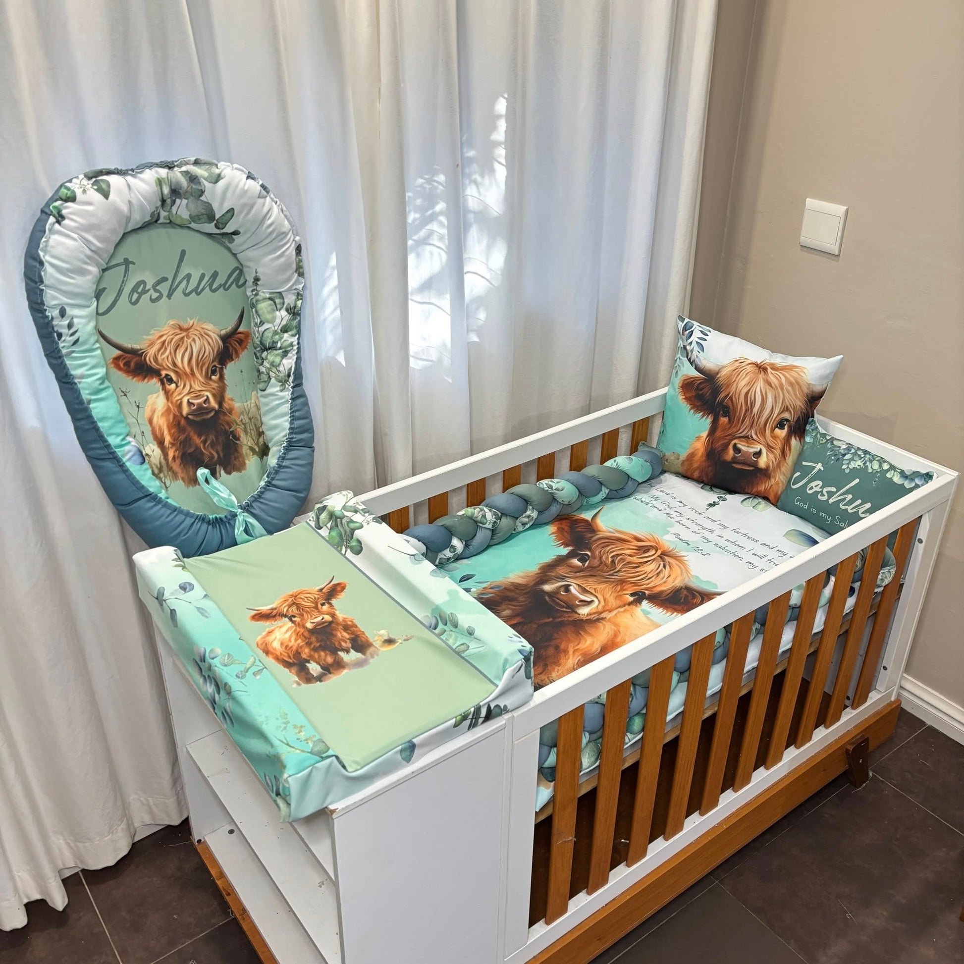 With colors of sage, mint and duck egg the trend of Highland cows in nurseries continues. Based on of our original designs The Baby Highland cow that had different colors of beige, sage and duck egg it just shows that to add your own personal touch can give it brand new personality.