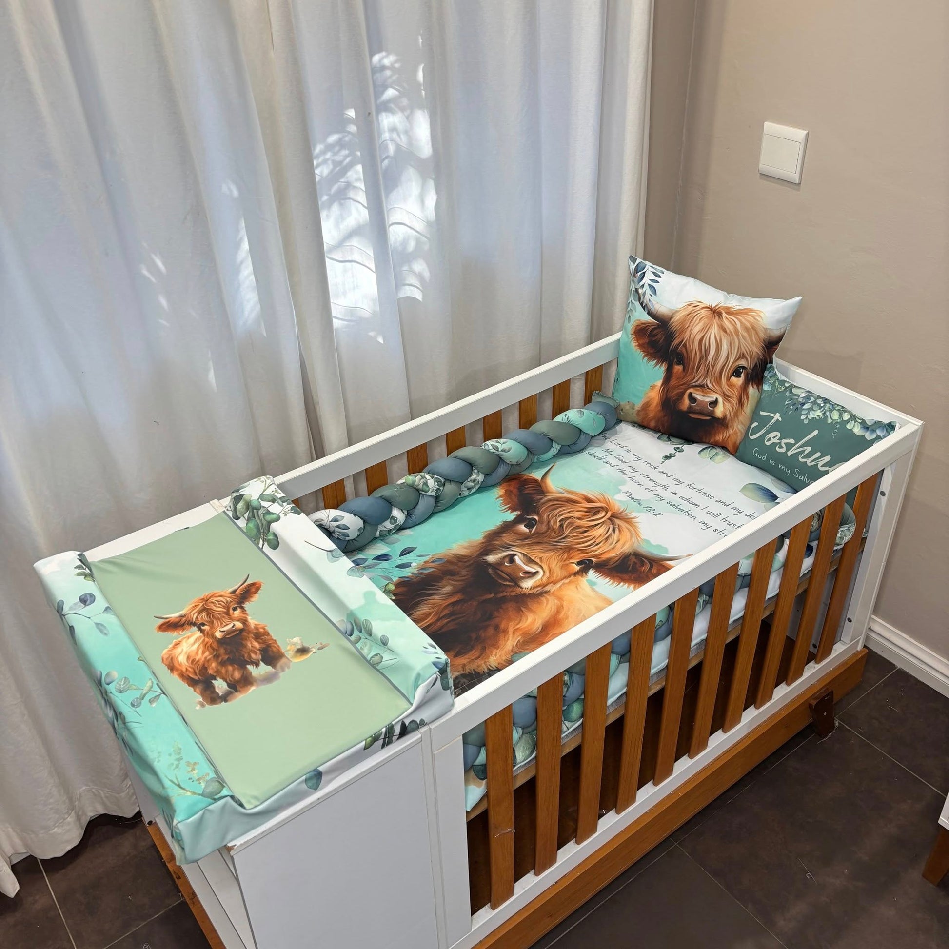 Duvet cover & Inner, or Comforter, Baby Pillow & Inner, Scatter & Inner, Waterproof Changing Mat Cover & Changing Mat Inner, 3 M Bumper and a Fitted sheet to fit cot