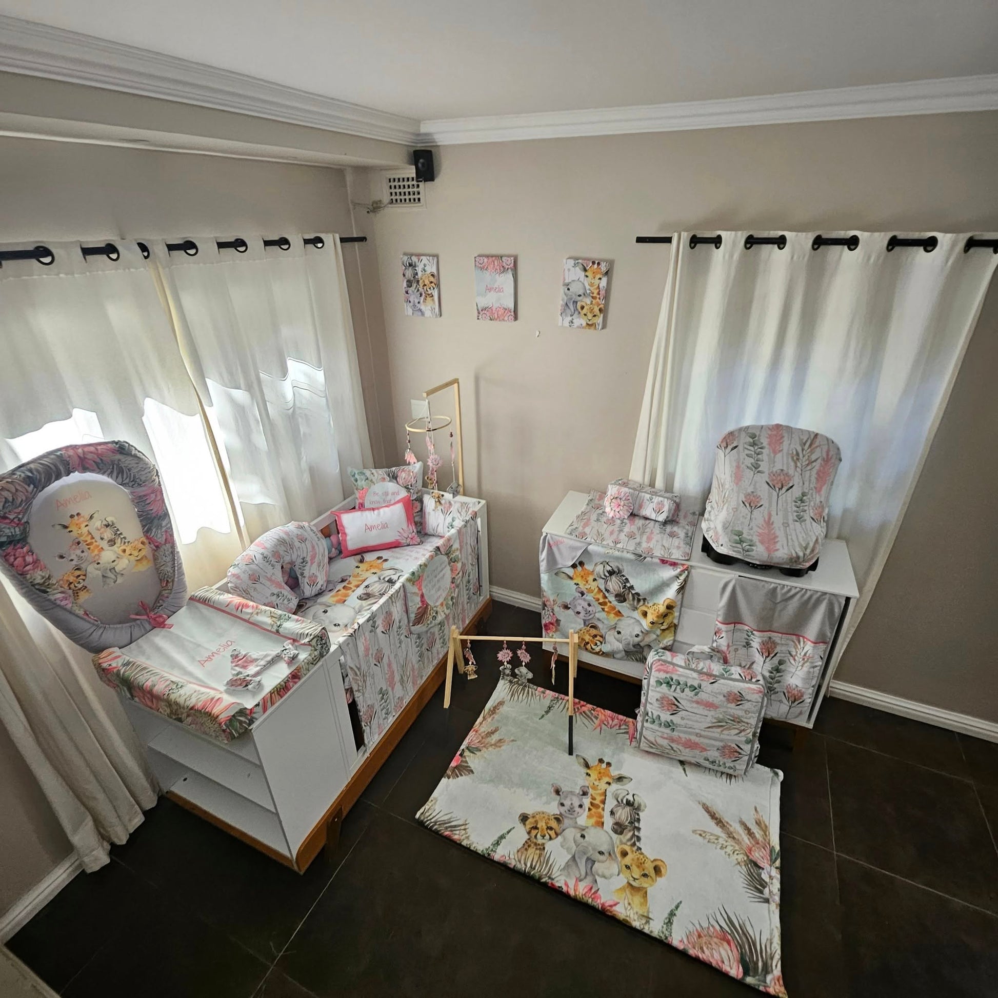 Duvet cover & Inner, or Comforter, Baby Pillow & Inner, Scatter & Inner,3 m Bumper, Carry Cot, Waterproof Changing mat Cover & Inner, Play Gym, Play Doughnut, 3 x 3 A Canvas, Hanging Diaper Bag, Cot Mobile and a Fitted sheet to fit cot