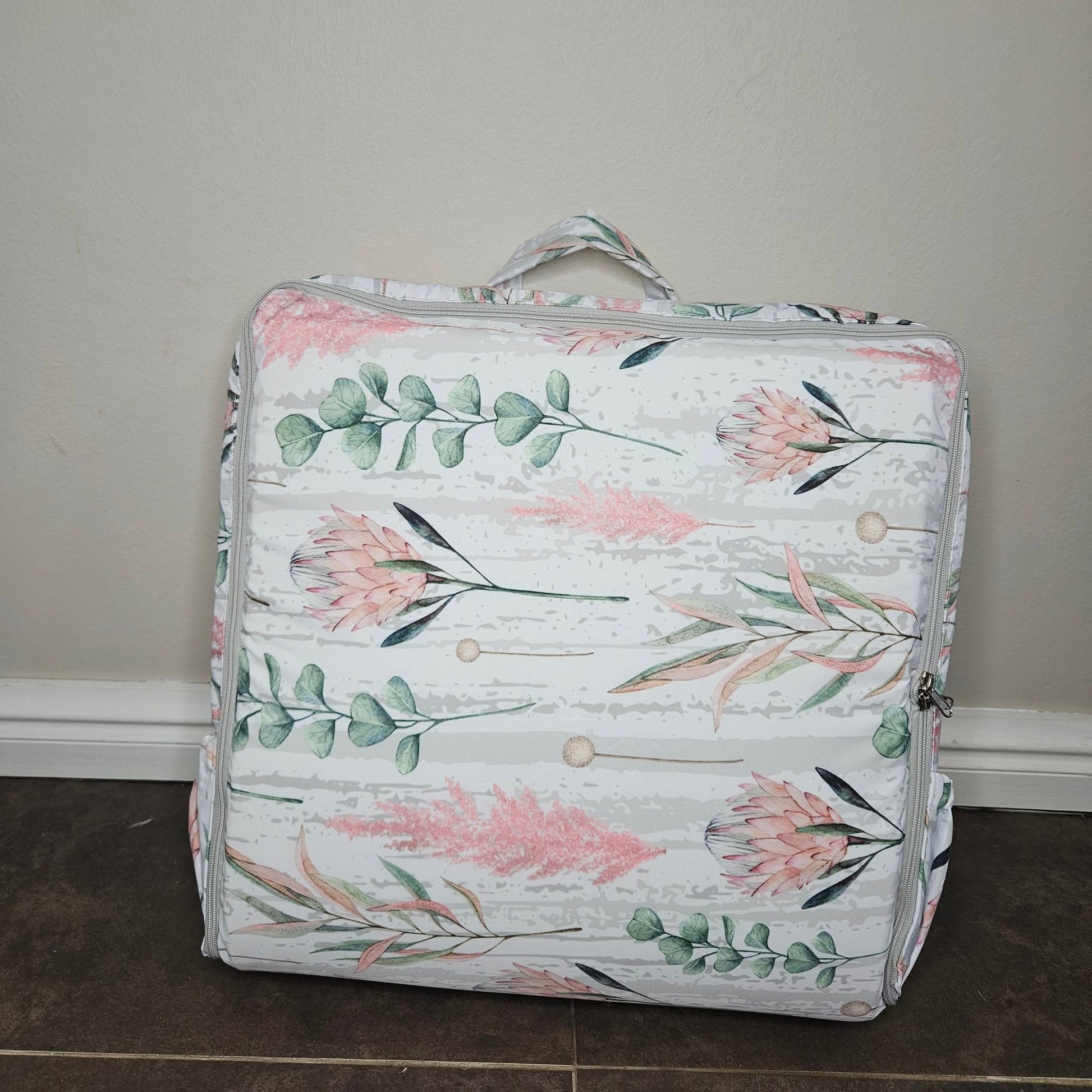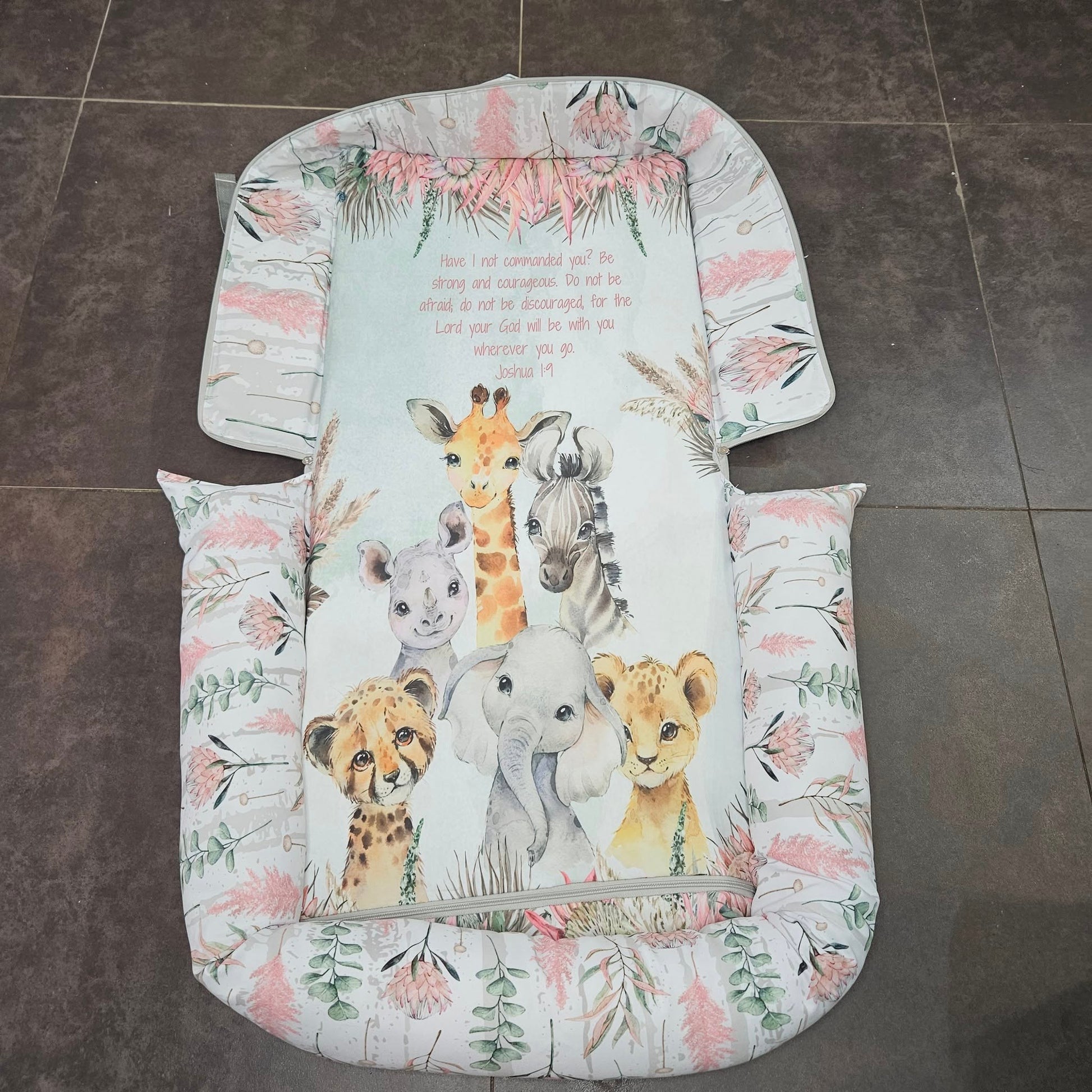 This idea has been in development for months and finally we can show it! A fully custom printed travel baby nest that serves as a bag as well!
