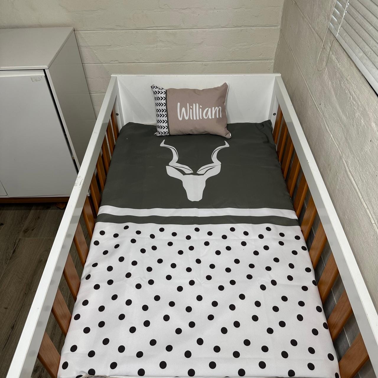 Duvet cover & Inner, or Comforter, Baby Pillow & Inner, Scatter & Inner, Waterproof Changing Mat Cover & Changing Mat Inner, 3 M Bumper and a Fitted sheet to fit cot
