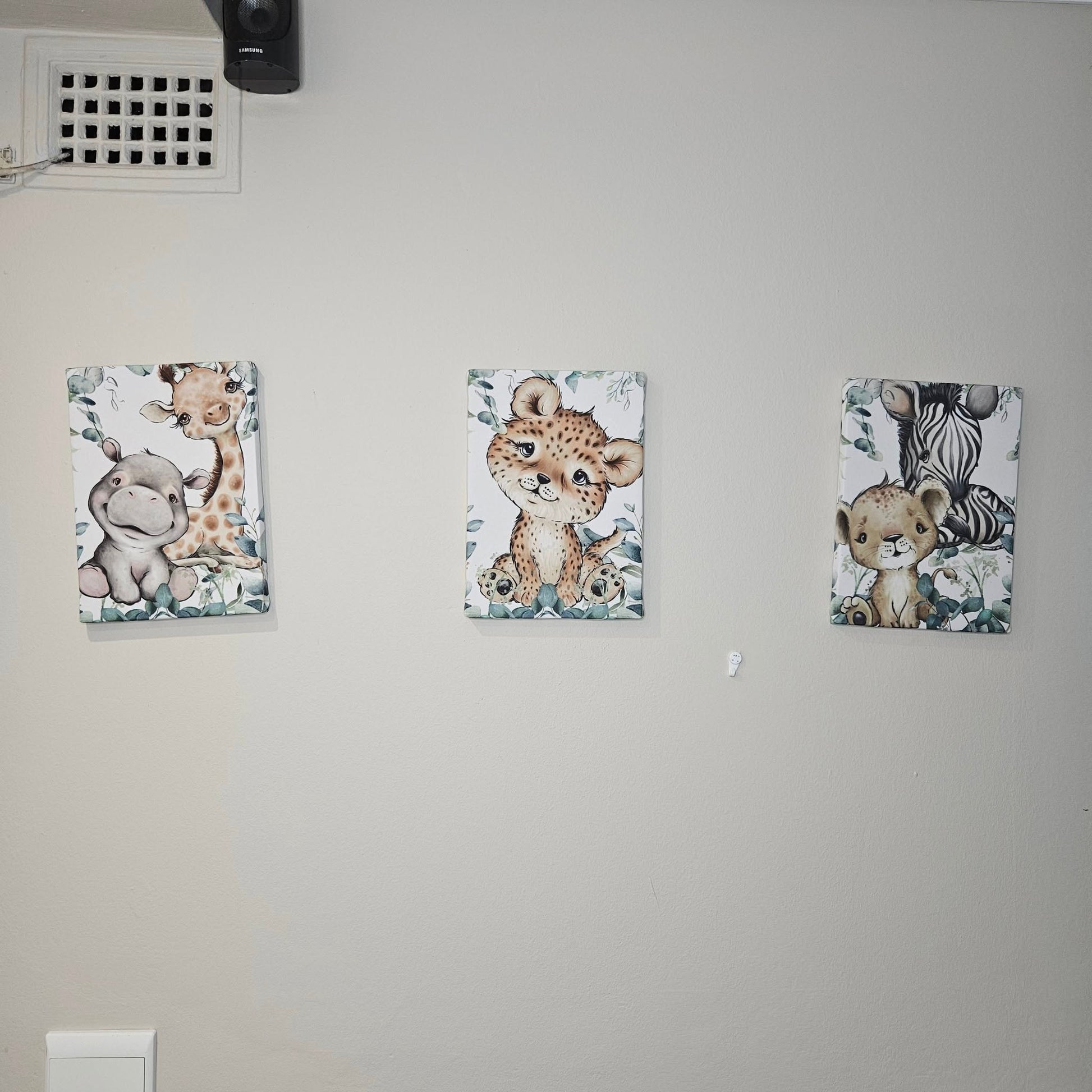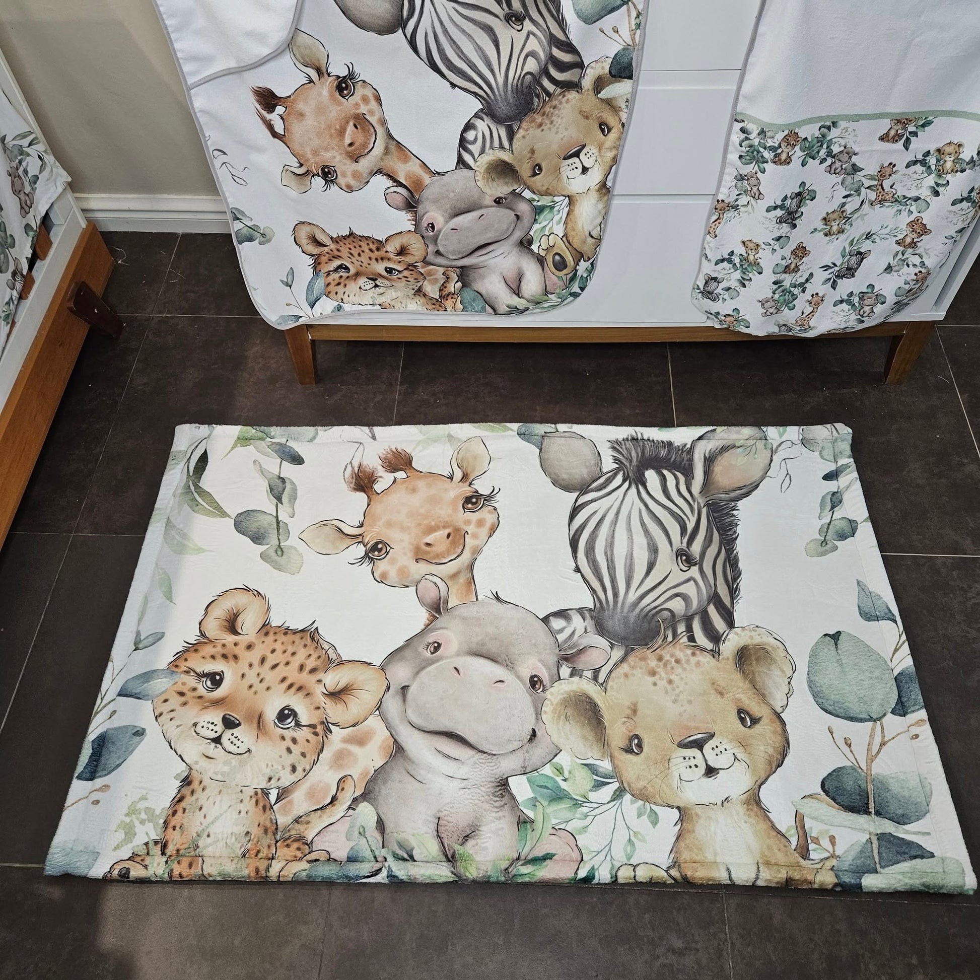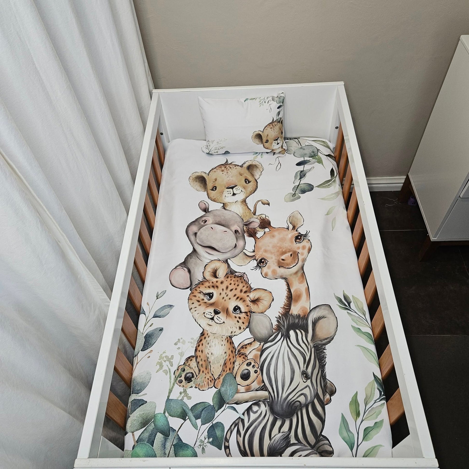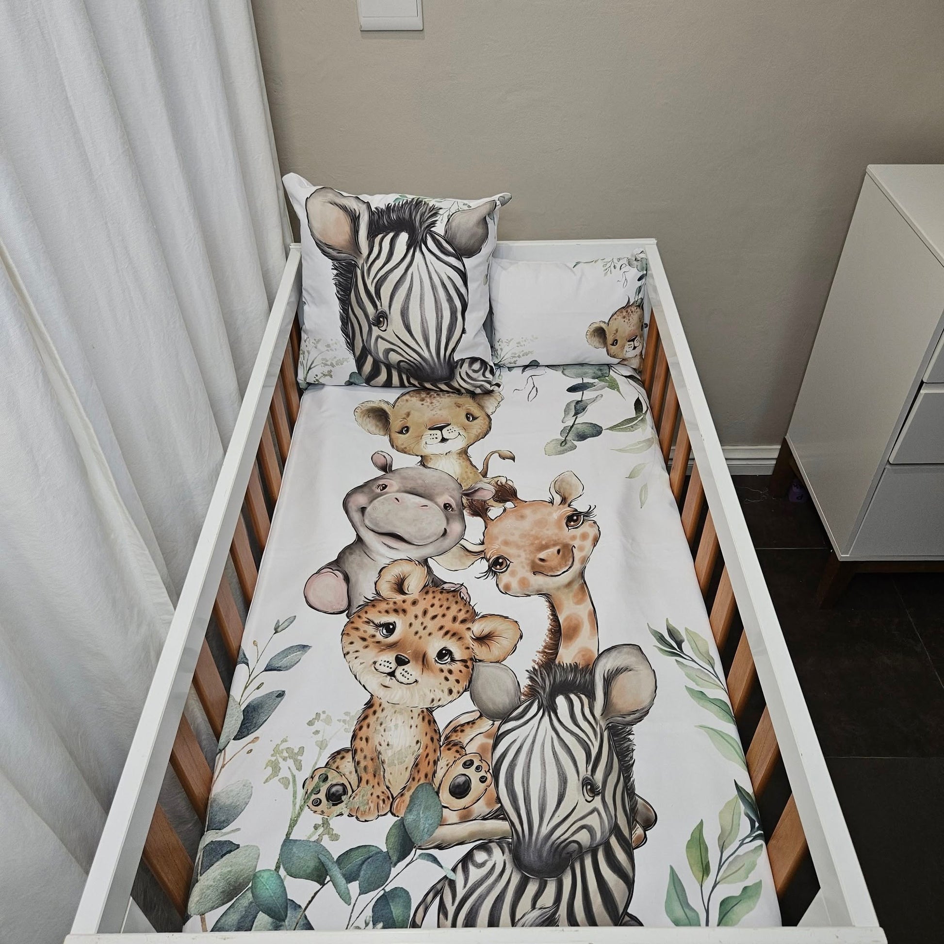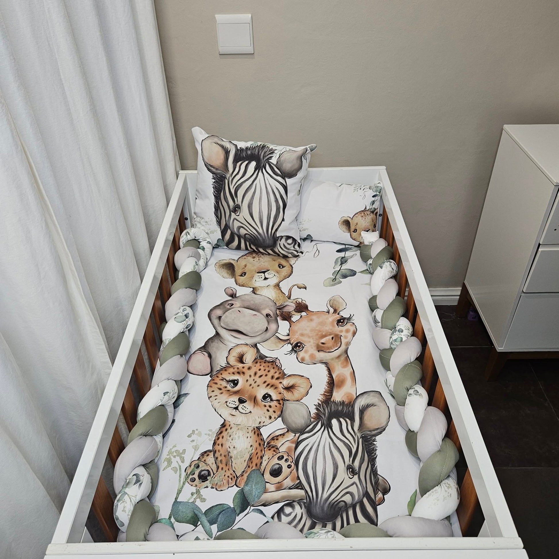 It's one of our most popular selling themes and design. Colors of white, sage and light olive gives it a clean and natural feel. The cuteness of the baby safari animals brings about a playful character to the room.With ample greenery and leaves this set will take your imagination on an adventure!