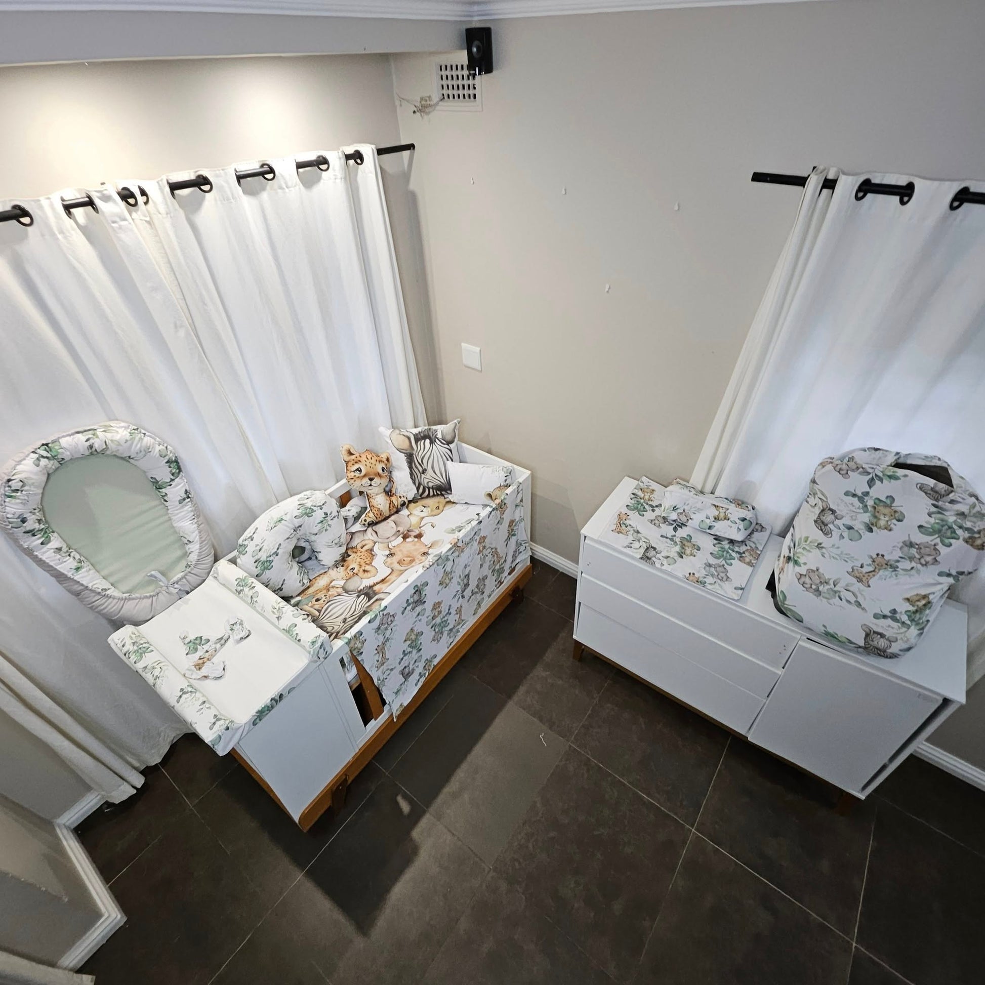 Duvet cover & Inner, or Comforter, Baby Pillow & Inner, Scatter & Inner,3 m Bumper, Carry Cot, Waterproof Changing mat Cover & Inner, Play Gym, Play Doughnut, 3 x 3 A Canvas, Hanging Diaper Bag, Cot Mobile and a Fitted sheet to fit cot