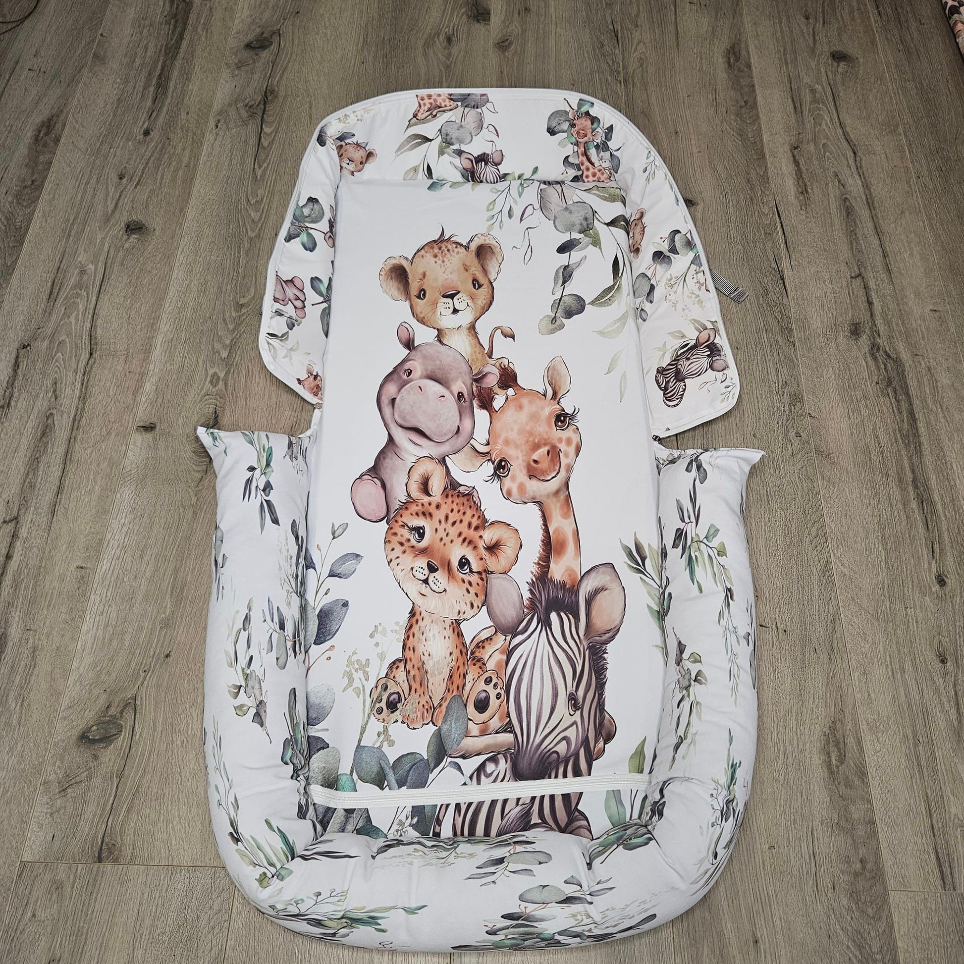 This idea has been in development for months and finally we can show it! A fully custom printed travel baby nest that serves as a bag as well!