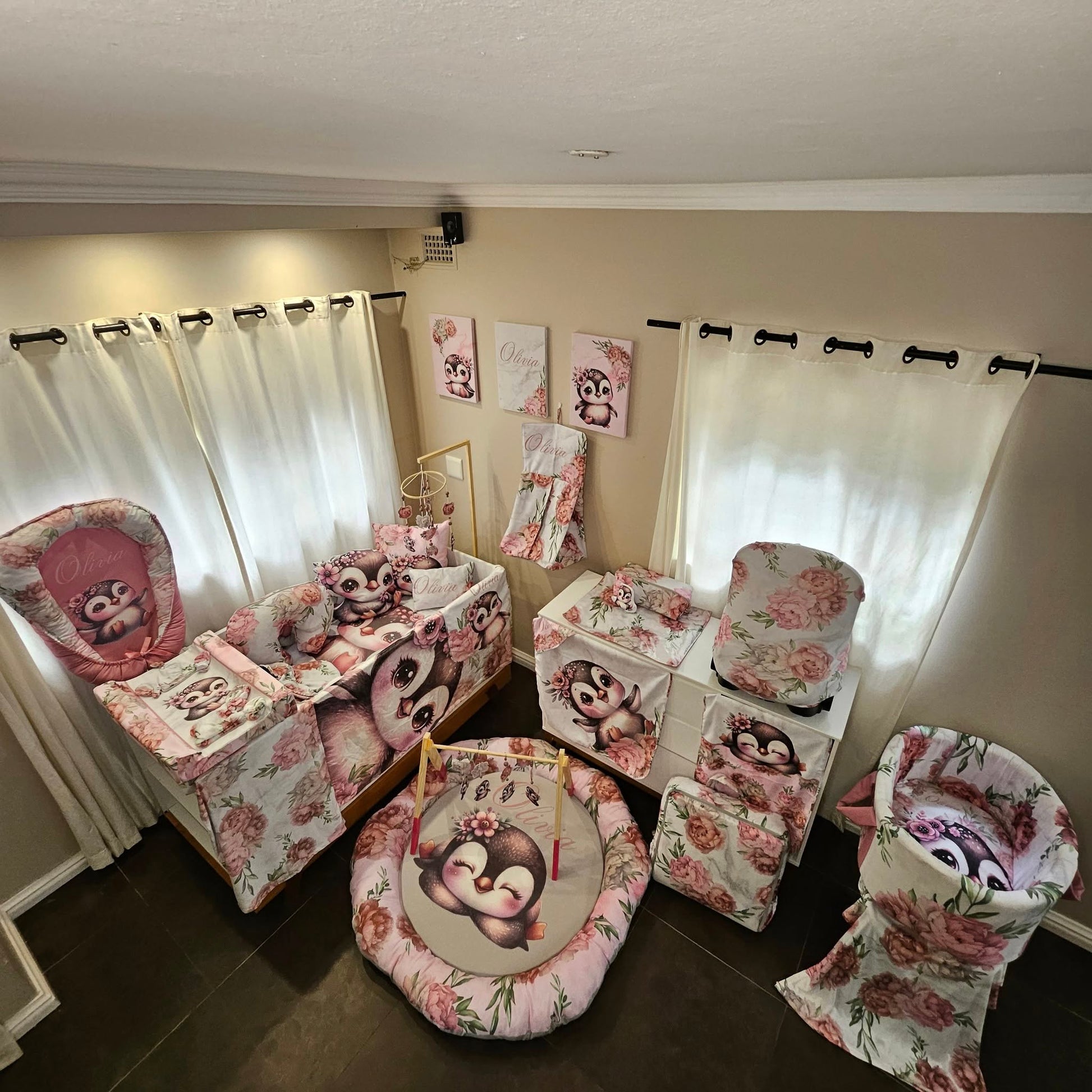 Duvet cover & Inner, or Comforter, Baby Pillow & Inner, Scatter & Inner, Nursing Pillow & Inner, Printed Towel set (5 piece), Printed Swaddle Blanket or Fleece, 3 M Bumper, Carry Cot, Waterproof Changing mat Cover & Inner, Play Gym, Play Doughnut, 3 x 3 A Canvas, Canopy, 2x Curtains 145 cm x 218cm, Hanging Diaper Bag, Cot Mobile and a Fitted Sheet to fit Cot