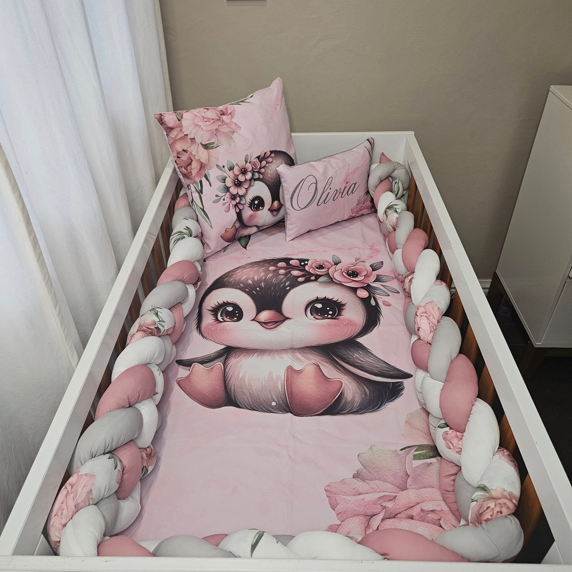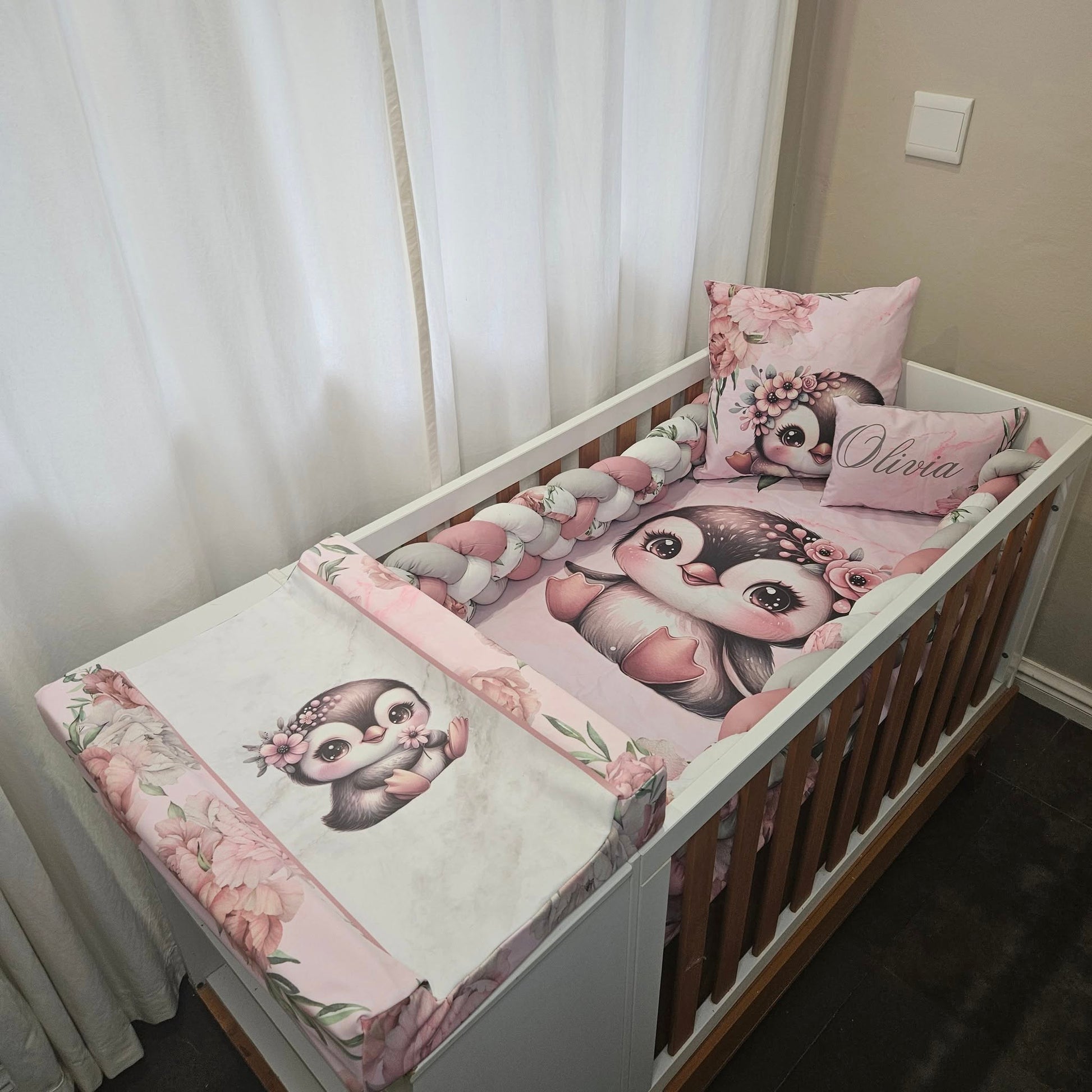 Duvet cover & Inner, or Comforter, Baby Pillow & Inner, Scatter & Inner, Waterproof Changing Mat Cover & Changing Mat Inner, 3 M Bumper and a Fitted sheet to fit cot