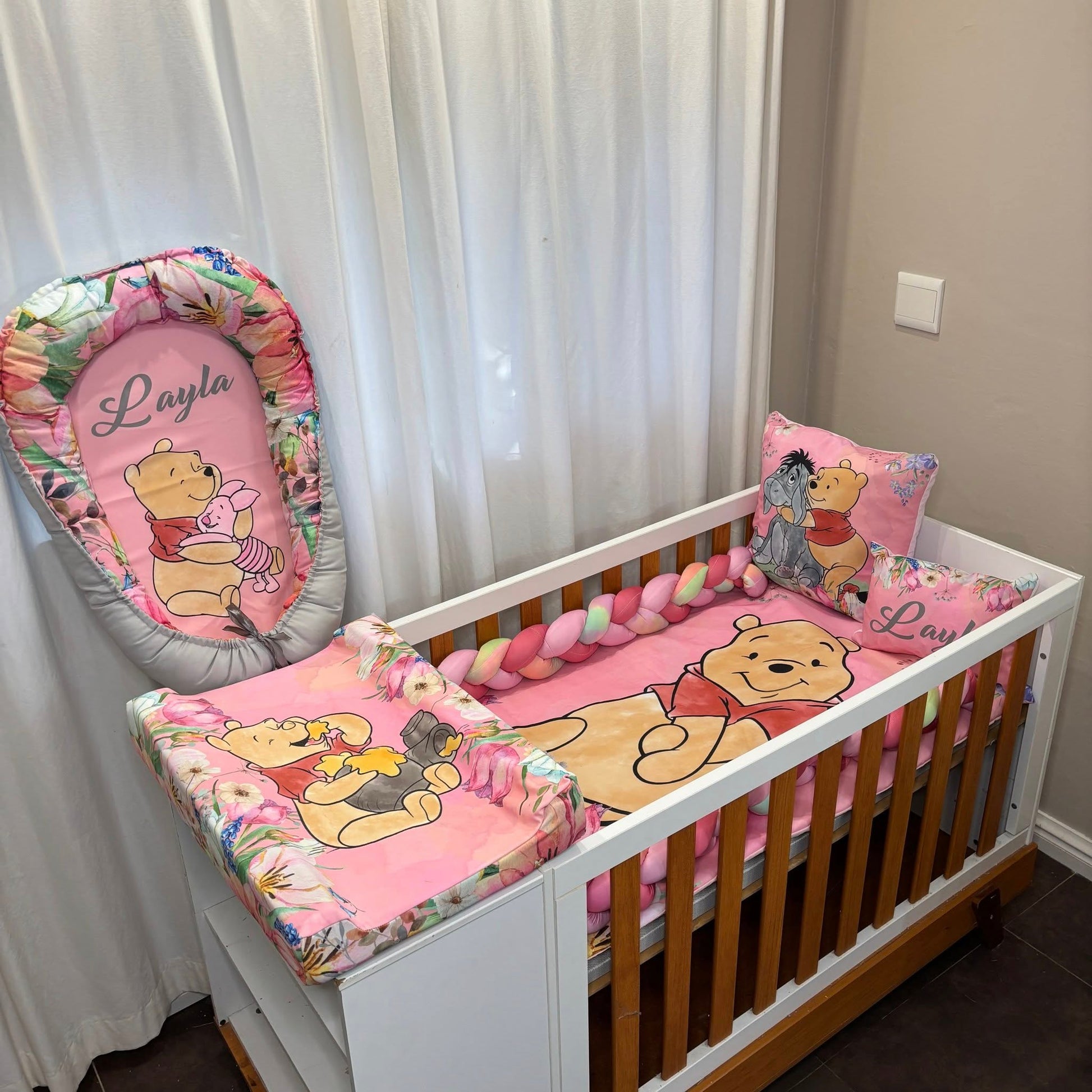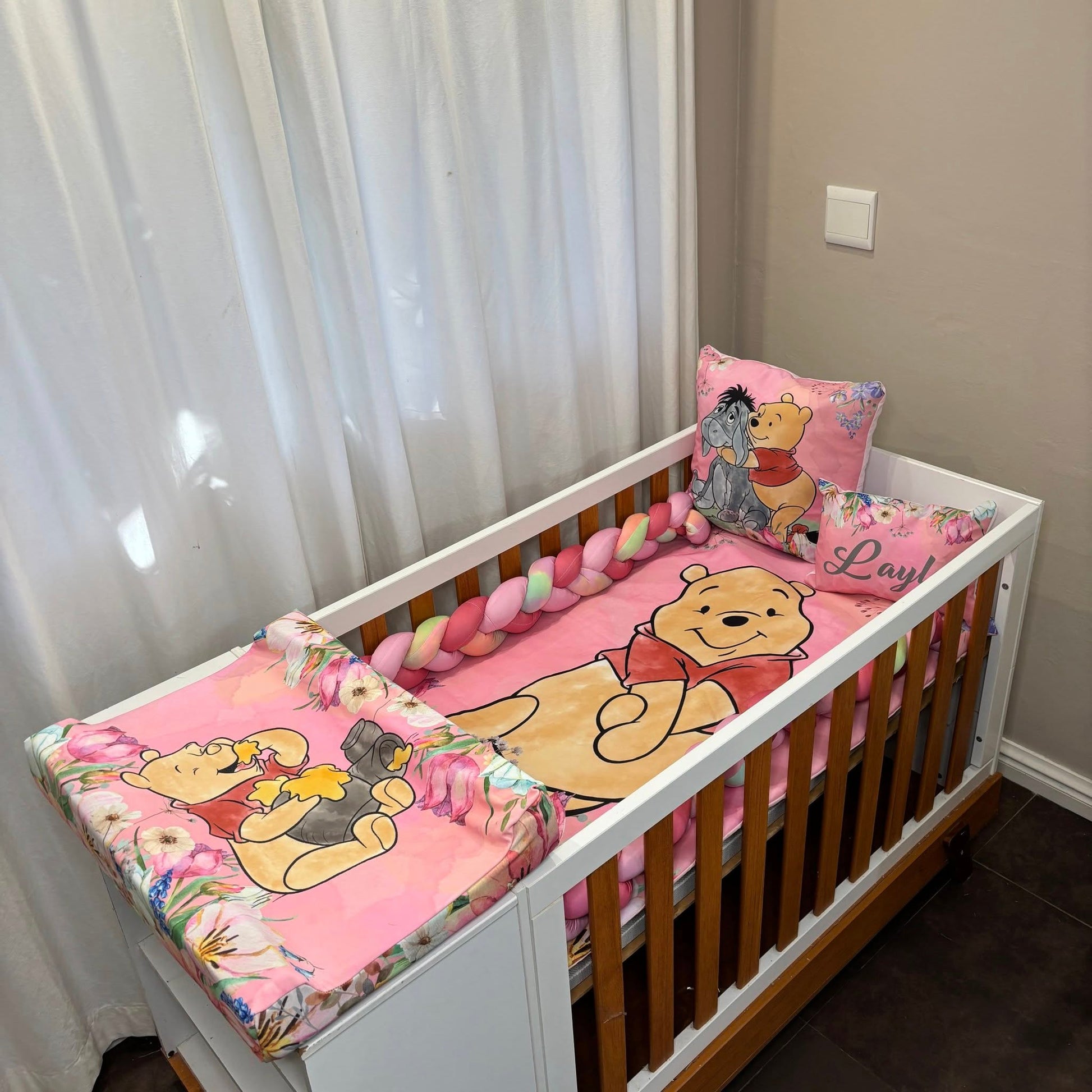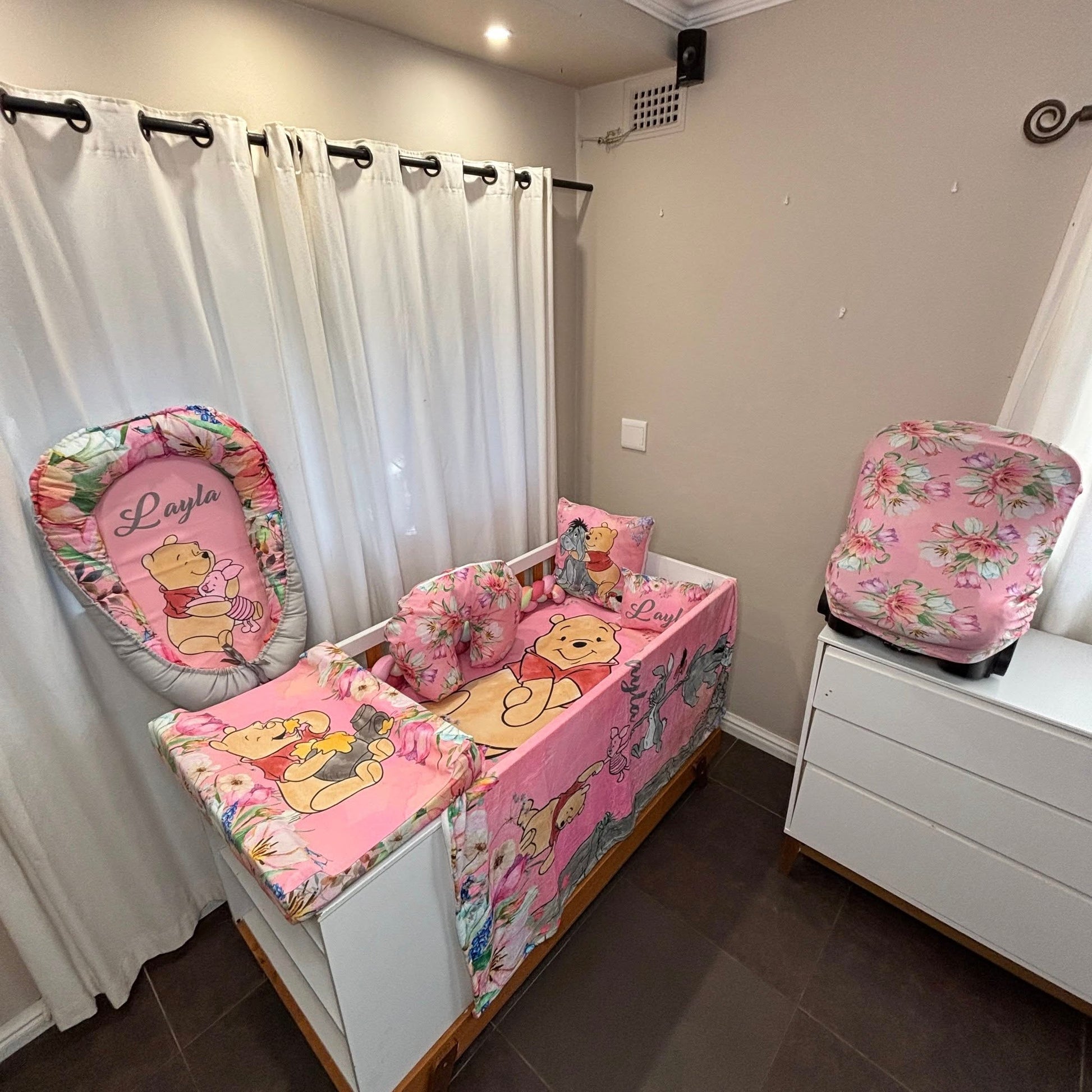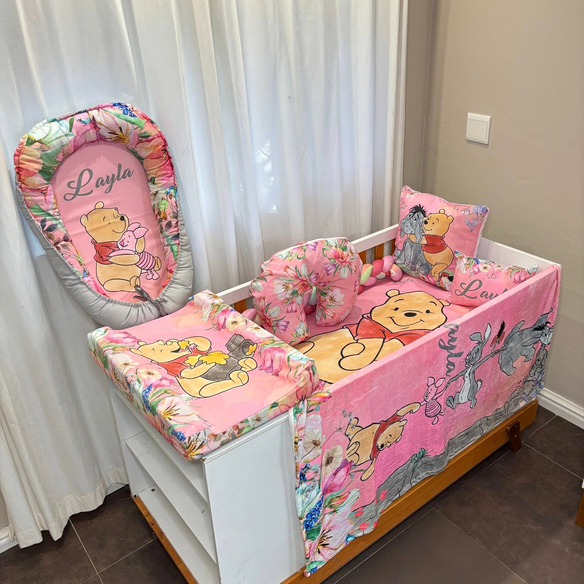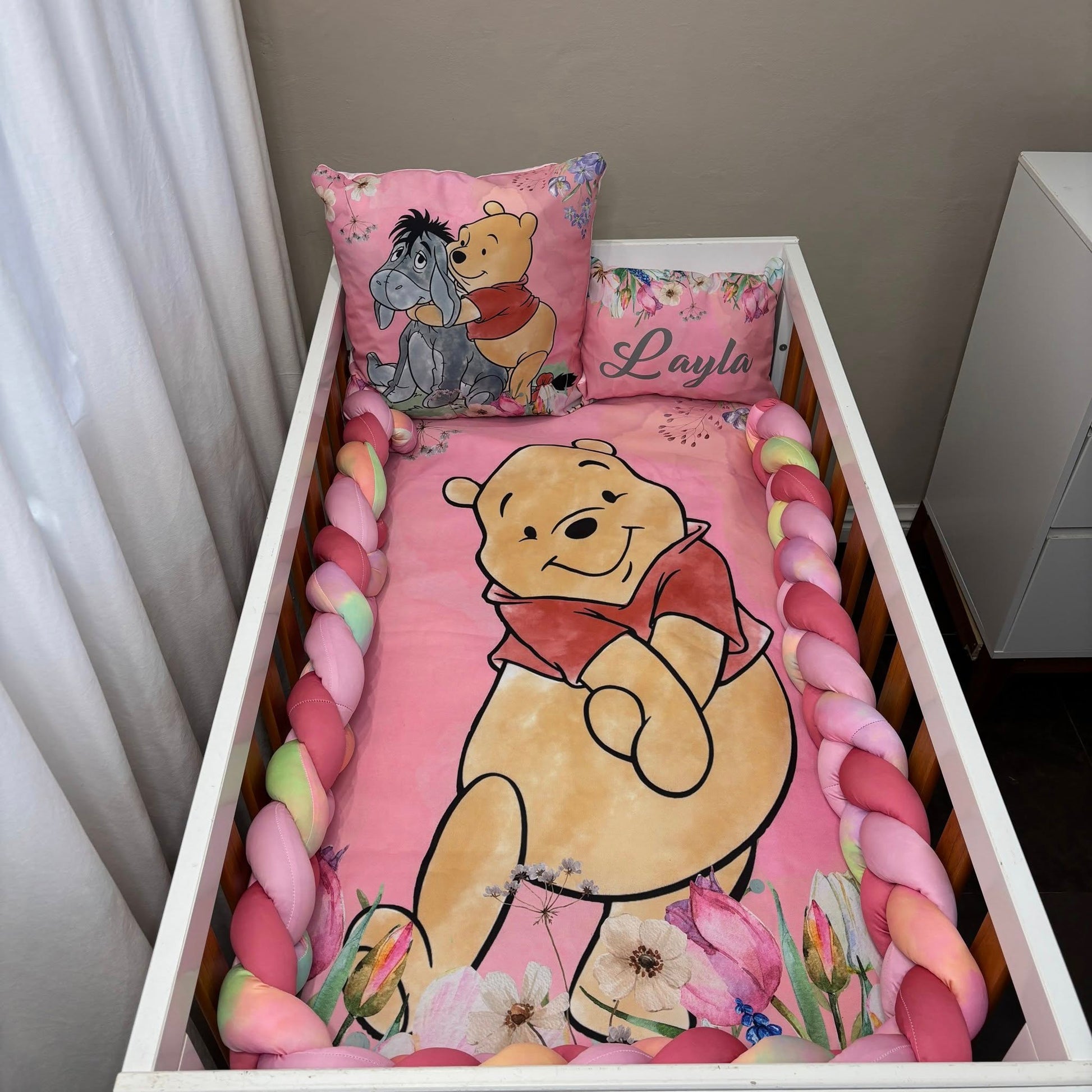 Another one to the collection of the ever popular en beautiful Winnie the Pooh sets we have done.A classical, trending and forever timeless theme for nurseries and this one just adds that personal touch. Exquisitely detailed florals and and head turning colors.It's magical, colorful and tells a story of friendship, adventure, love and excitement.For all your custom Nursery Sets and so much more contact us today!