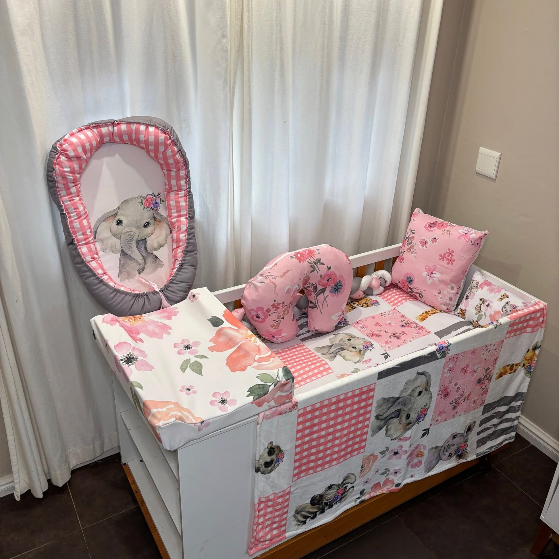 Duvet cover & Inner, or Comforter, Baby Pillow & Inner, Scatter & Inner, Baby nest, Waterproof Changing mat Cover & Inner, 3 M Bumper and a Fitted sheet to fit cot
