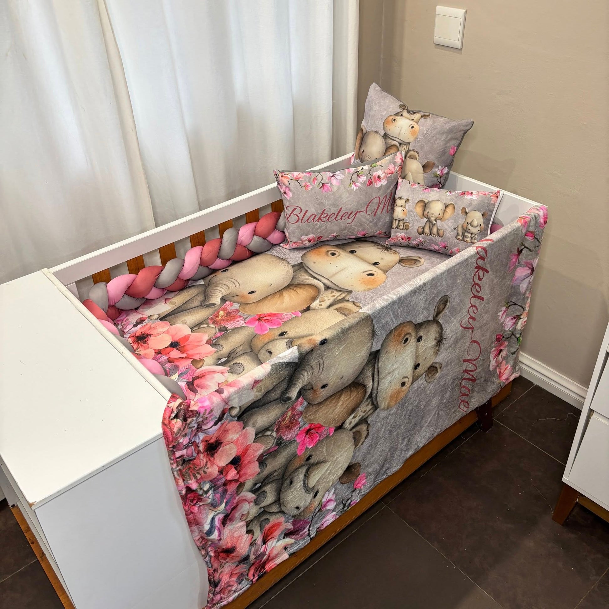 Duvet cover & Inner, or Comforter, Baby Pillow & Inner, Scatter & Inner, Waterproof Changing Mat Cover & Changing Mat Inner, 3 M Bumper and a Fitted sheet to fit cot