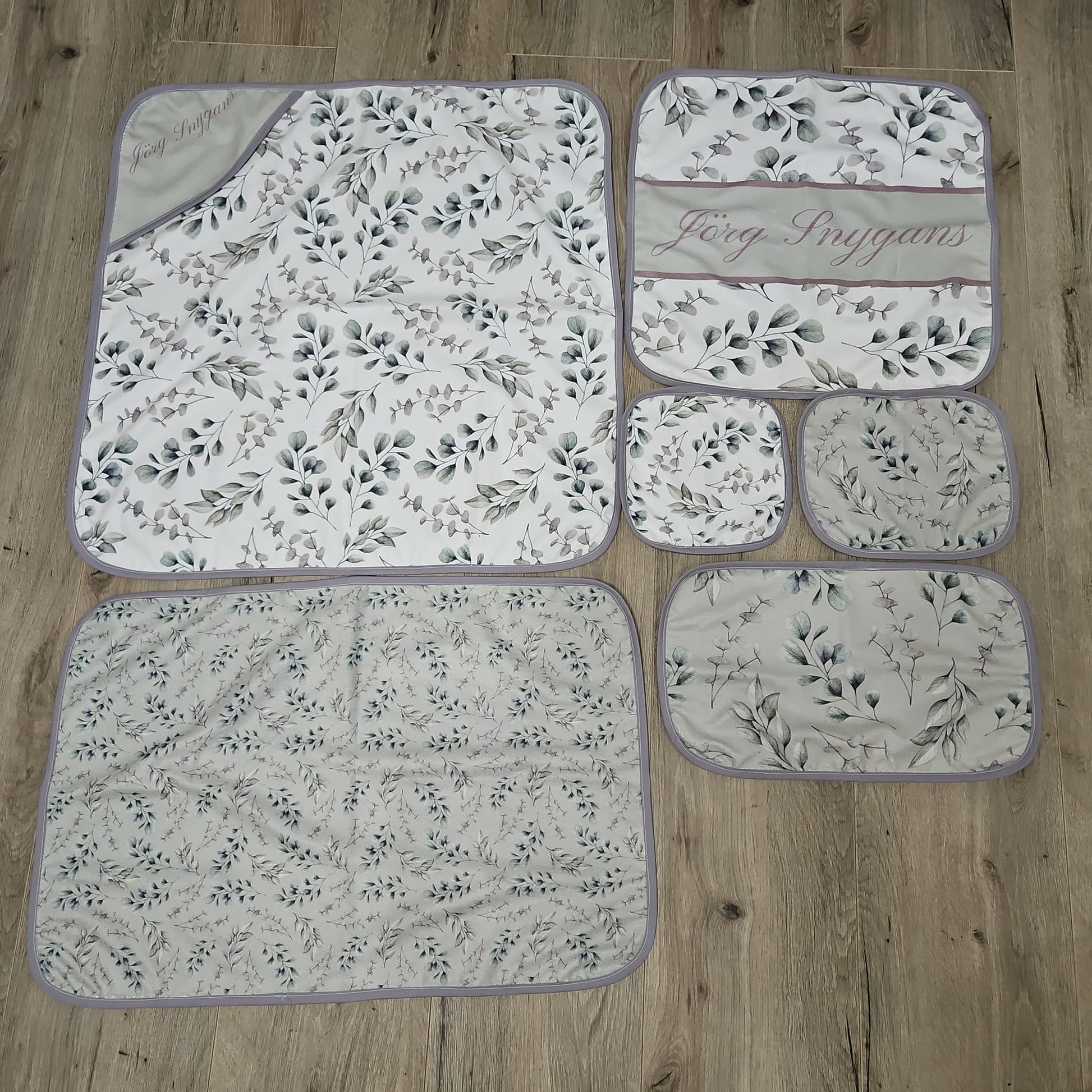 Duvet cover & Inner, or Comforter, Baby Pillow & Inner, Scatter & Inner, Standard Pillow & Inner, Printed Towel set (5 piece), Printed Swaddle Blanket or Fleece, 3 M Bumper, Baby Nest, Waterproof Changing mat cover & Inner and a Fitted Sheet to fit cot