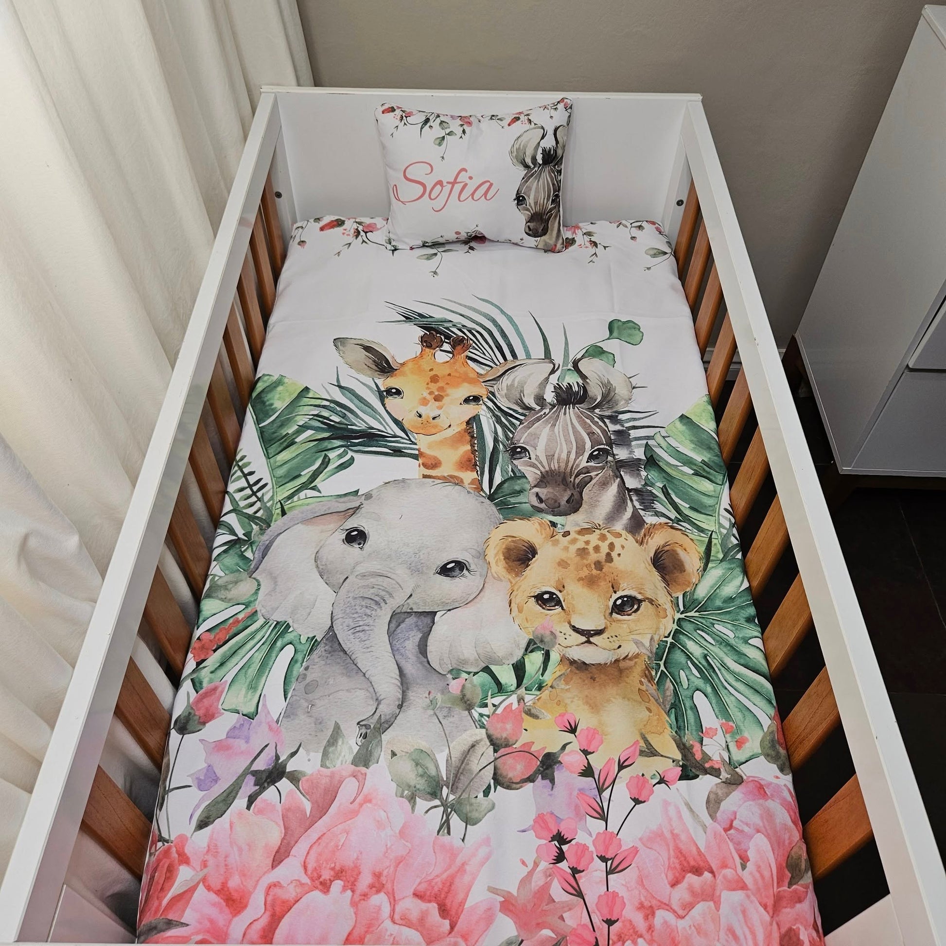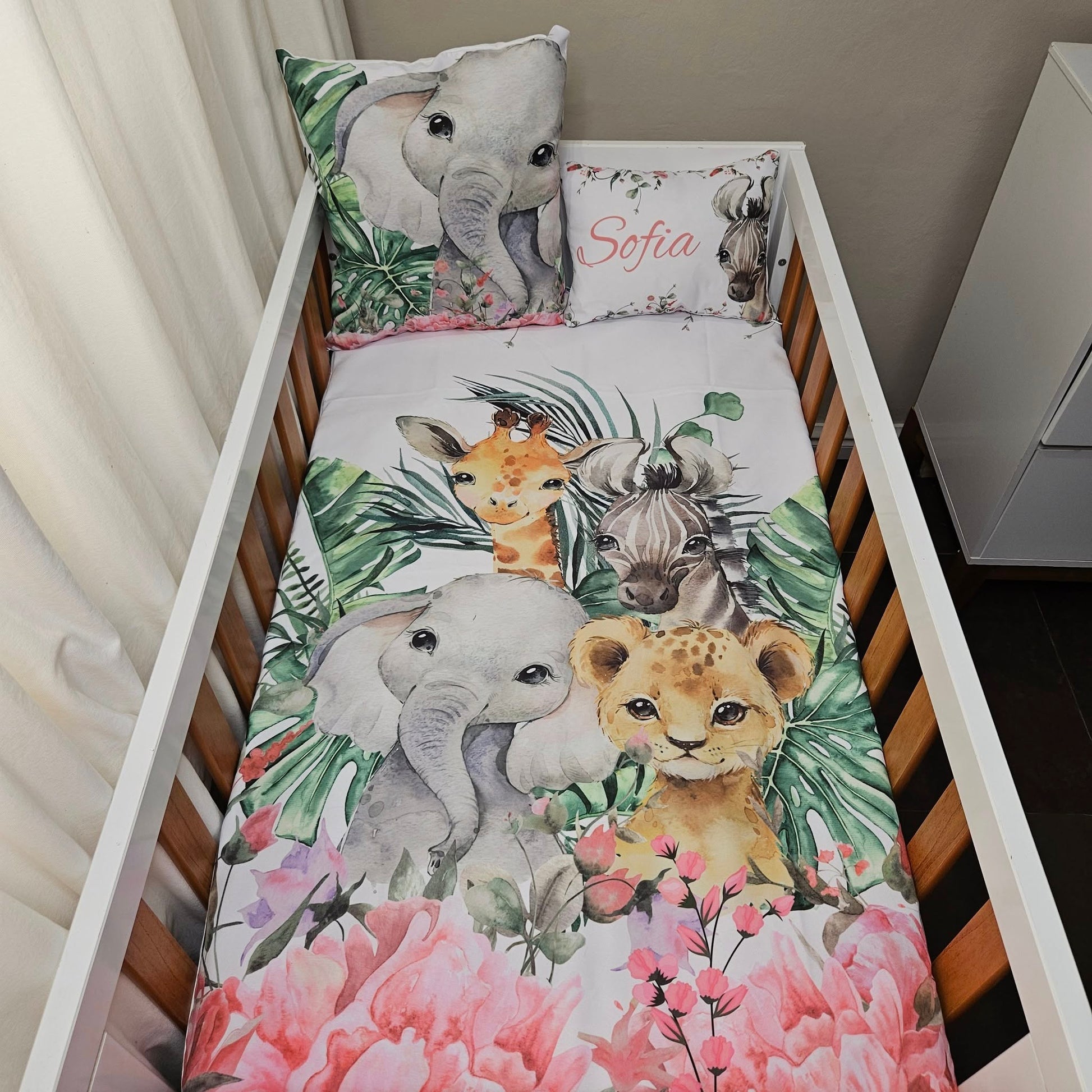 Duvet cover & Inner, or Comforter, Baby Pillow & Inner, Scatter & Inner, Printed Towel set (5 piece), Printed Swaddle Blanket or Fleece, 3 m Bumper and a Fitted Sheet to fit cot