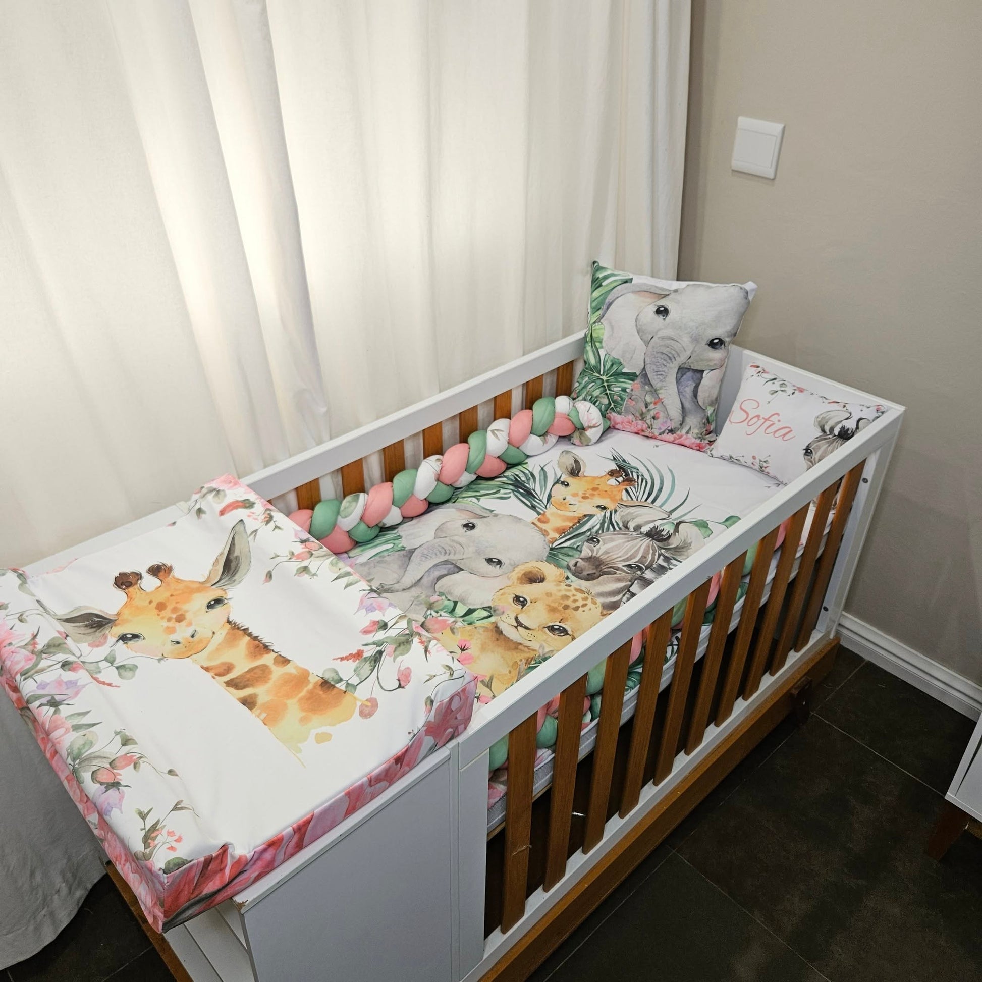 Duvet cover & Inner, or Comforter, Baby Pillow & Inner, Scatter & Inner, Waterproof Changing Mat Cover & Changing Mat Inner, 3 M Bumper and a Fitted sheet to fit cot