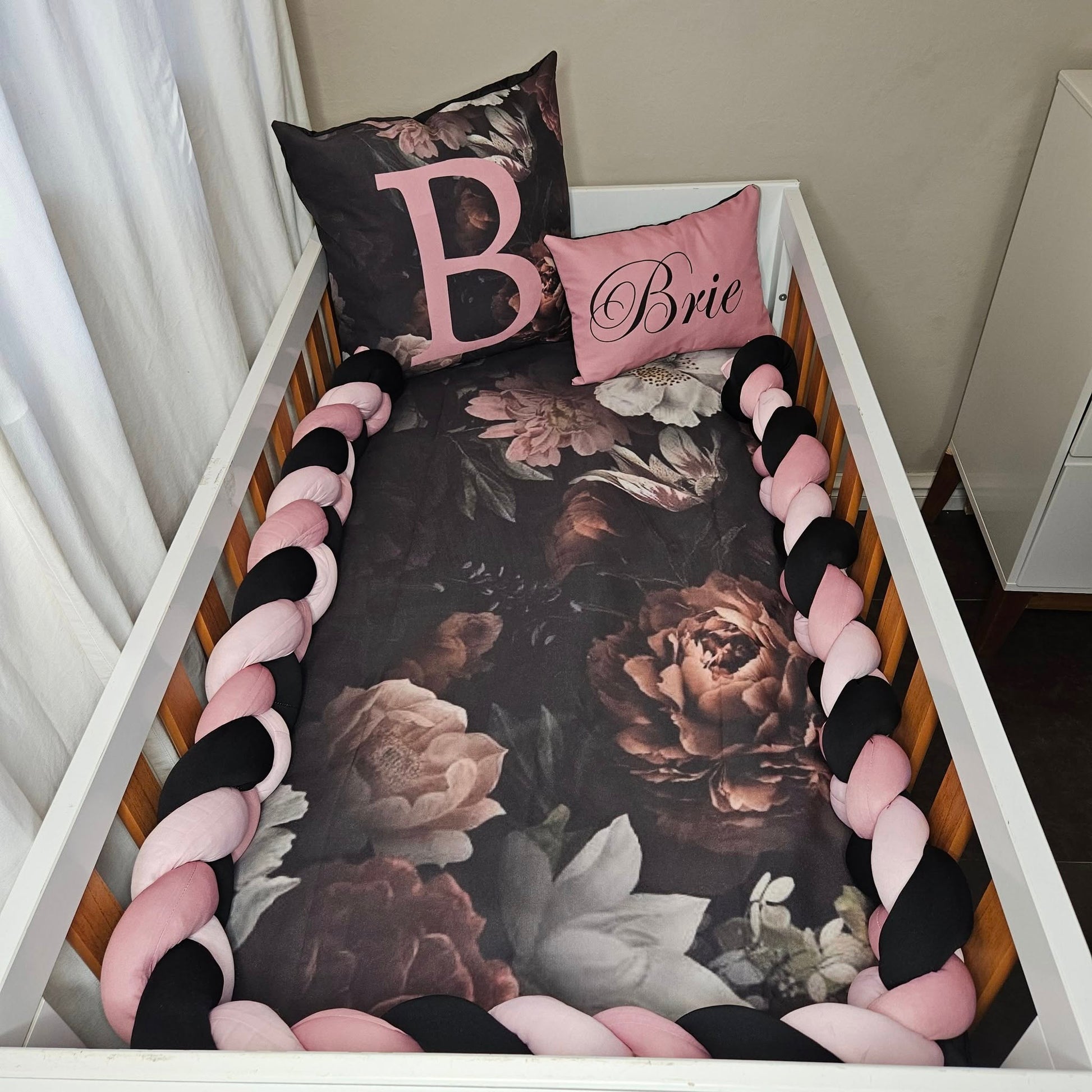 It's new, unique and a different setting from the usual nursery sets. It's timeless and sophisticated and has an overall different beauty that makes it stand out from the crowd.Colors of soft baby pink, mauve and black with a variety of florals.For all your custom Nursery Sets and so much more contact us today!