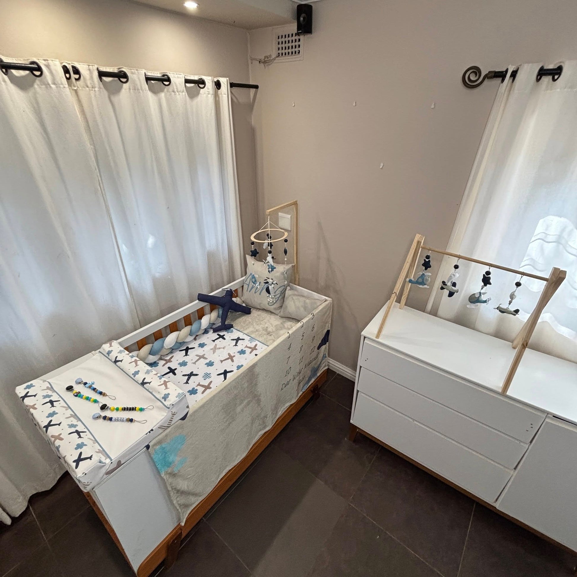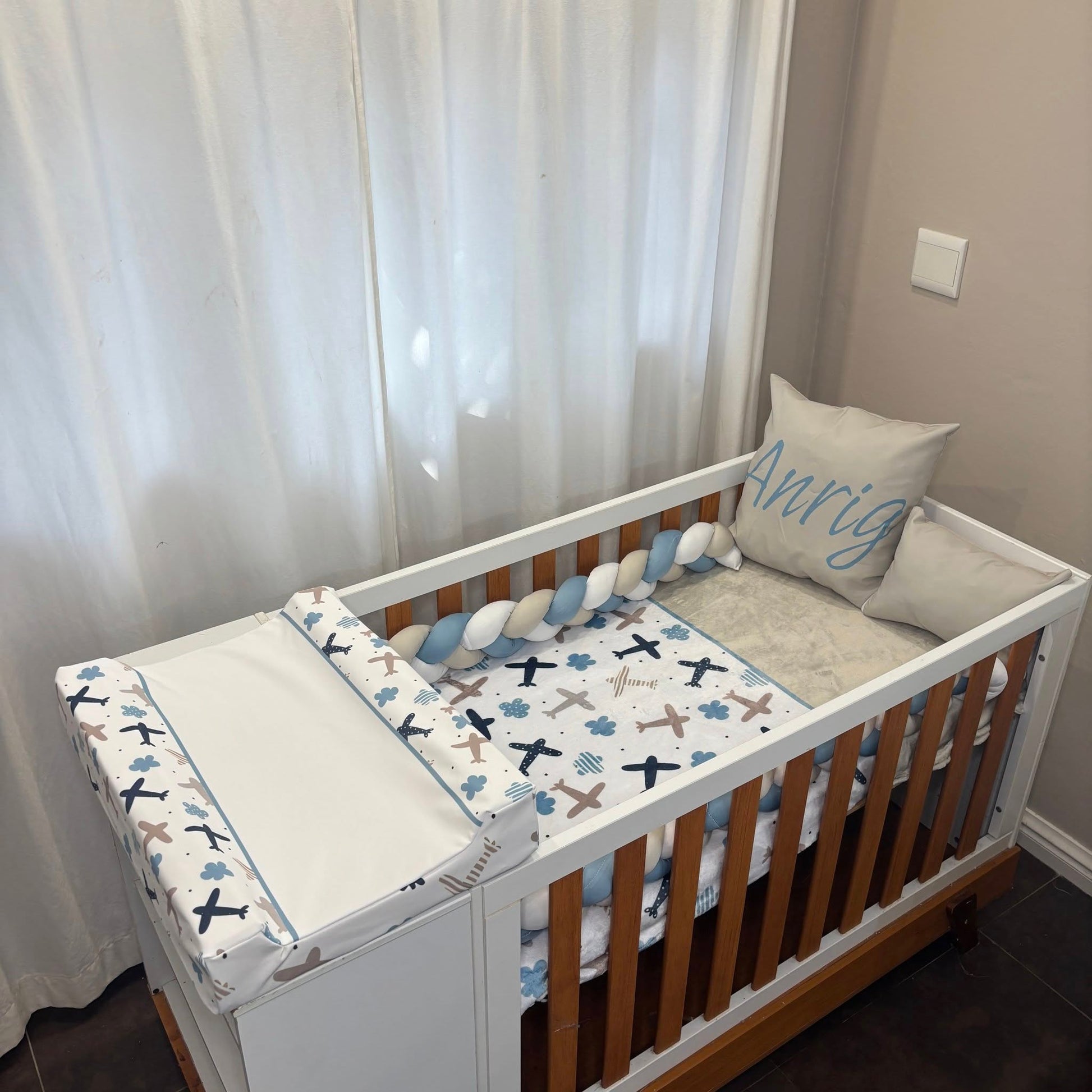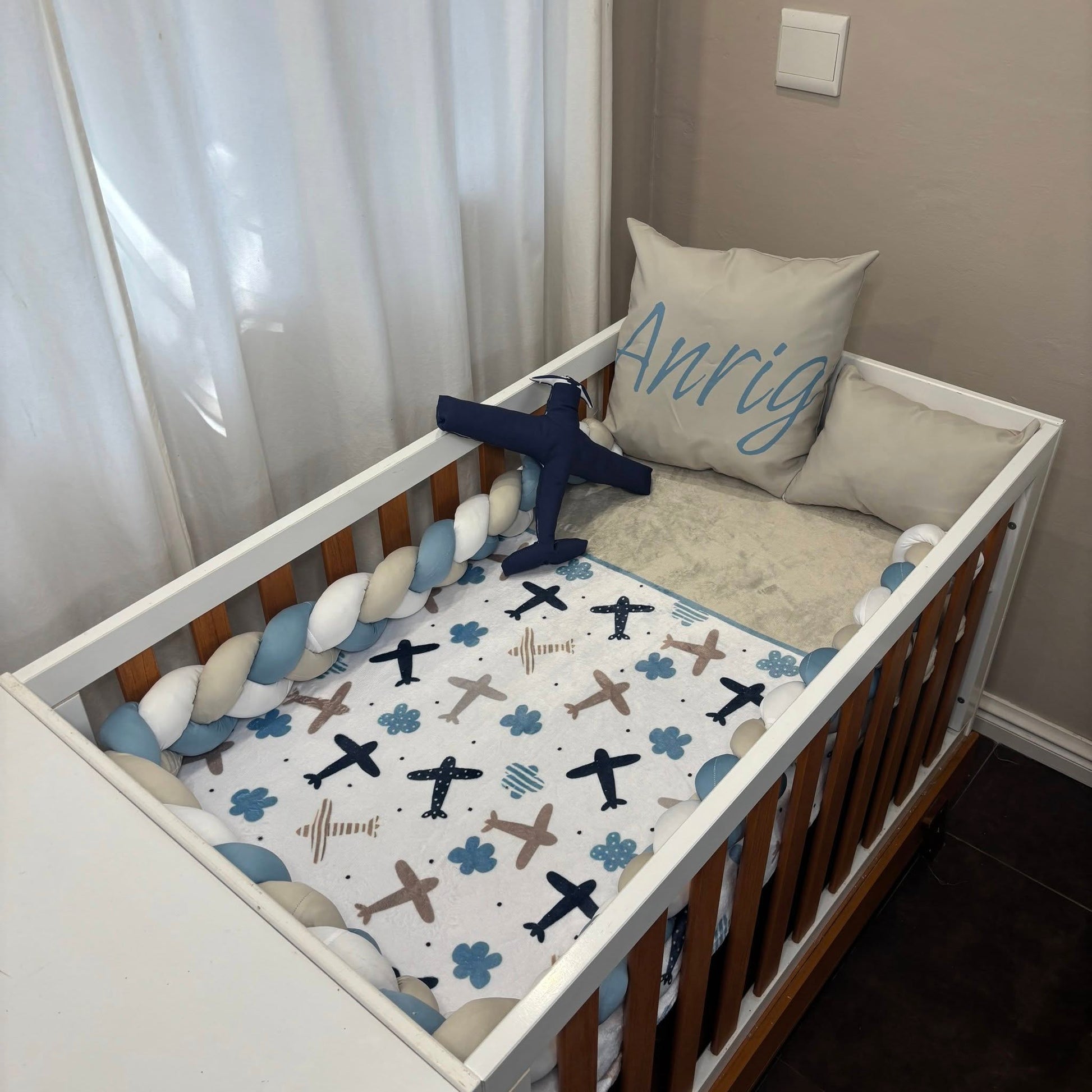 Duvet cover & Inner, or Comforter, Baby Pillow & Inner, Scatter & Inner, Waterproof Changing Mat Cover & Changing Mat Inner, 3 M Bumper and a Fitted sheet to fit cot