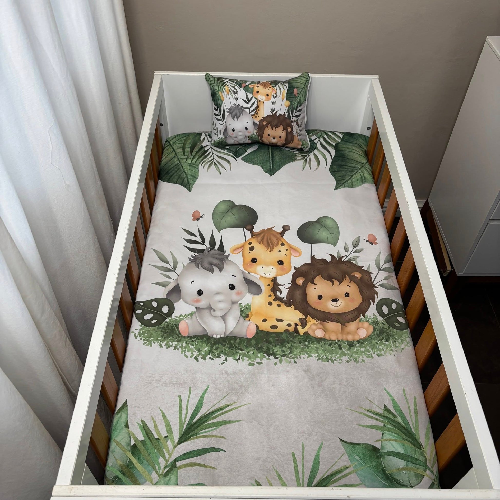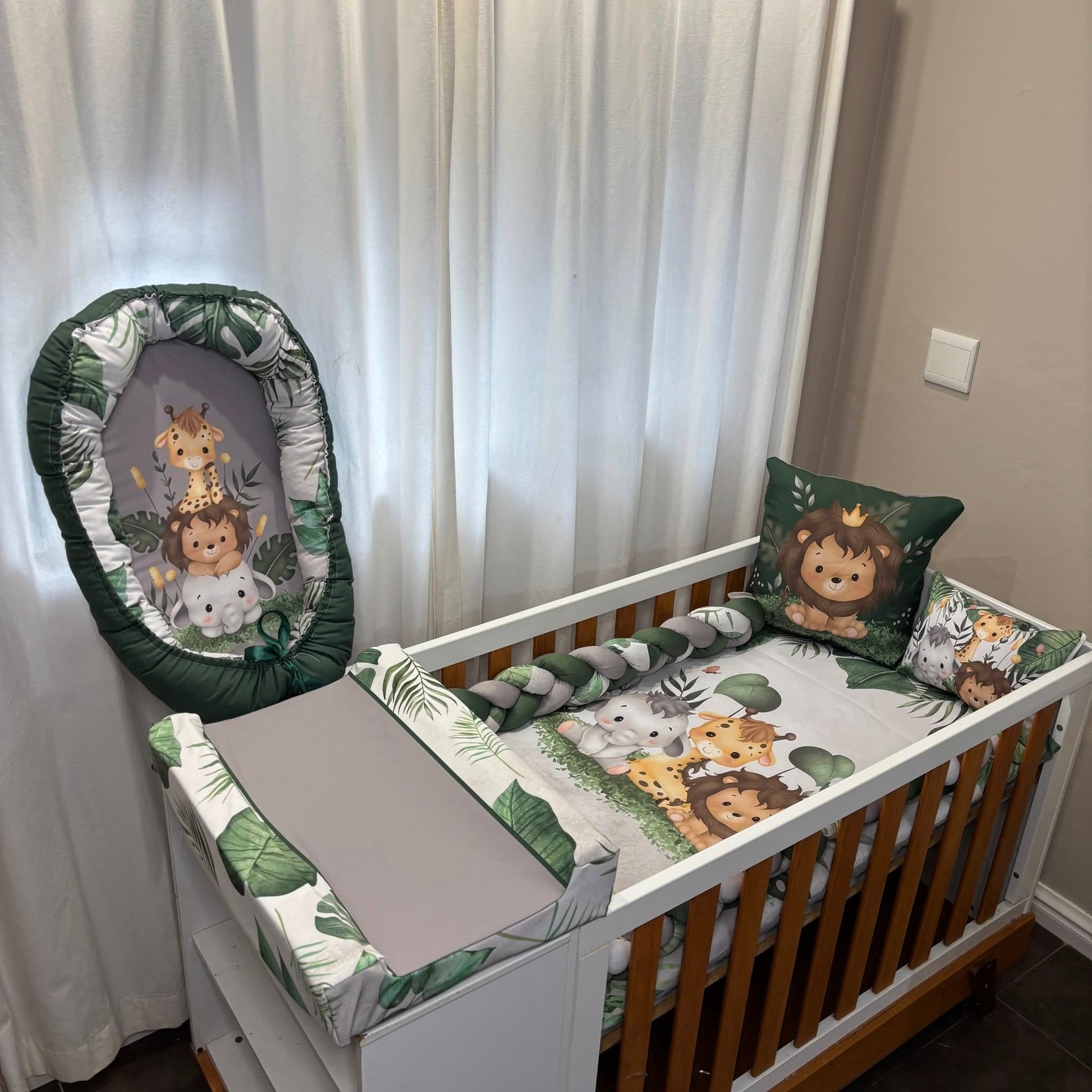 It's new, playful and just super beautiful and cute! These cute safari babies brings a whole lot of character and joy to the nursery.Colors of dark green, grey and white with some vibey leaves sets the perfect tone to compliment the safari theme and still keeping a natural touch.For all your custom Nursery Sets and so much more contact us today!