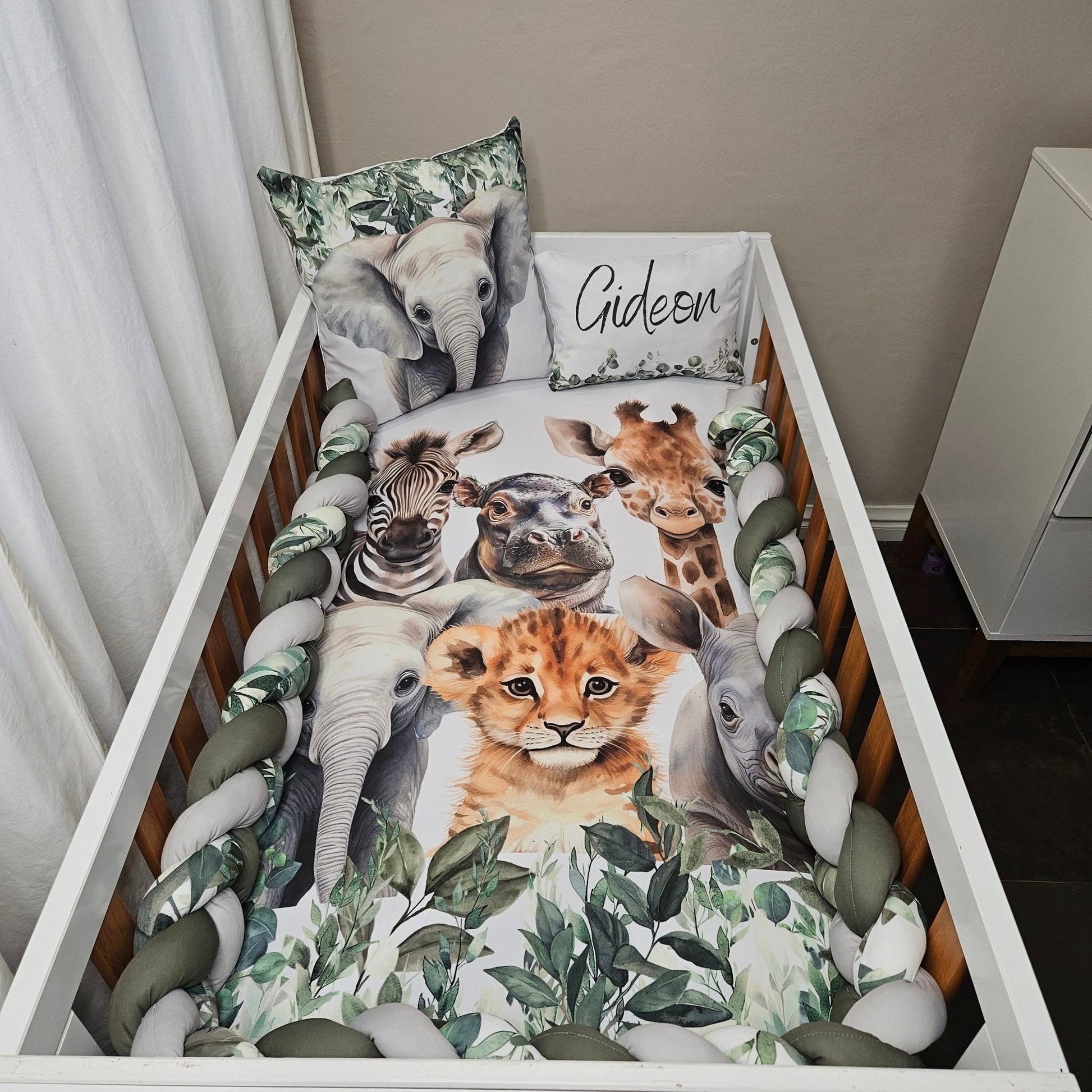 It's like the name says, the ultimate safari set that has ample greenery. The most beautiful leaves that are intricately detailed with the most beautiful safari animals.All set on a clean white background to bring all the elements out together. Colors of dark olive, grey and white in the bumper adds another layer to the natural feel of the set.